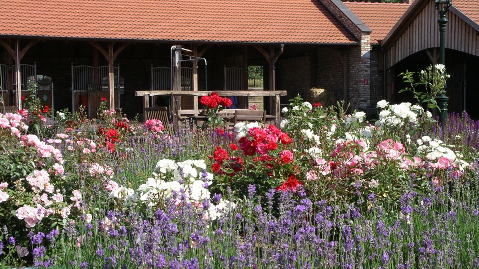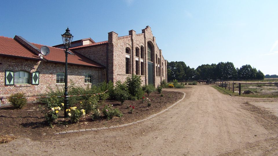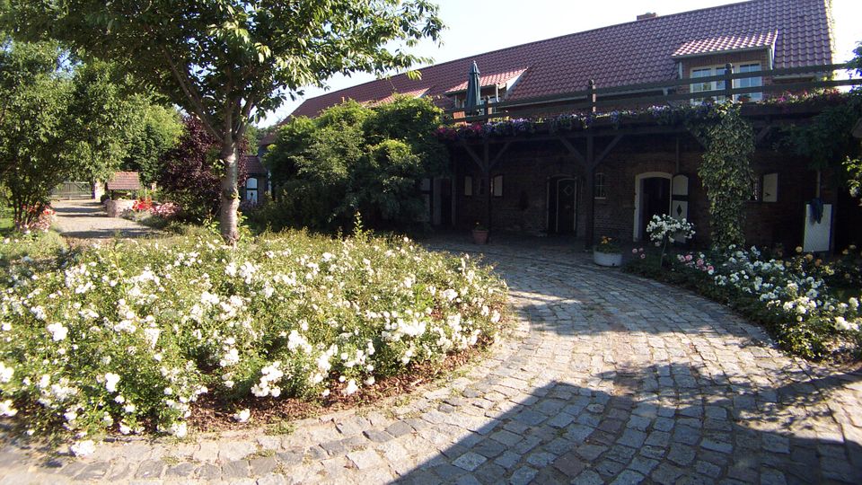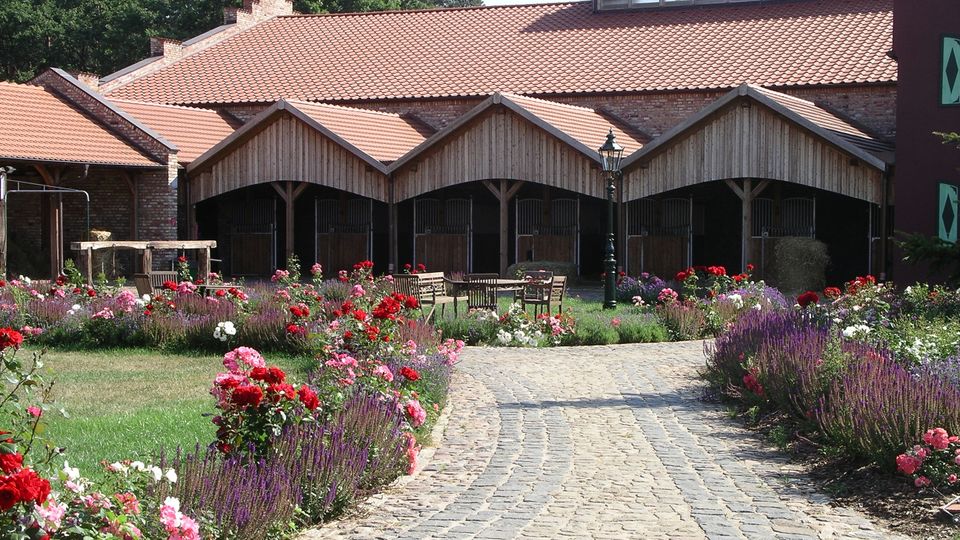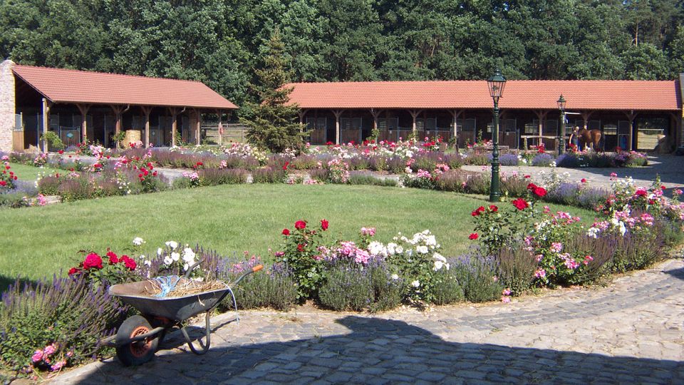 Zwei unmittelbar nebeneinanderliegende Reiterhöfe. In liebevoll sanierten Klinkergebäuden mit großer Reithalle. Rosencarree ist ein Vierseitenhof, Rosenhof ein Hof mit Pferdeställen und Wohnhaus / Landhaus. Beide Höfe zieren im Sommer blühende Rosenstöcke. Ein Round Pen gehört ebenso zum Hof wie ein Putzplatz, großzügige Pferdekoppeln und ein Reitplatz. Beide Höfe zusammen beherbergen ca. 100 Sport- und Zuchtpferde. Höfe und Besitzerin haben Erfahrung mit Dreharbeiten.