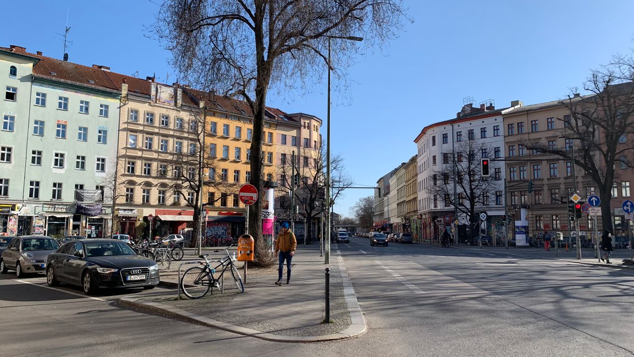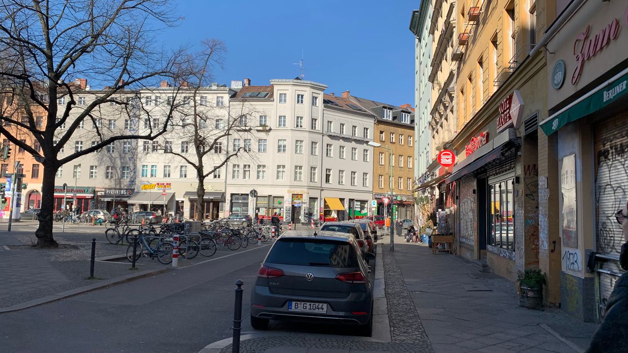Kleiner Platz an einer Straßenkreuzung mitten im Kreuzberger Szeneviertel, viele Kneipen mit jungem Publikum, viele türkische Läden und Cafés