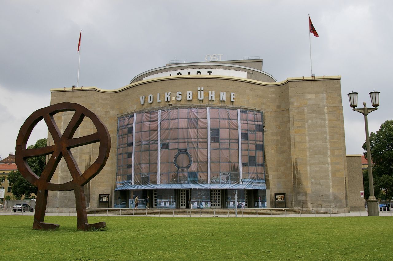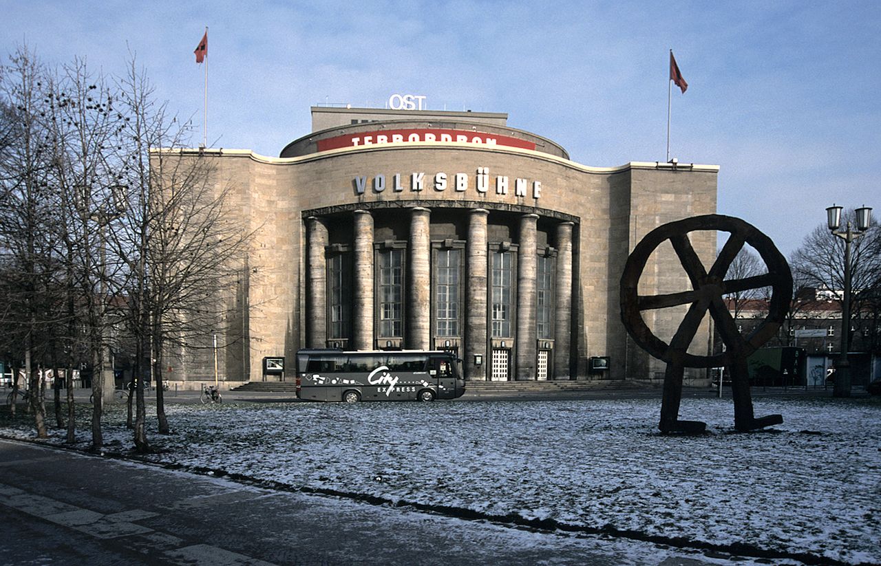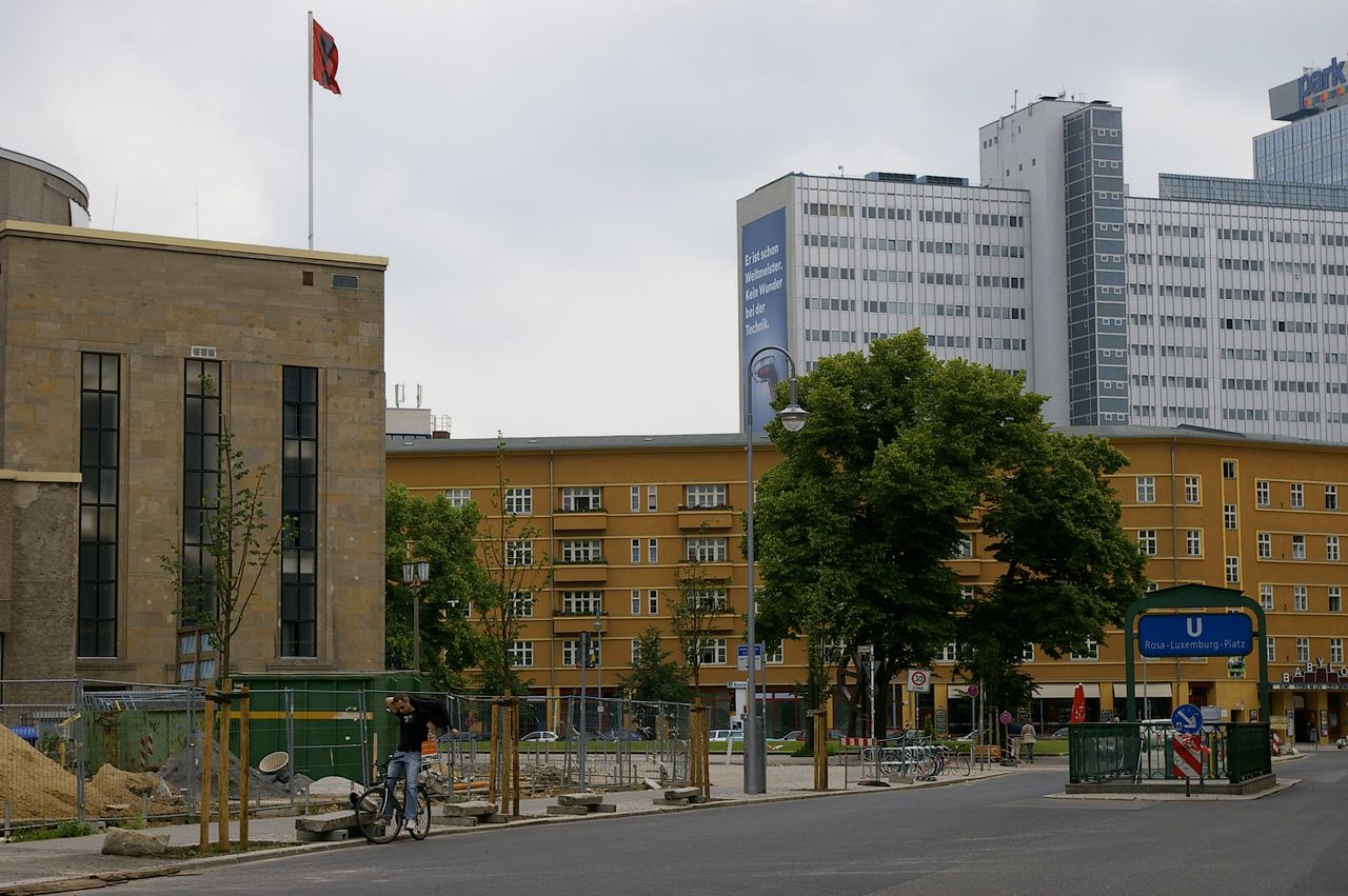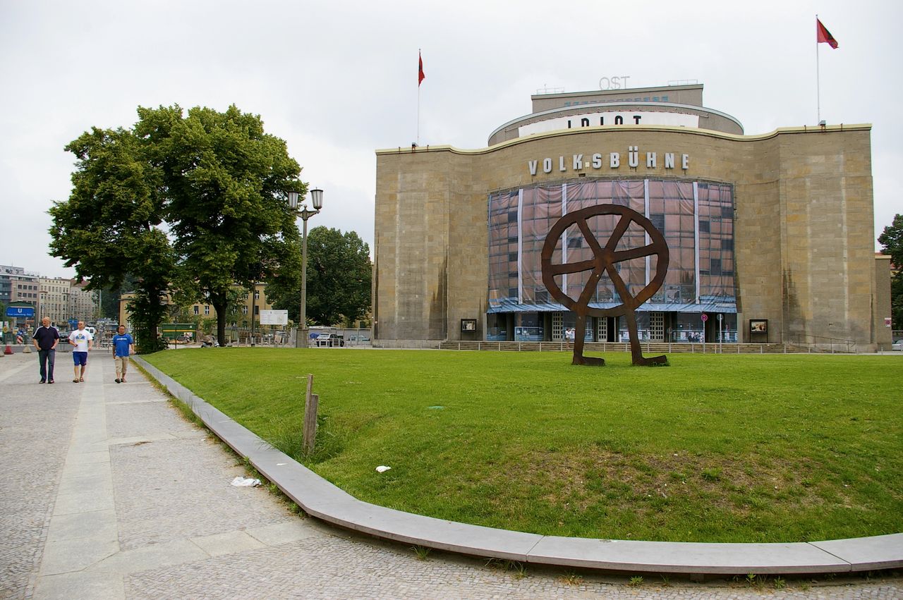 Platz umgeben von Wohnhäusern (Gründerzeit/DDR Neuzeit) und stark befahrenen Straßen. Mitten auf dem Platz steht das Theater der freien Volksbühne (monumentale Fassade, die in der Mitte wuchtig vorschwingt und mit Säulen Feierlichkeit signalisiert) .
