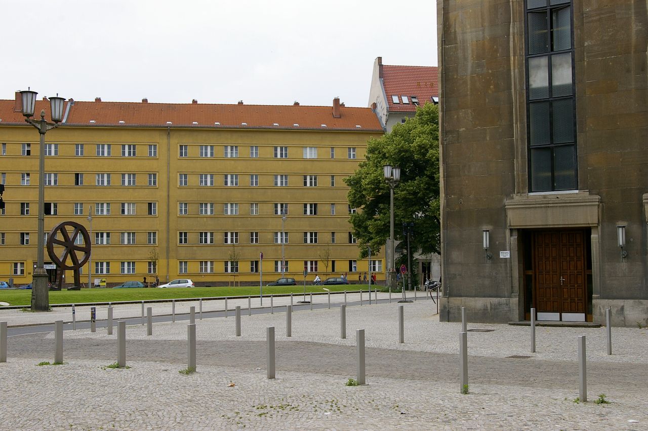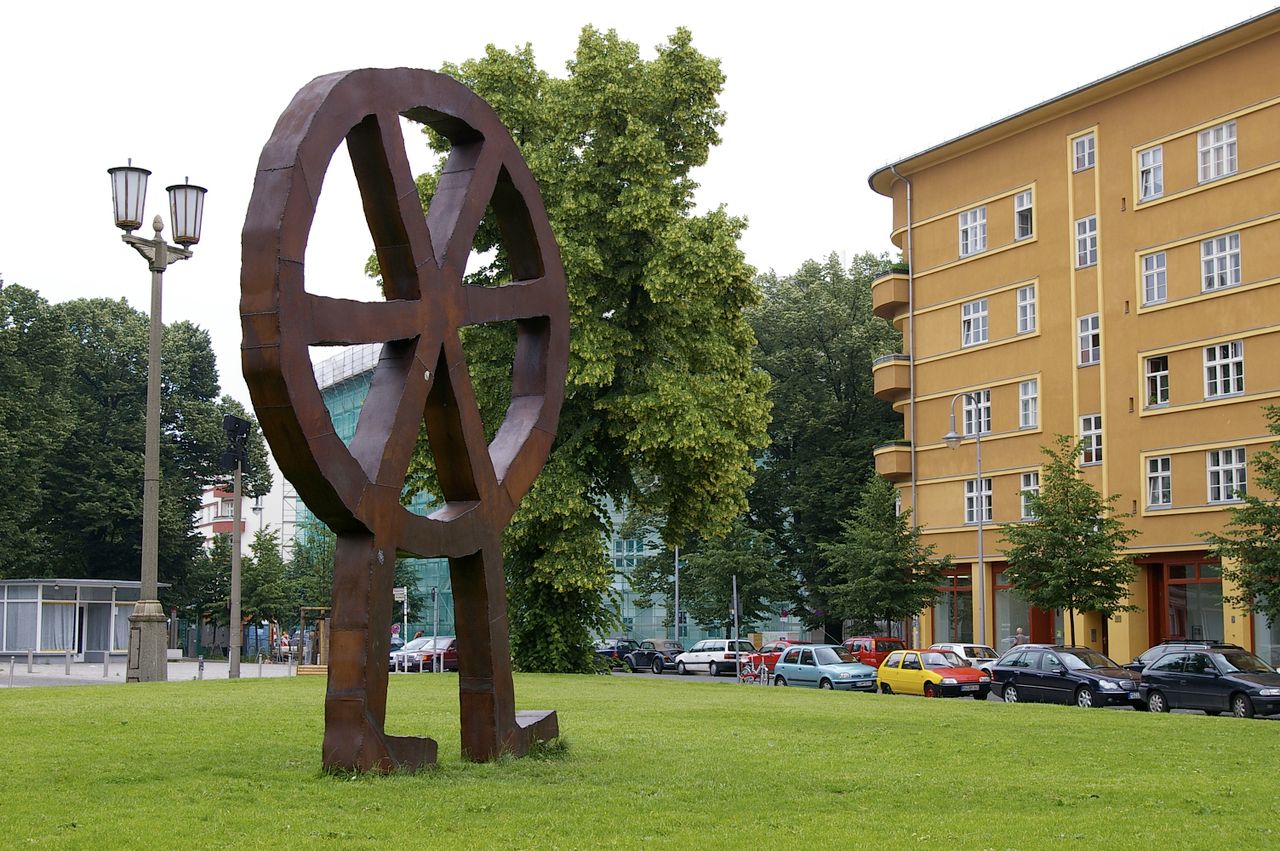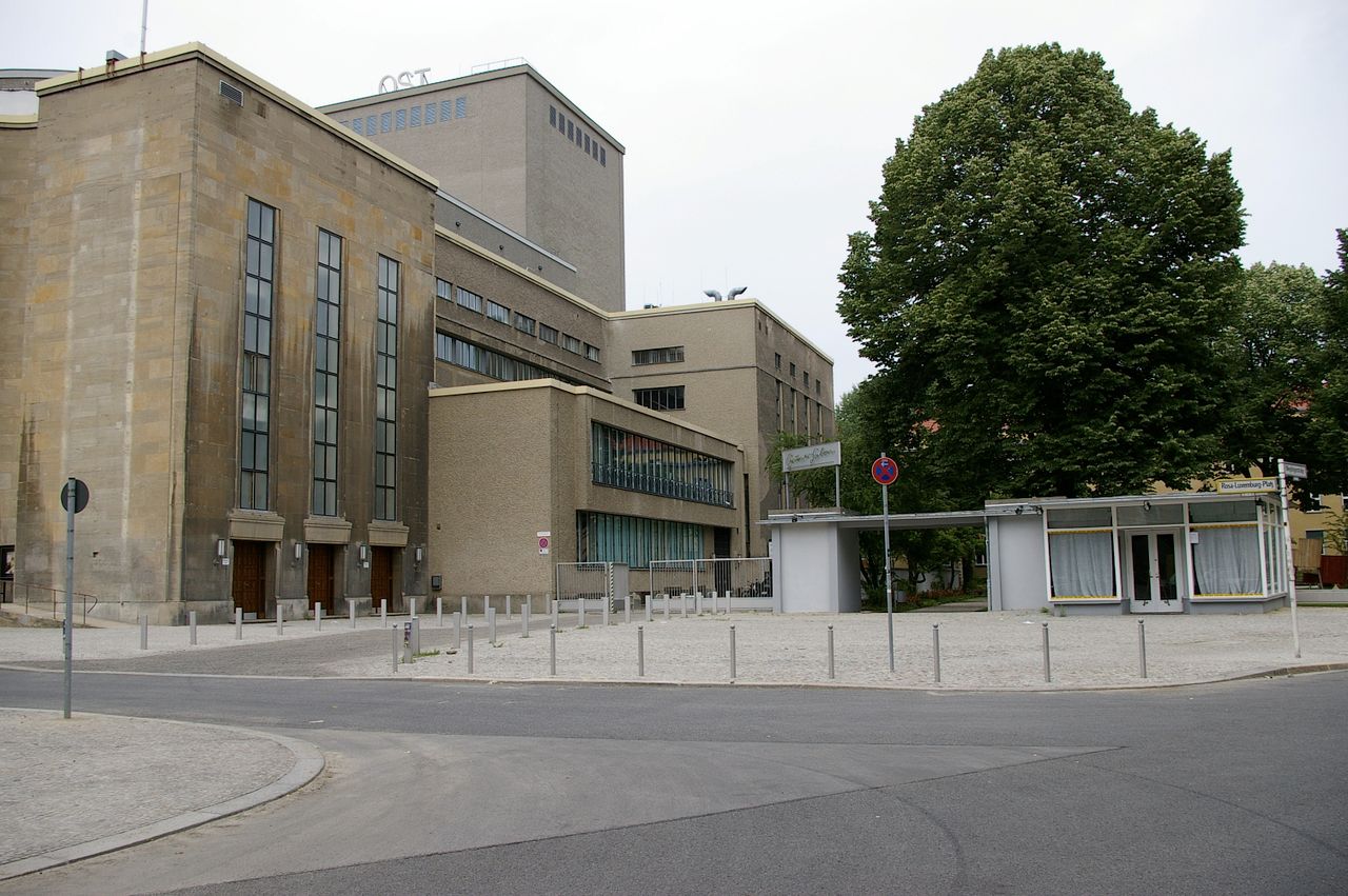 Platz umgeben von Wohnhäusern (Gründerzeit/DDR Neuzeit) und stark befahrenen Straßen. Mitten auf dem Platz steht das Theater der freien Volksbühne (monumentale Fassade, die in der Mitte wuchtig vorschwingt und mit Säulen Feierlichkeit signalisiert) .