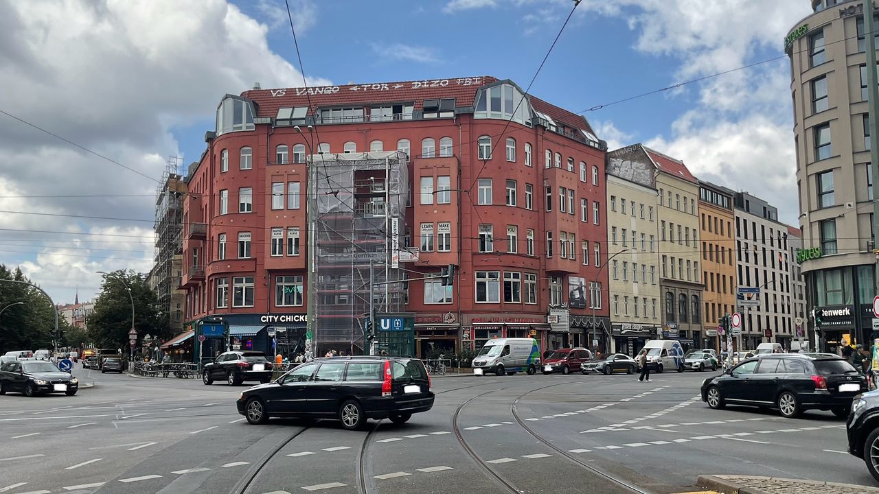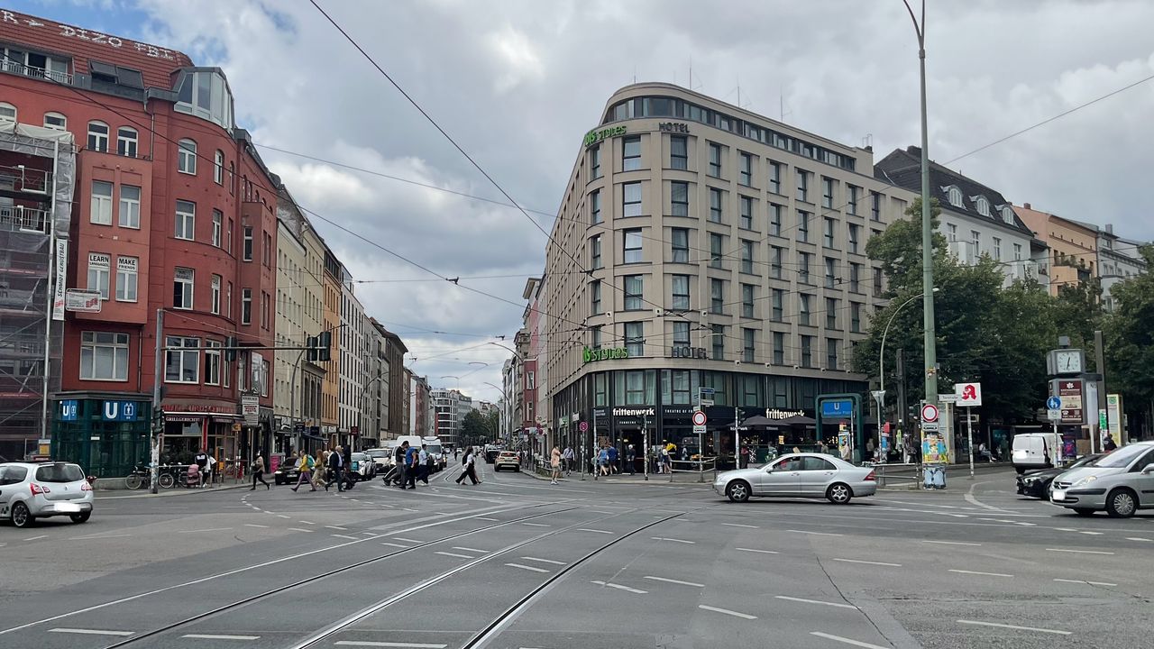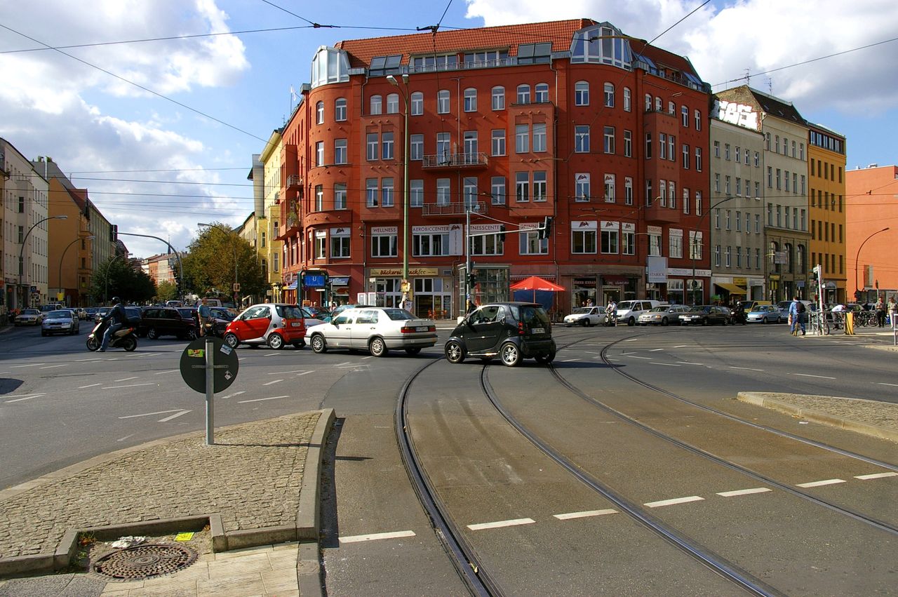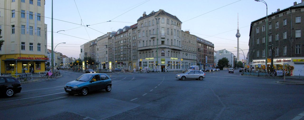 Verkehrsreiche Straßenkreuzung, verschiedene Baustile, Wohn- und Geschäftshäuser