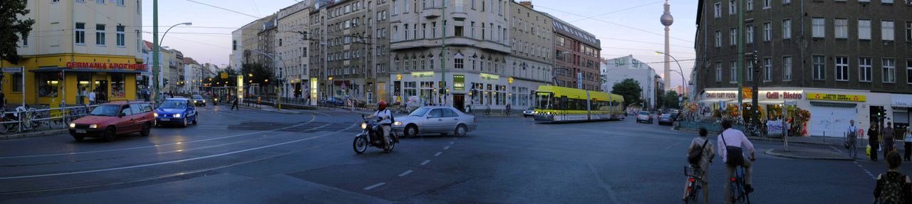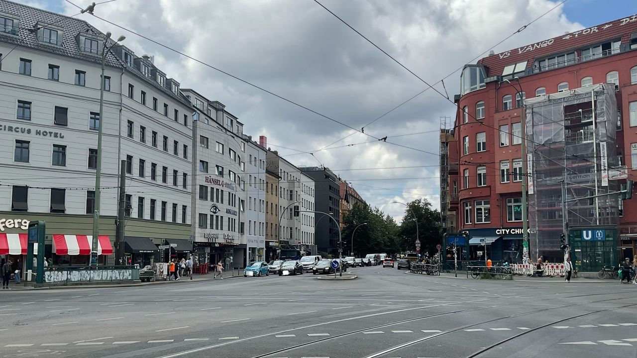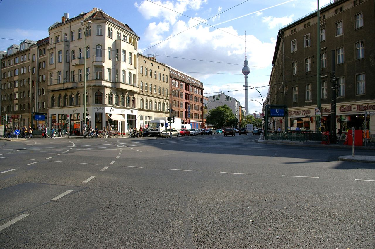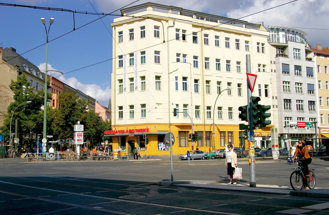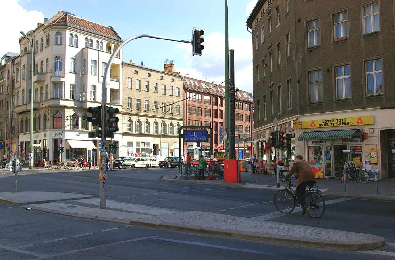 Verkehrsreiche Straßenkreuzung, verschiedene Baustile, Wohn- und Geschäftshäuser