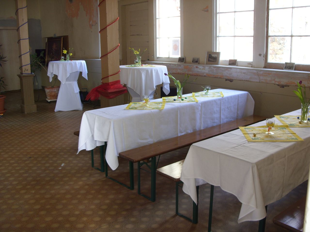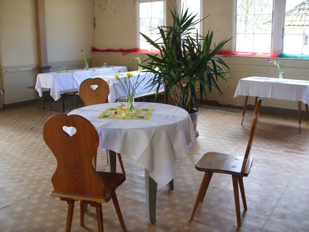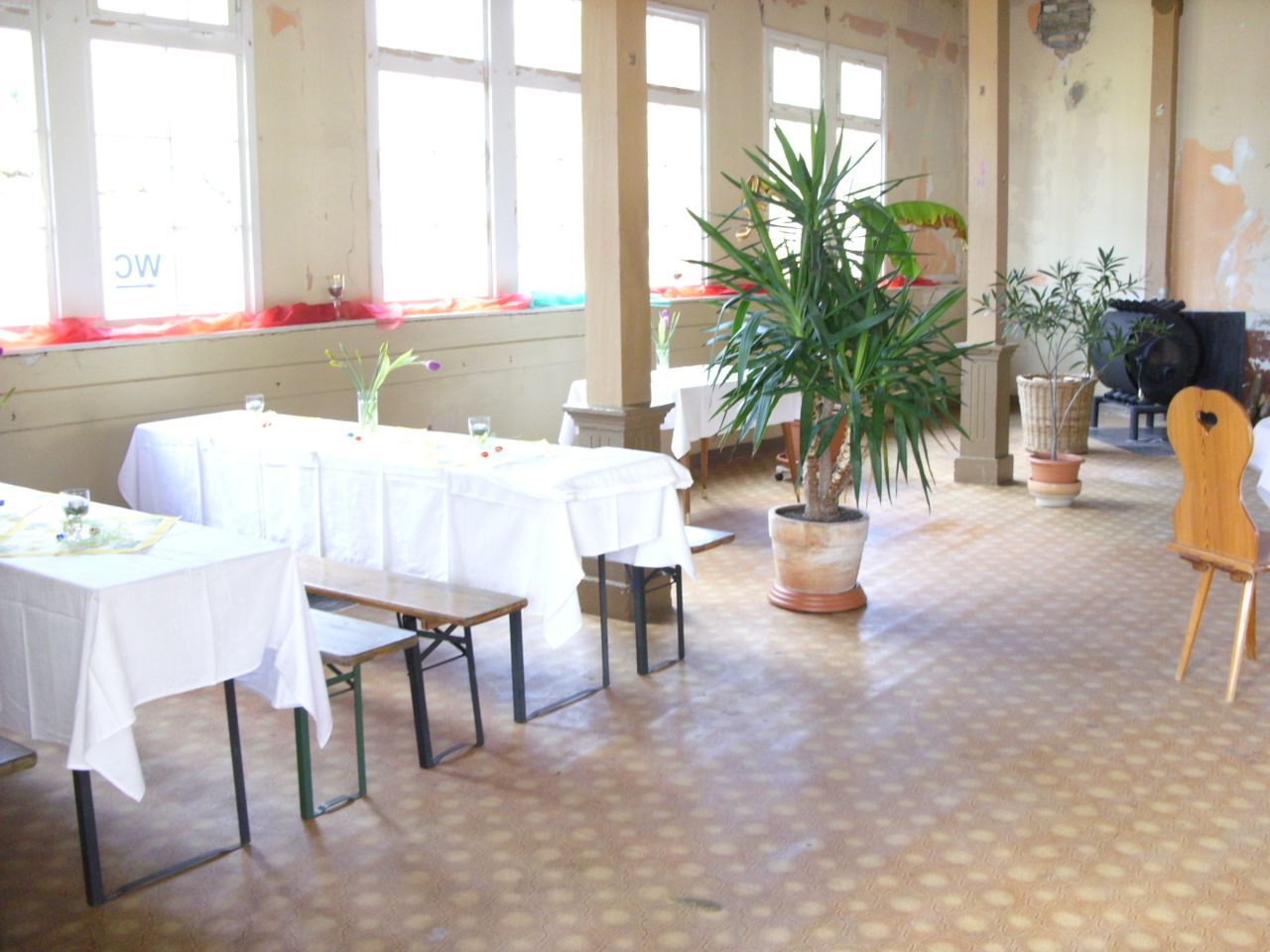 Der Saal ist unsaniert mit Deckengewölbe. Der Bodenbelag hat DDR-Charme der 70er Jahre. Darunter befinden sich Dielen. Die Ausstattung kann den jeweiligen Anforderungen angepaßt werden.