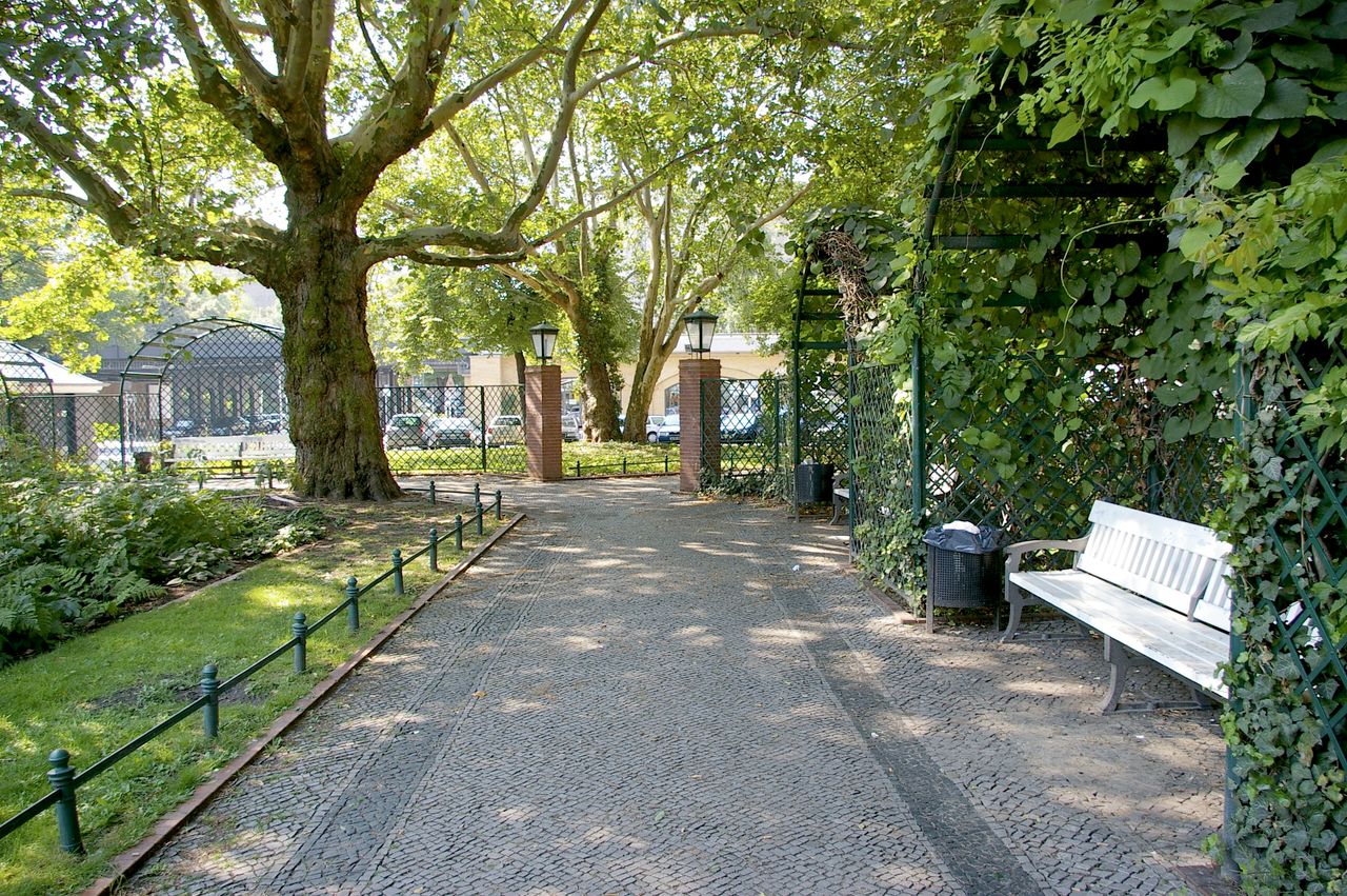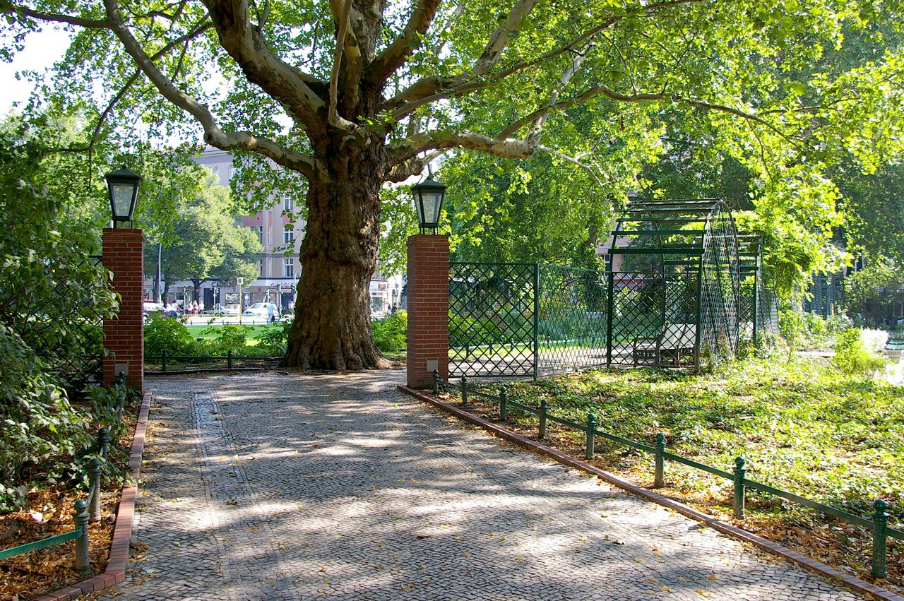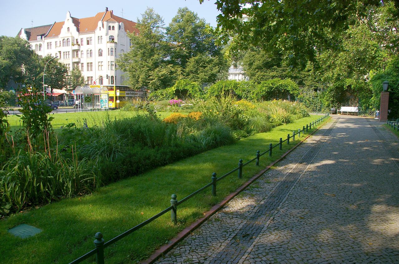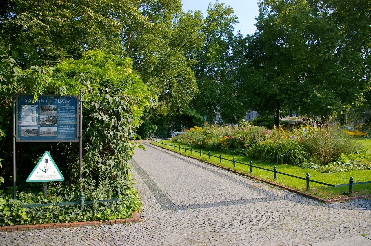 Der Savignyplatz, der nach dem preußischen Minister und Juristen Friedrich Carl von Savigny (1779-1861) benannt wurde, entstand Ende des 19. Jahrhunderts inmitten eines gründerzeitlichen Wohnquartiers. Entsprechend den zeitgemäßen Vorstellungen wurde er als Rasenschmuckplatz mit geometrischem Grundriss und einer Fülle von Beeten mit Ziersträuchern angelegt. Durch die Kantstraße ist er traditionell in zwei Hälften geteilt. Der Charlottenburger Stadtgartendirektor Erwin Barth gestaltete den Platz 1926 in einen Garten- und Erholungsplatz um. Der Platz erhielt eine raumbildende und strukturierende Bepflanzung mit jahreszeitlich wechselnd blühenden Staudenrabatten und umrahmenden Sträuchern und Bäumen wie Platanen und Linden. Von den laubenartigen, mit Rankpflanzen besetzten Sitznischen aus kann man die Blütenpracht genießen. Der Savignyplatz ist heute umgeben von zahlreichen Geschäften, Restaurants und Cafés.