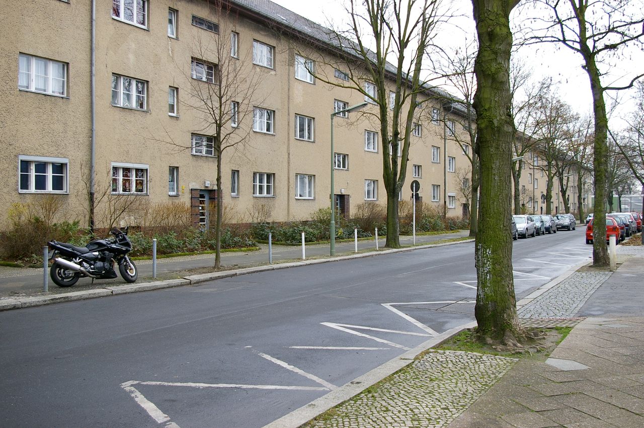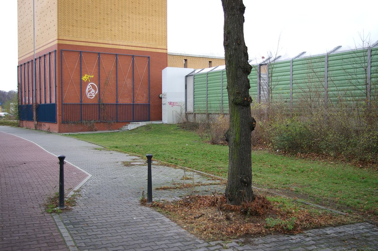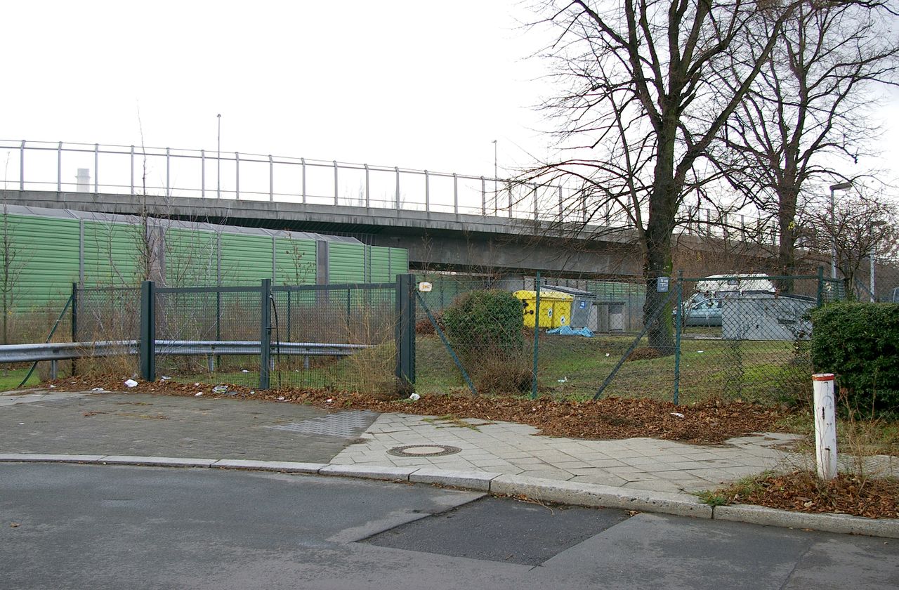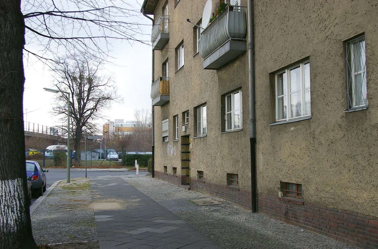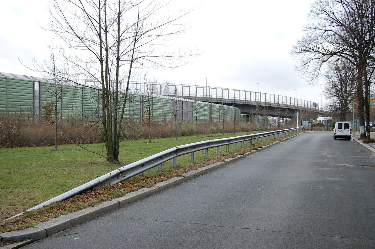 Wohnstraße in Berlin Tempelhof, direkt an der Autobahn mit tristen, kleinstädtisch anmutenden Wohnblöcken und Industriegebäuden.