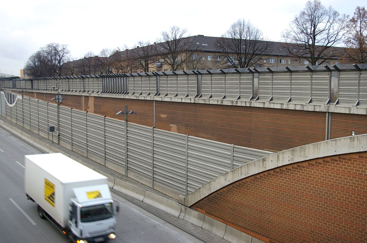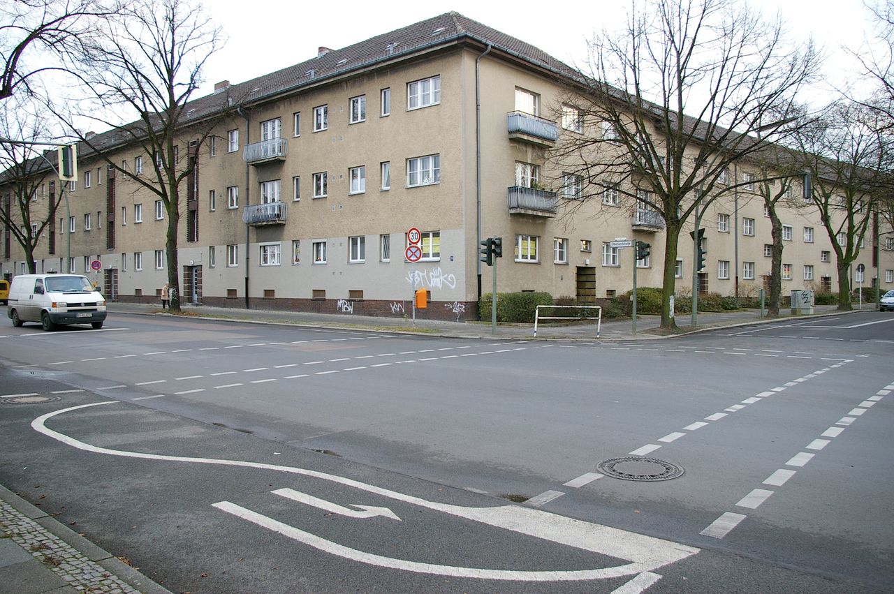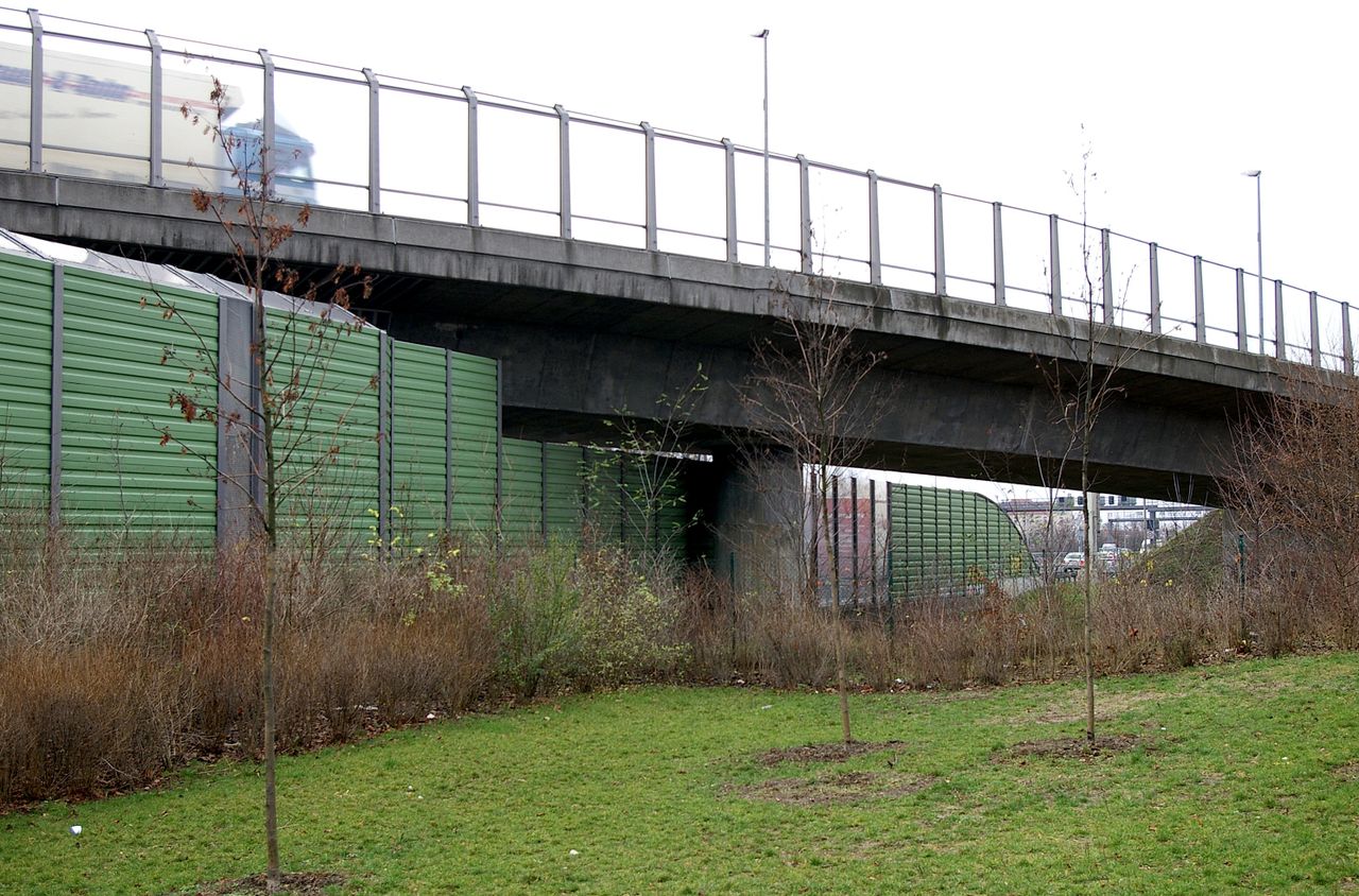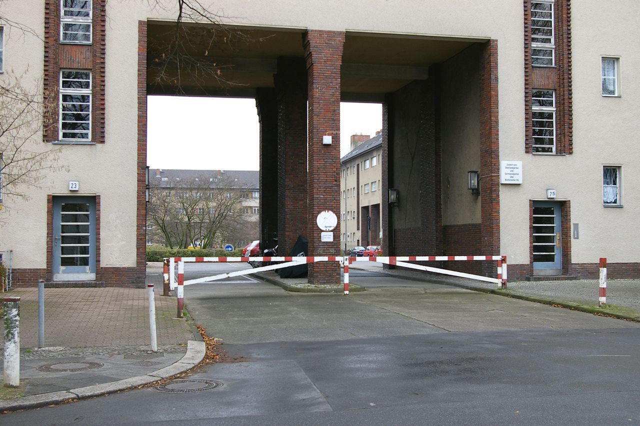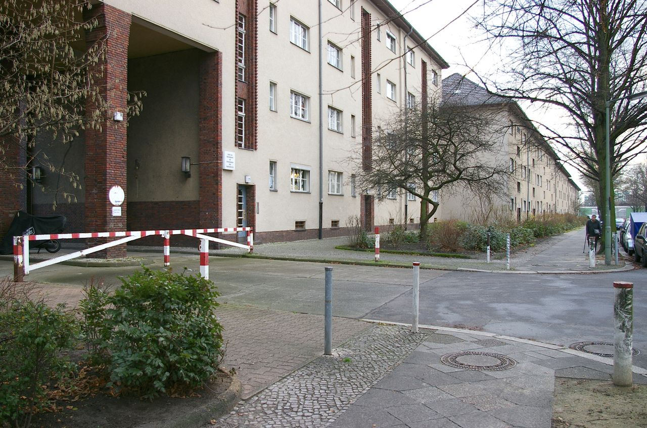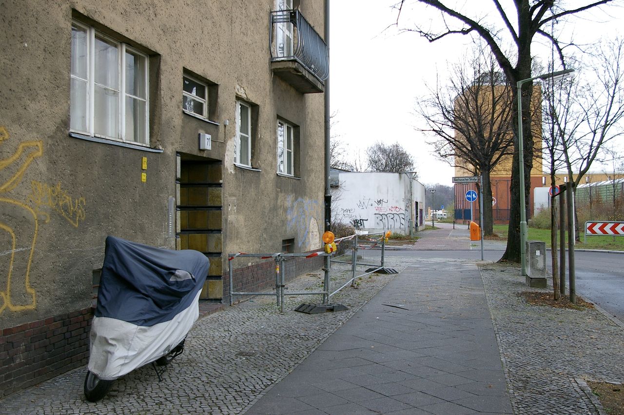 Wohnstraße in Berlin Tempelhof, direkt an der Autobahn mit tristen, kleinstädtisch anmutenden Wohnblöcken und Industriegebäuden.