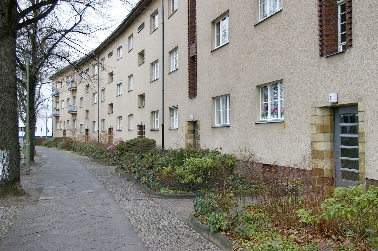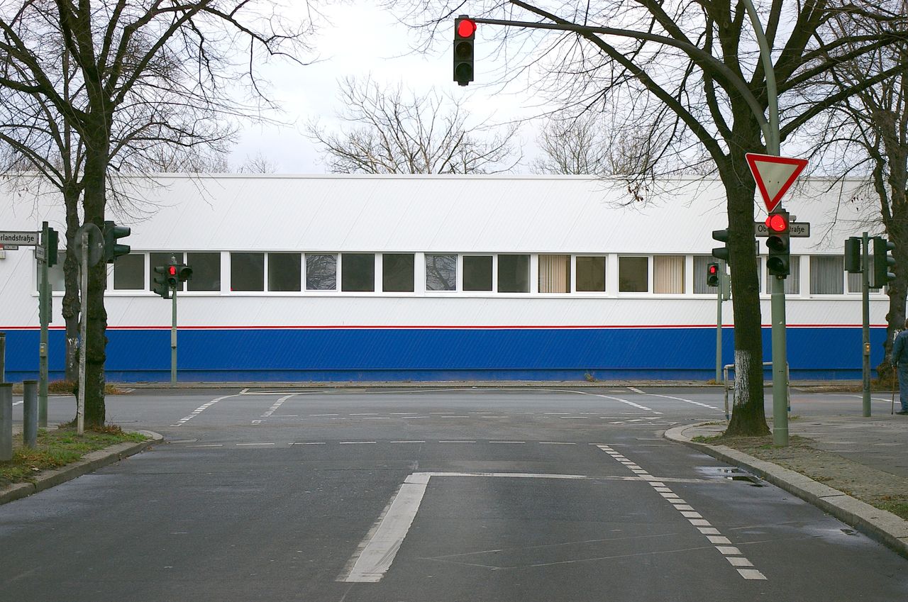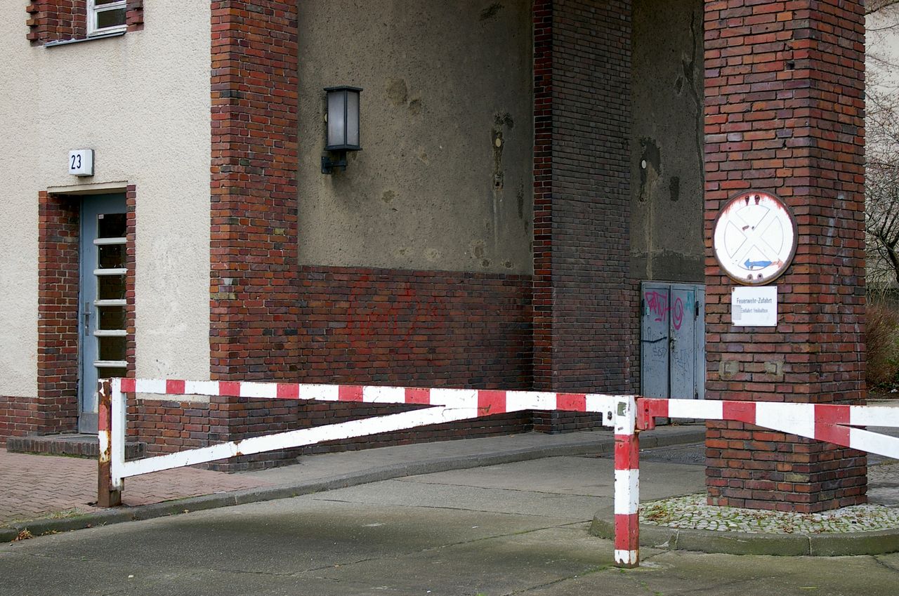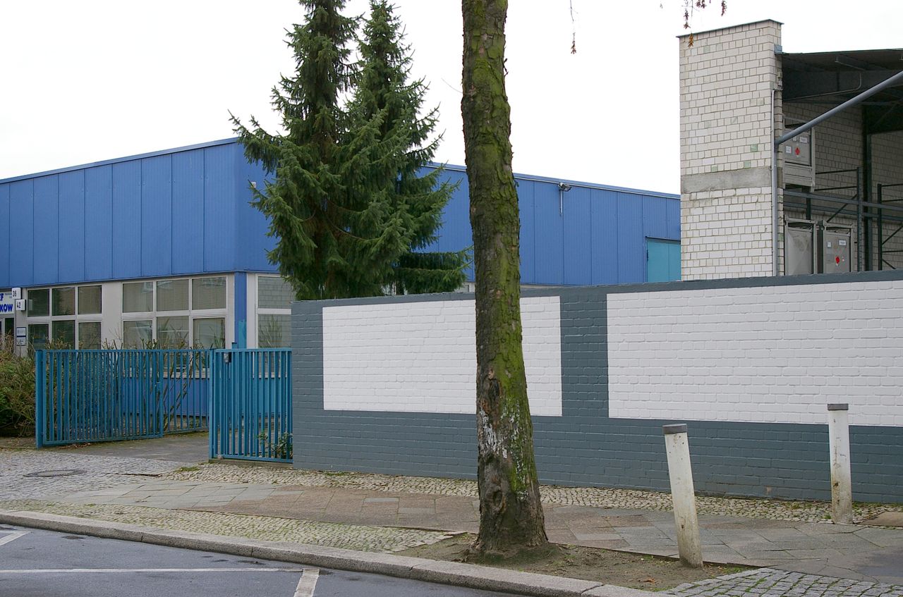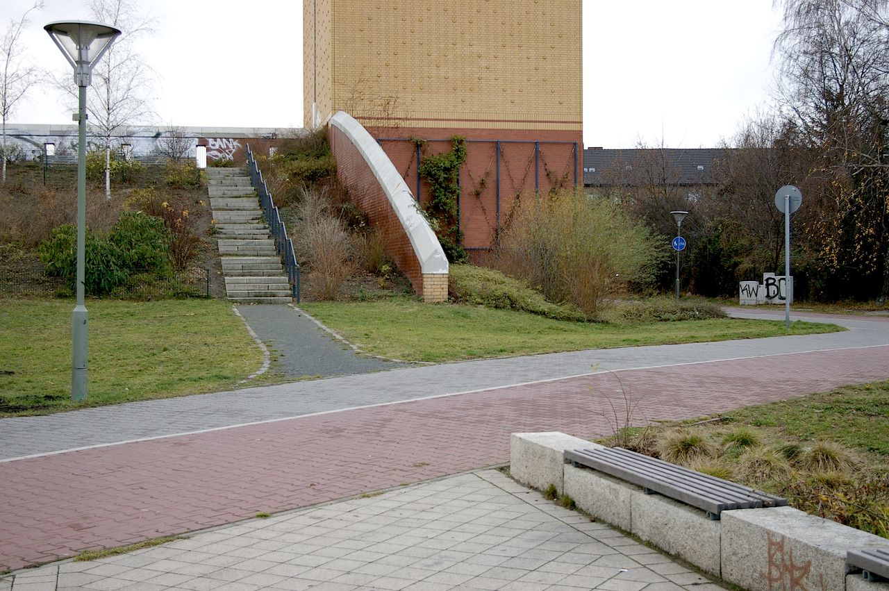 Wohnstraße in Berlin Tempelhof, direkt an der Autobahn mit tristen, kleinstädtisch anmutenden Wohnblöcken und Industriegebäuden.