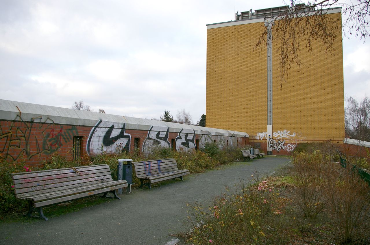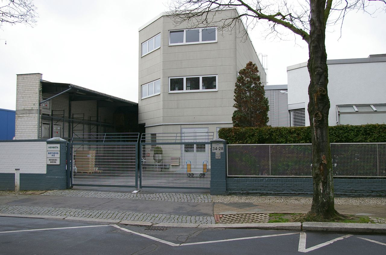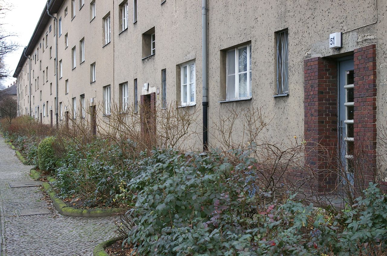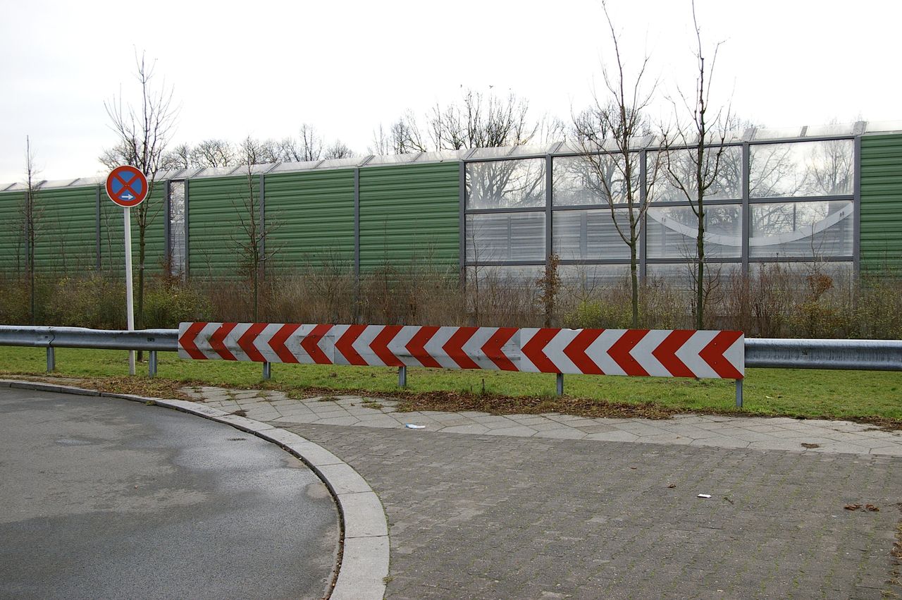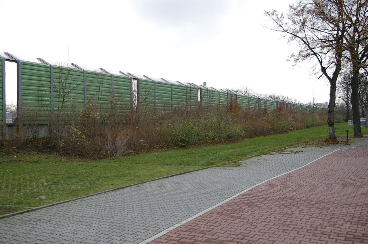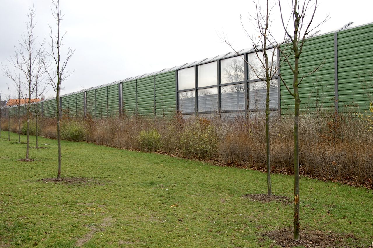 Wohnstraße in Berlin Tempelhof, direkt an der Autobahn mit tristen, kleinstädtisch anmutenden Wohnblöcken und Industriegebäuden.