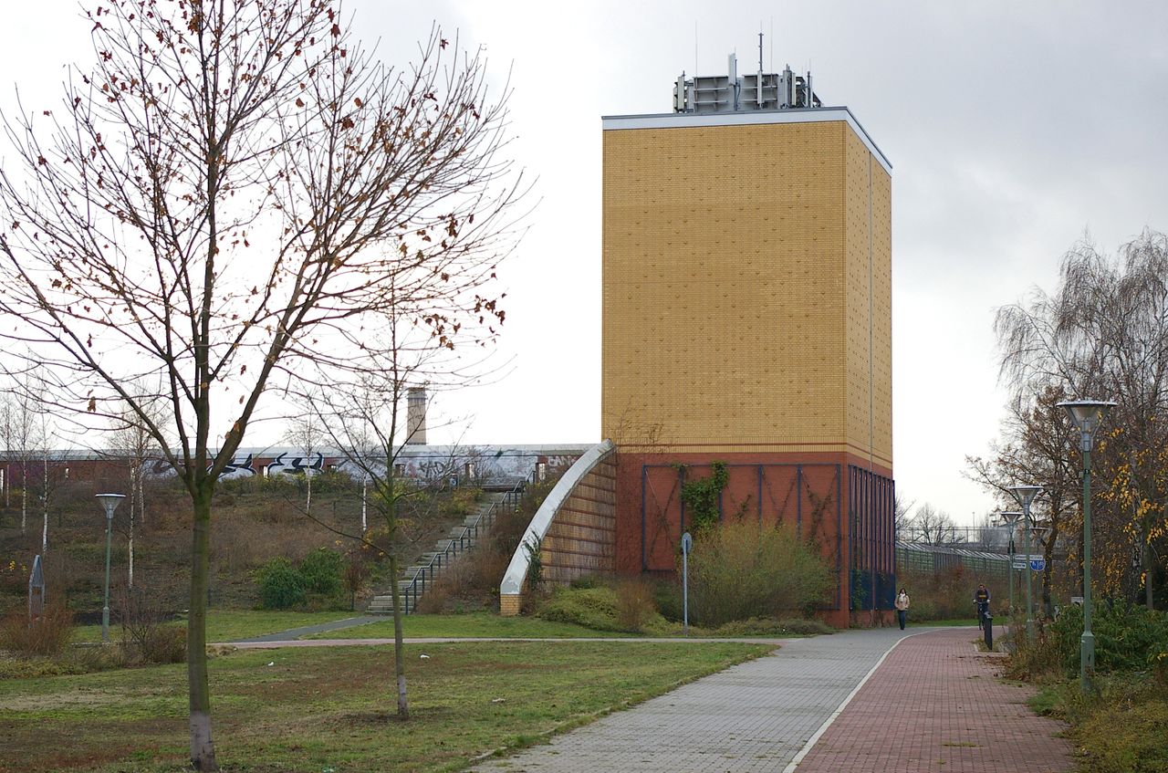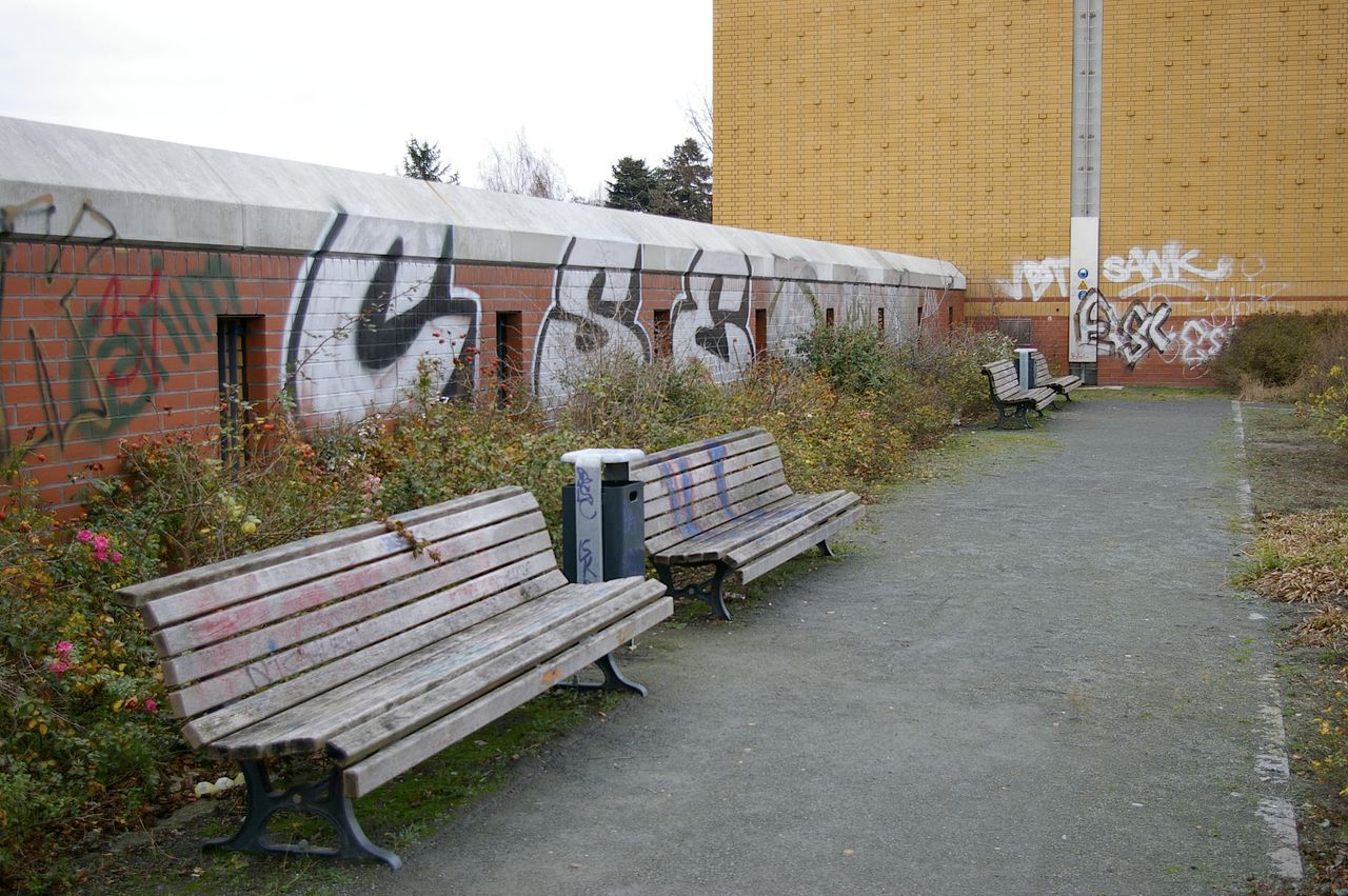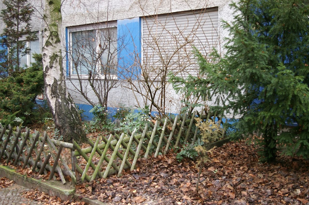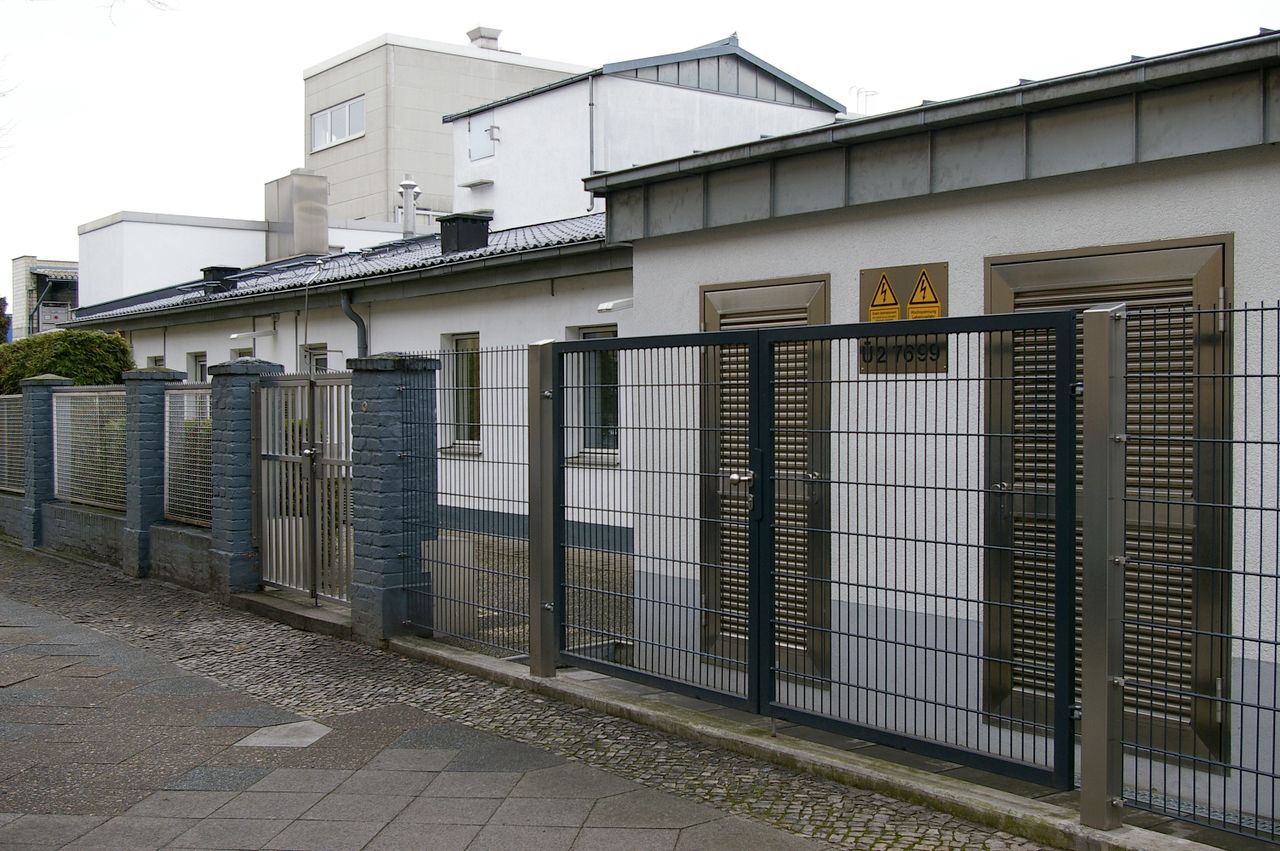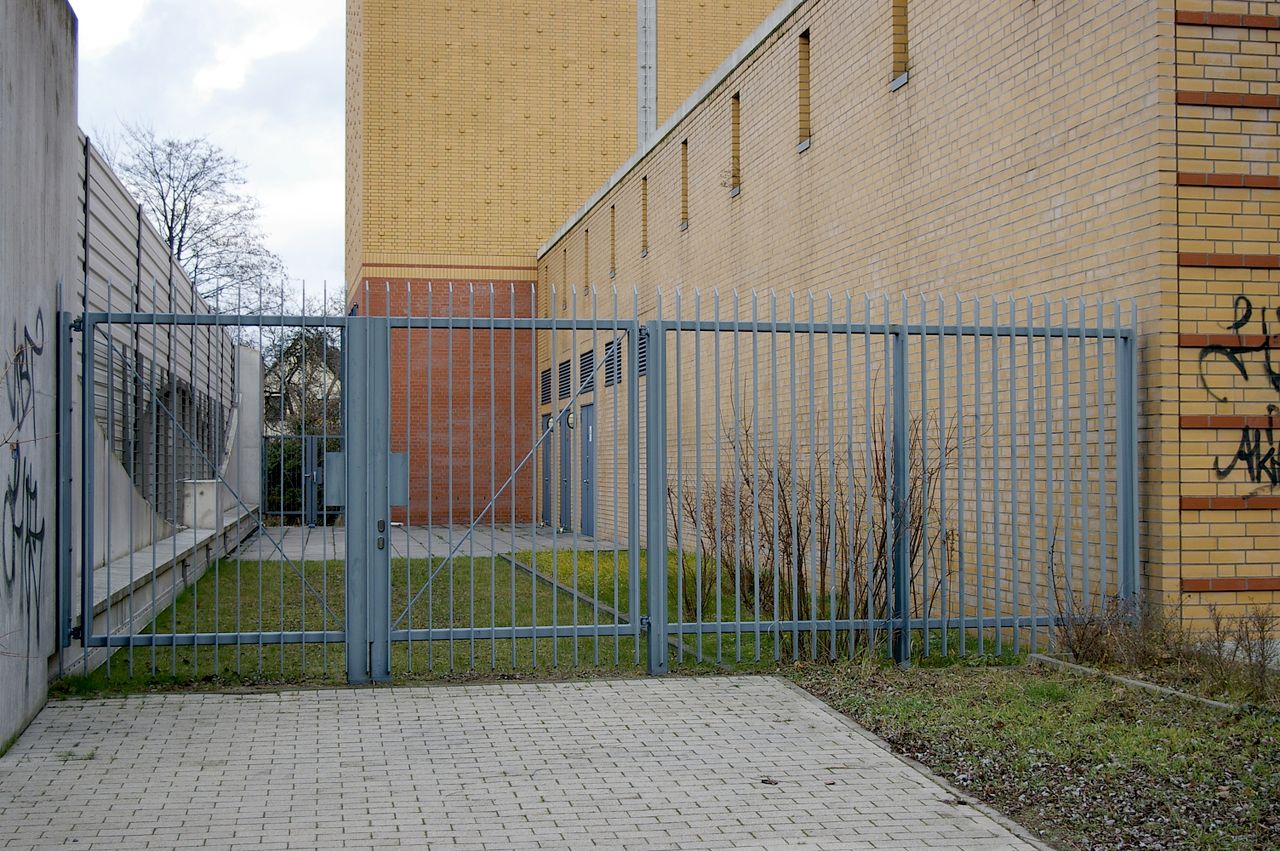 Wohnstraße in Berlin Tempelhof, direkt an der Autobahn mit tristen, kleinstädtisch anmutenden Wohnblöcken und Industriegebäuden.