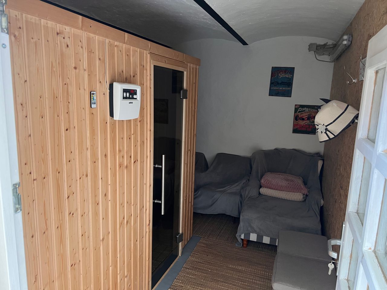 Im Nebengelass befindet sich eine Sauna und auf dem Hof ein Badefass.