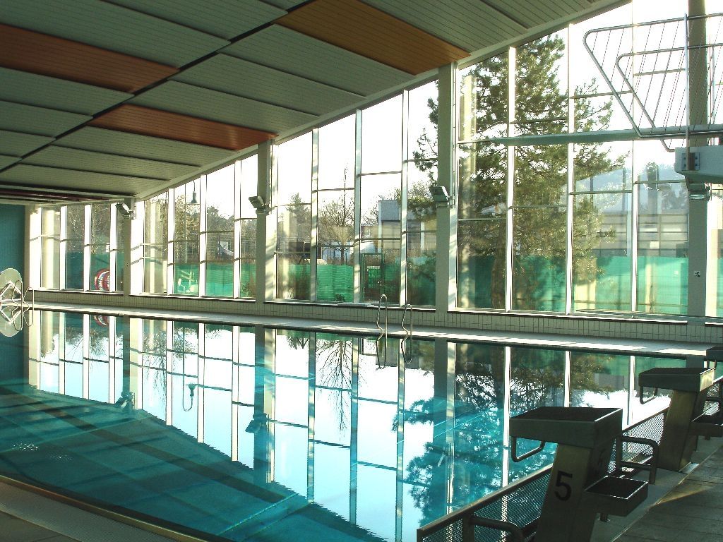 Schwimmbecken 5 x 25m-Bahnen (Größe: 25m x 12,50m) mit Sprunganlage (1m- und 3m-Sprungbrett), Nichtschwimmerbecken (Größe: 12,41m x 7,30m)