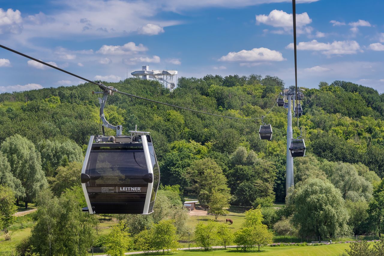 Der spektakuläre Ausblick aus bis zu 35 Metern Höhe reicht bis ins Zentrum Berlins. Mit einer Zwischenstation am Wolkenhain verkehrt die Seilbahn auf einer Gesamtlänge von 1,5 Kilometern. Es gibt sechs Kabinen mit Glasfußboden.