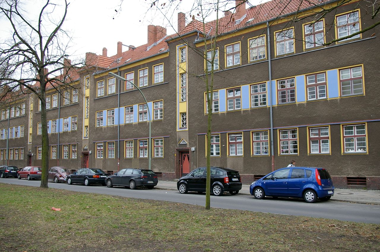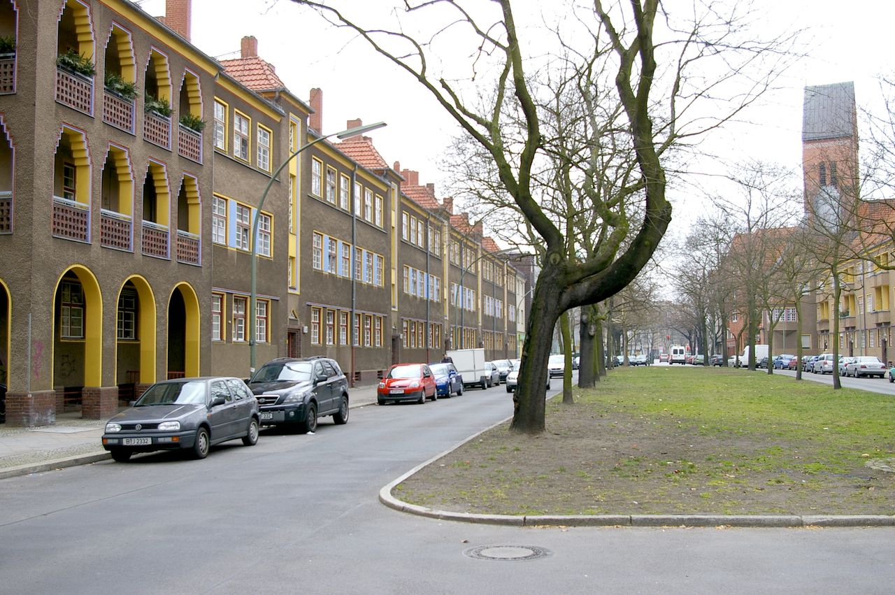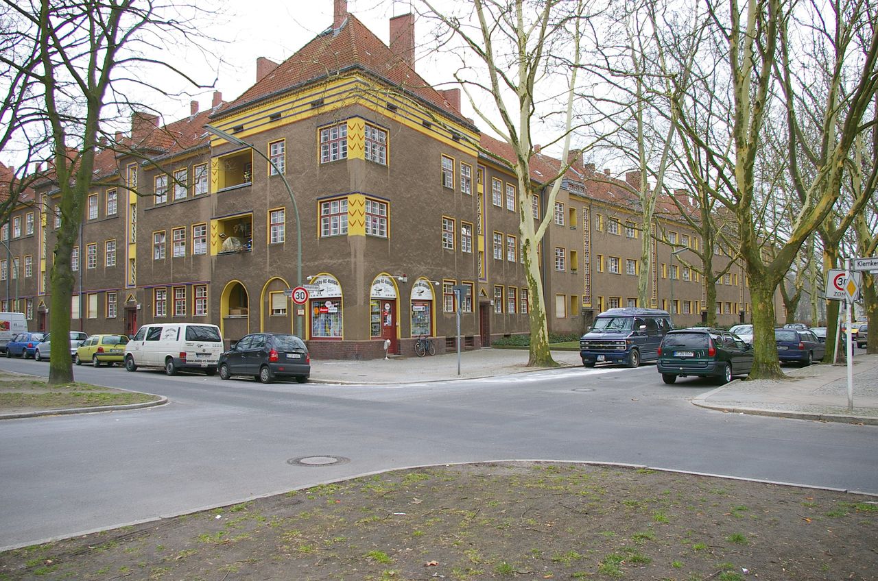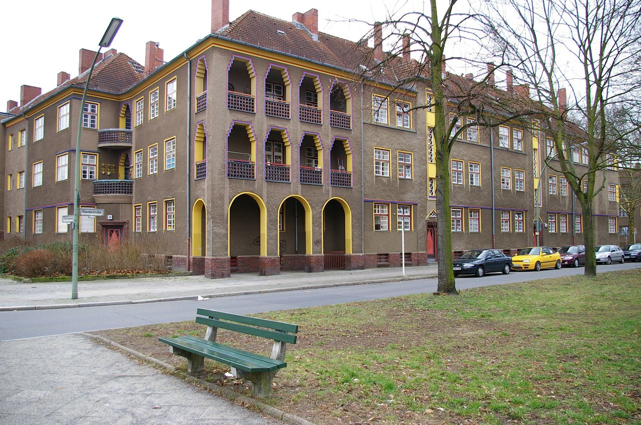 Gleich, wenn man die Siedlung betritt, fallen die ungewöhnlichen Details der Gestaltung ins Auge. Die Fenster sind in der Regel mehrfarbig abgesetzt, ebenso wie ein Großteil der Hausecken und die Einfassungen der Loggien, die mit ihren gezackten Bögen und ihren bunten Säulchen in starkem Kontrast zu den wuchtigen Erkern stehen. Dieser expressionistische Zitatenschatz des Architekten und die großzügigen von Erwin Barth gestalteten Grünräume machen die Siedlung zu einer Besonderheit in Berlin.
