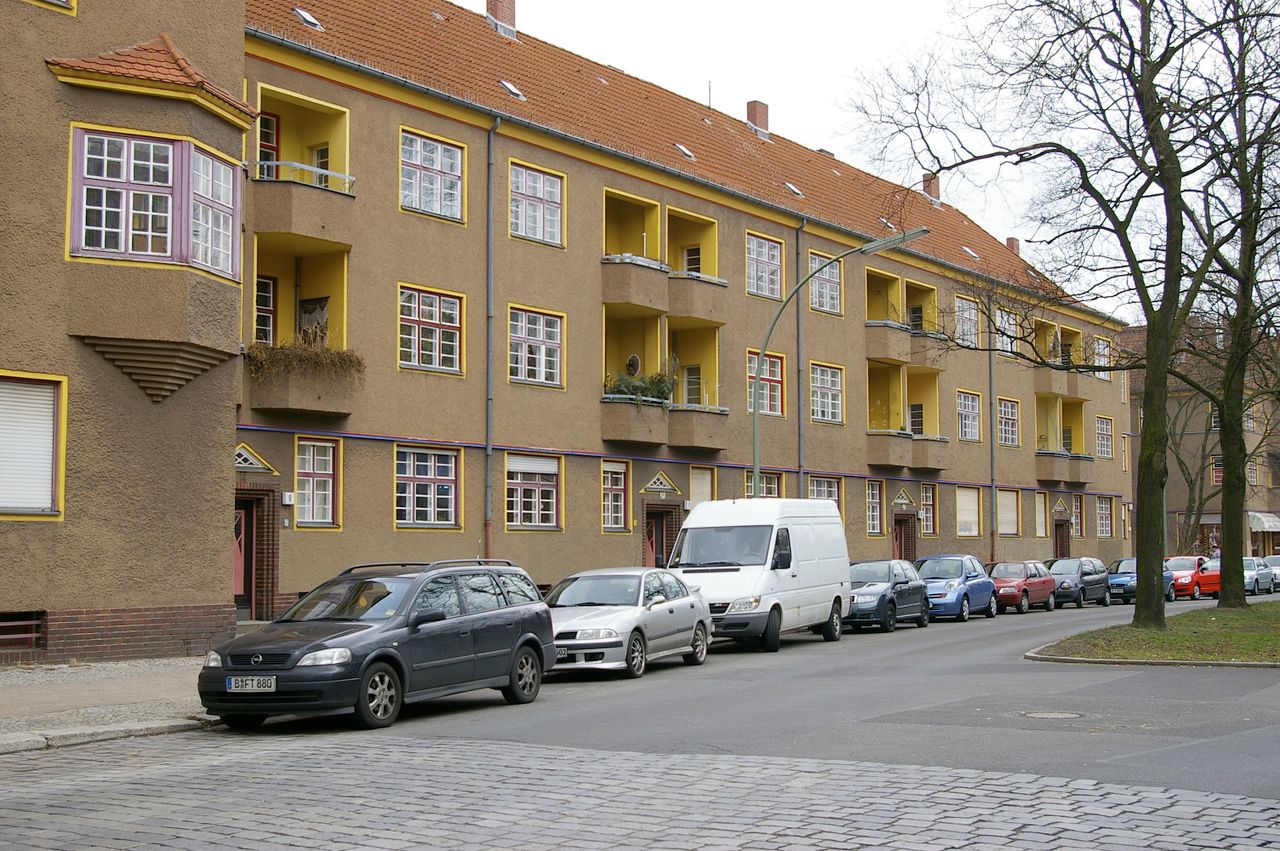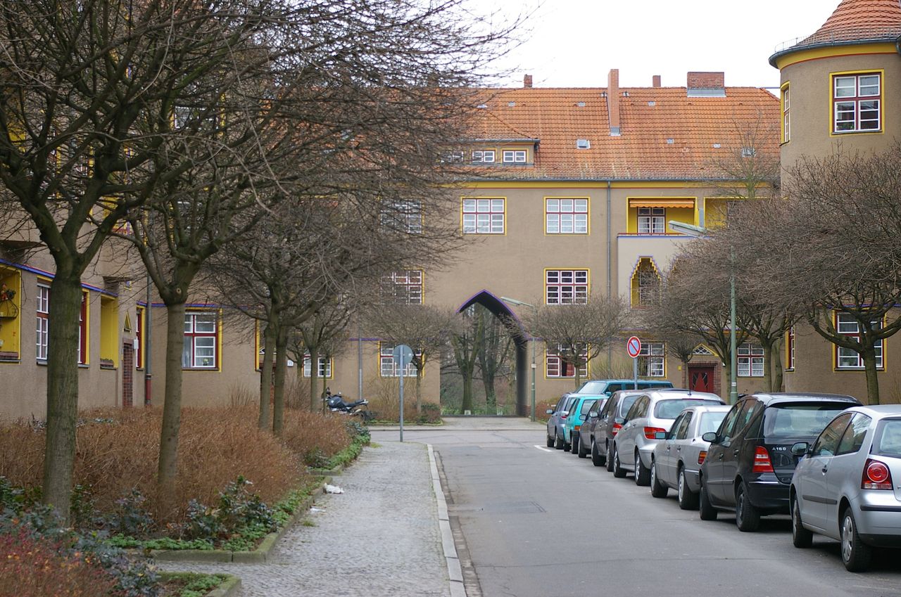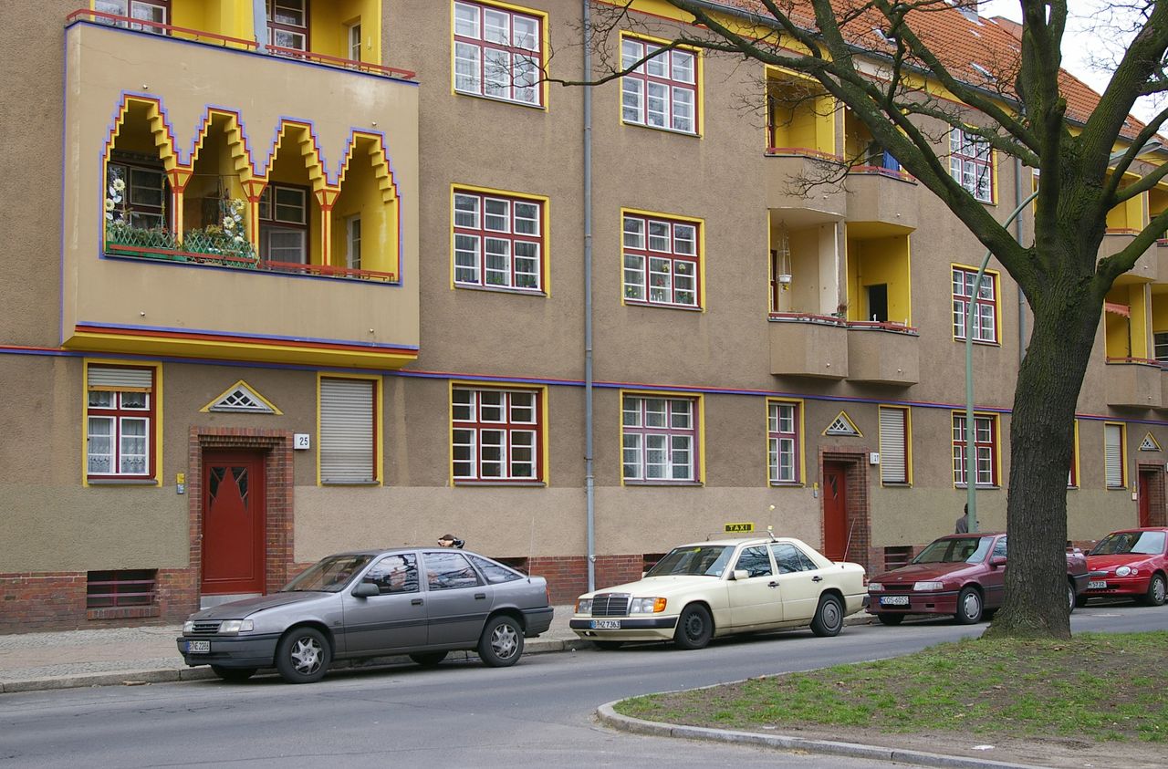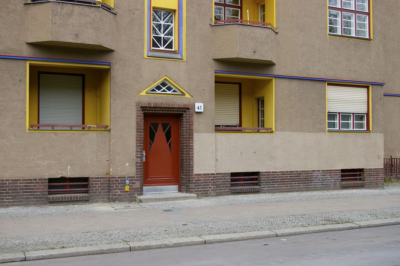 Gleich, wenn man die Siedlung betritt, fallen die ungewöhnlichen Details der Gestaltung ins Auge. Die Fenster sind in der Regel mehrfarbig abgesetzt, ebenso wie ein Großteil der Hausecken und die Einfassungen der Loggien, die mit ihren gezackten Bögen und ihren bunten Säulchen in starkem Kontrast zu den wuchtigen Erkern stehen. Dieser expressionistische Zitatenschatz des Architekten und die großzügigen von Erwin Barth gestalteten Grünräume machen die Siedlung zu einer Besonderheit in Berlin.