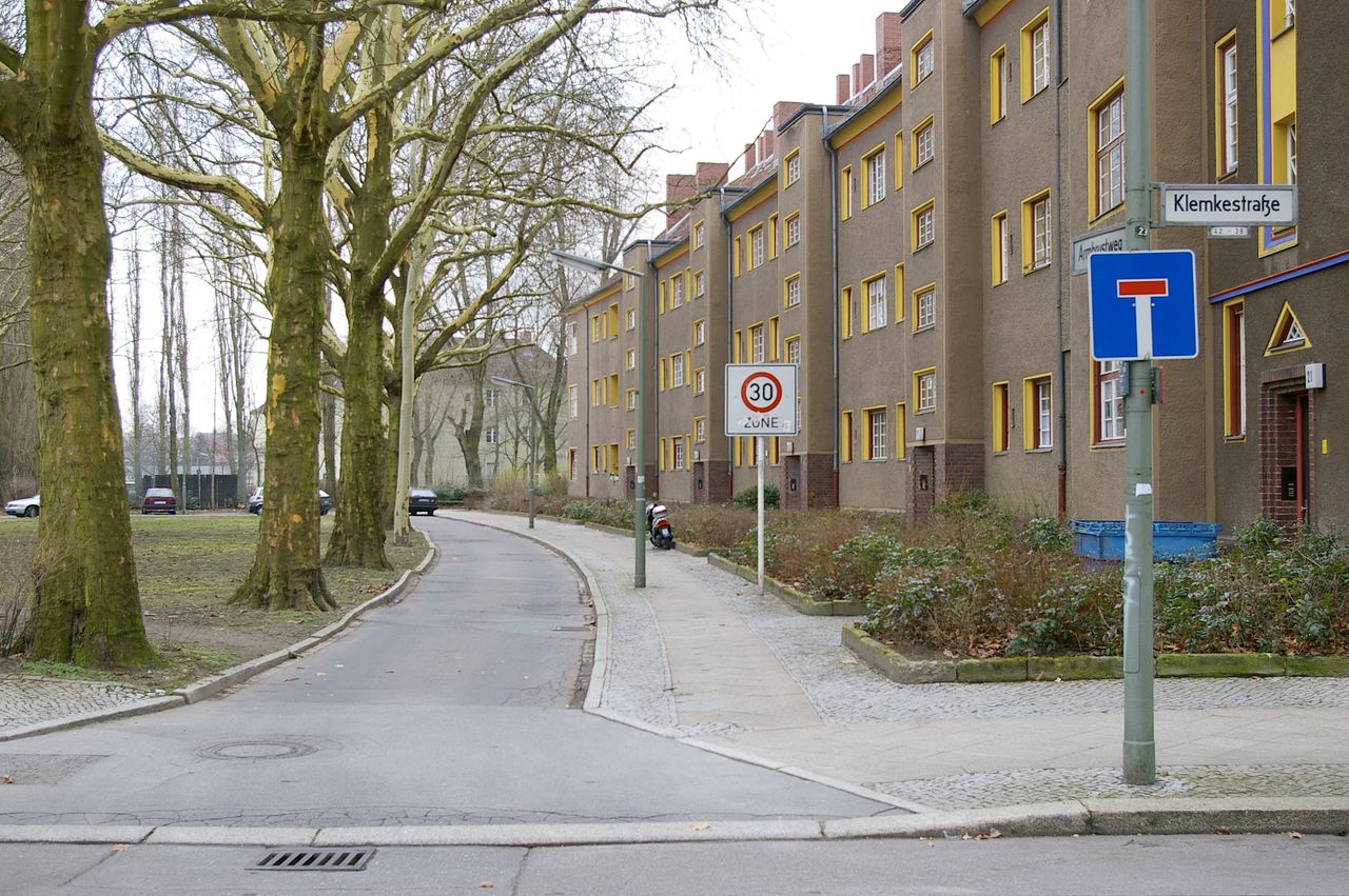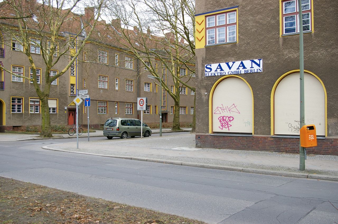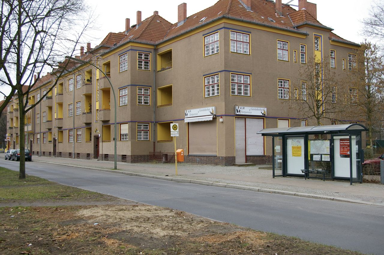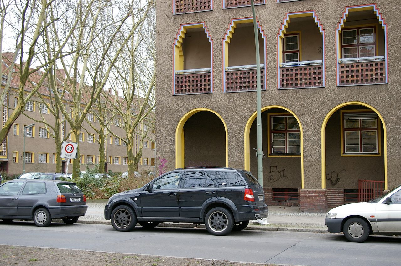Gleich, wenn man die Siedlung betritt, fallen die ungewöhnlichen Details der Gestaltung ins Auge. Die Fenster sind in der Regel mehrfarbig abgesetzt, ebenso wie ein Großteil der Hausecken und die Einfassungen der Loggien, die mit ihren gezackten Bögen und ihren bunten Säulchen in starkem Kontrast zu den wuchtigen Erkern stehen. Dieser expressionistische Zitatenschatz des Architekten und die großzügigen von Erwin Barth gestalteten Grünräume machen die Siedlung zu einer Besonderheit in Berlin.