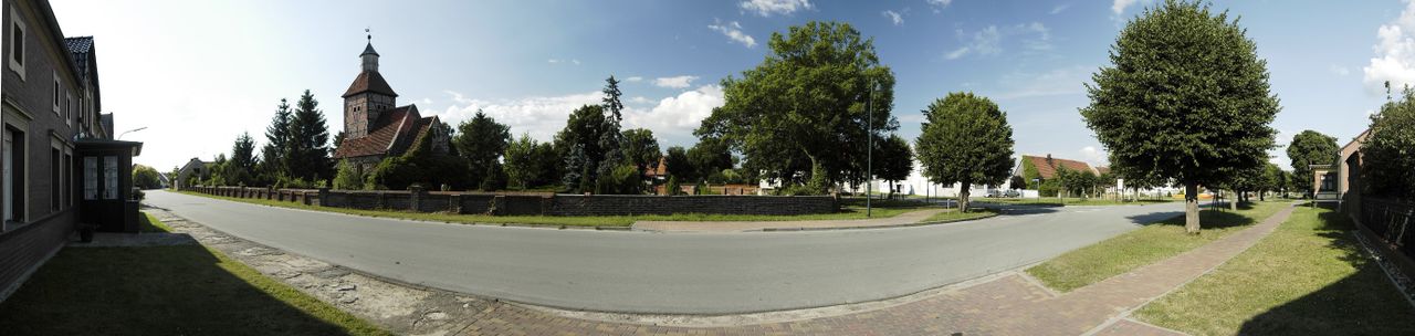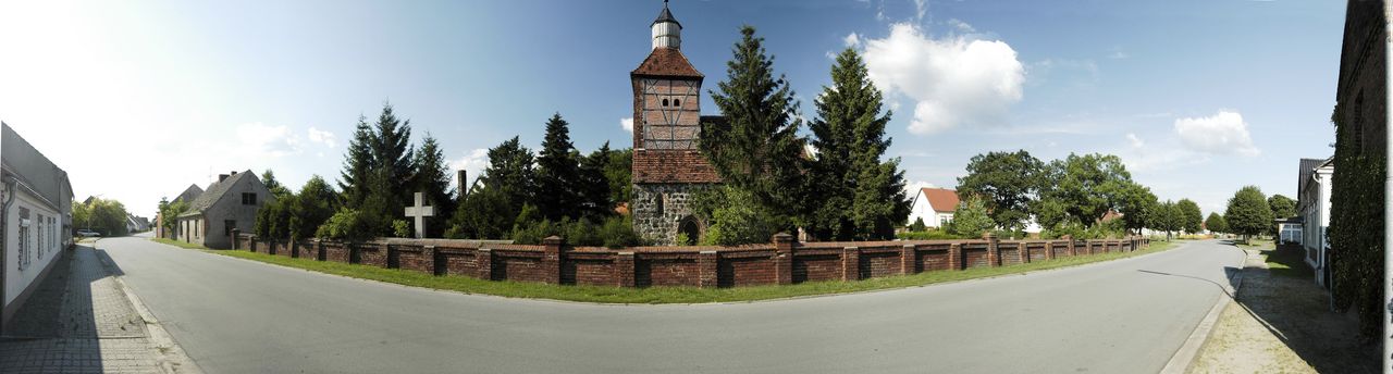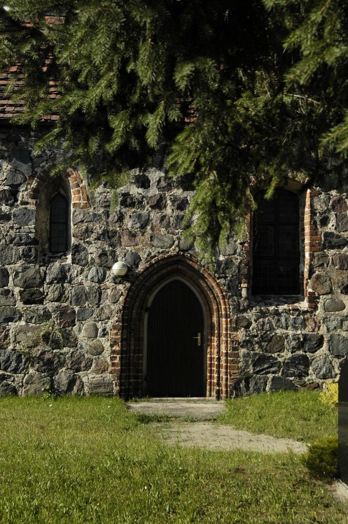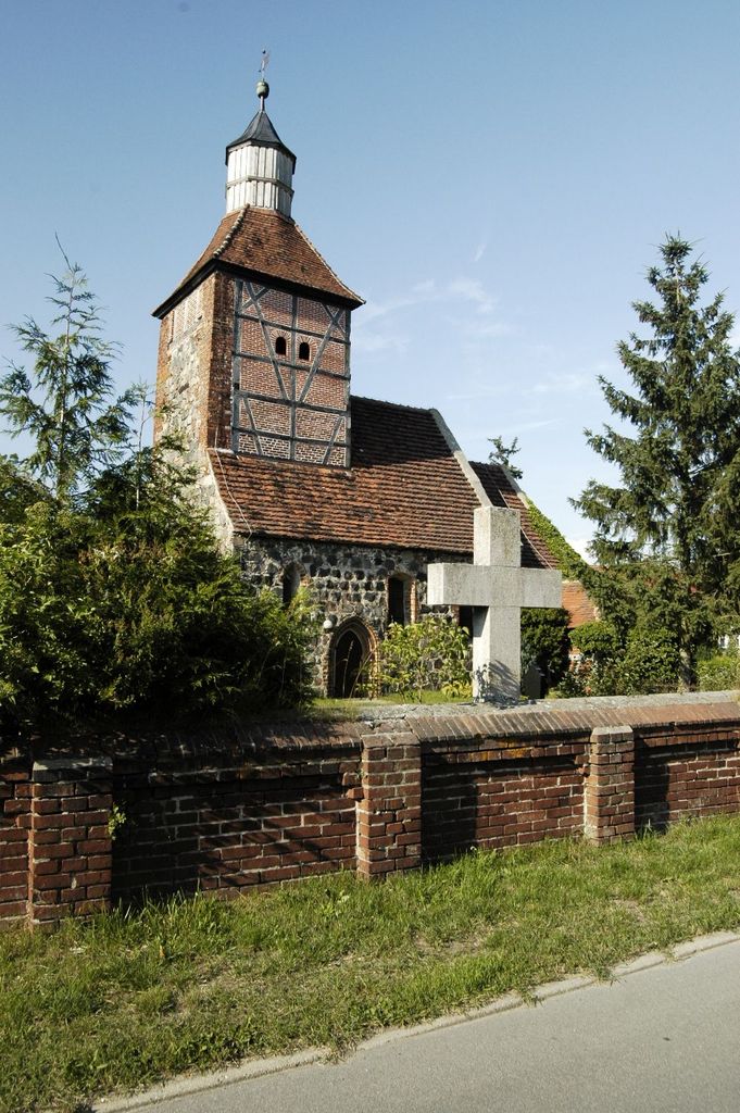 Der spätromanische Granitquaderbau der Kirche entstand 1429. (nach anderen Angaben bereits in der Mitte des 14. Jahrhunderts) Im Jahre 1647 wurde der Bau umfassend umgestaltet. 1706 erhielt die Kirche den Fachwwerkturm, der Haube und Laterne trägt. 1730 wurde ein Anbau angefügt. Der hölzerne Altaraufsatz entstand 1647. Sehenswert ist ein silberner Kelch aus dem 14./15. Jahrhundert und das Taufbecken von 1690. Der Sage nach bauten die seit altersher in Spaatz ansässigen Zwerge die Kirche aus Dankbarkeit für die Hilfe der Zuwanderer. Deshalb hätte die Kirche auch dieses für das Havelland seltene Aussehen.