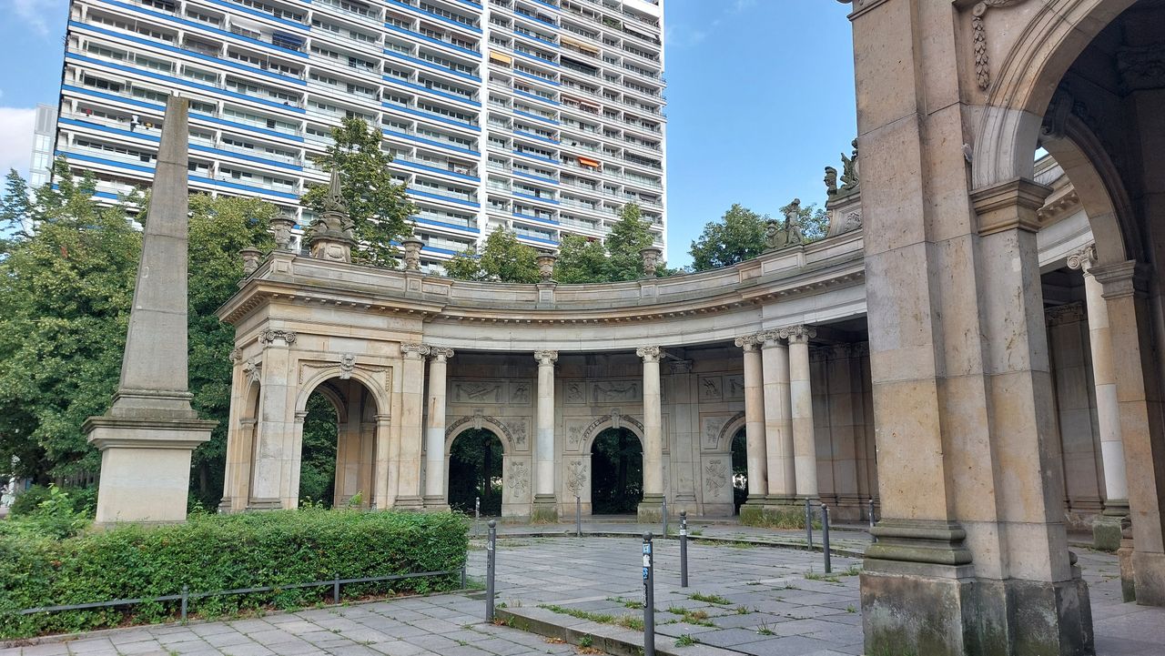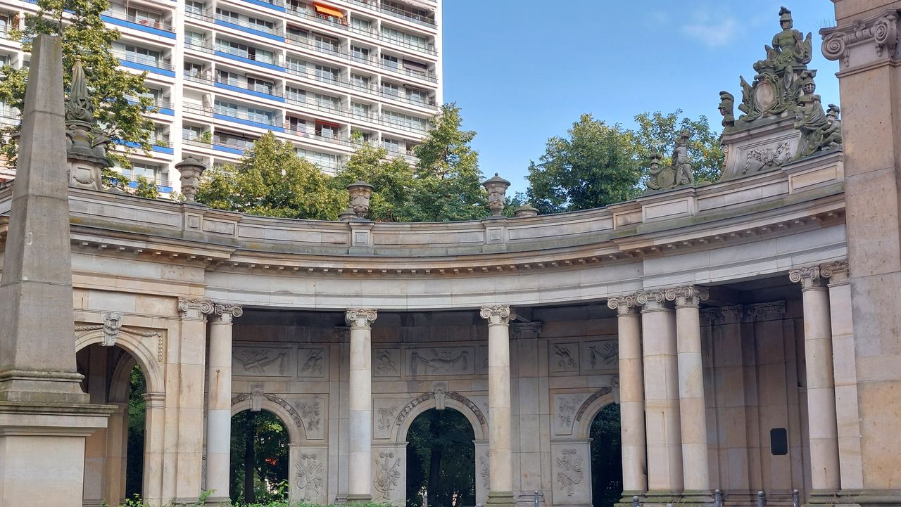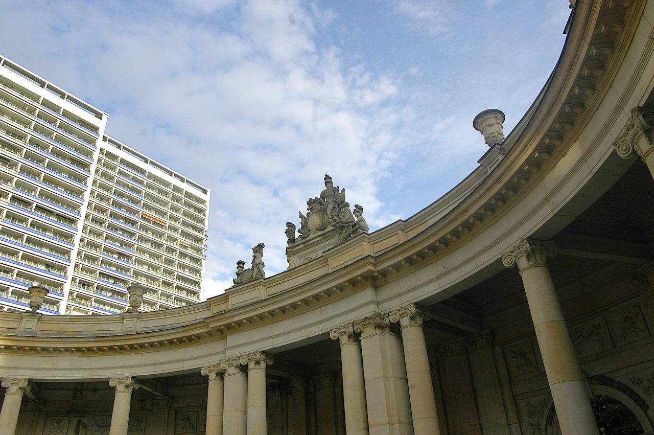 "Die Spittelkolonnaden in Berlin sind ein spätbarockes Schmuckbauwerk von Carl Philipp von Gontard auf dem Marion-Gräfin-Dönhoff-Platz im Ortsteil Mitte in der Nähe des Spittelmarktes. Ursprünglich bestanden sie aus einem Ensemble von zwei halbrund geformten offenen Säulenhallen, die zur Zeit ihrer Errichtung im Jahr 1776 als Einfassung einer Brücke über den südlichen Festungsgraben dienten, der seinerzeit ein unansehnlicher Abwassergraben war." (Zit.nach: de.wikipedia.org)