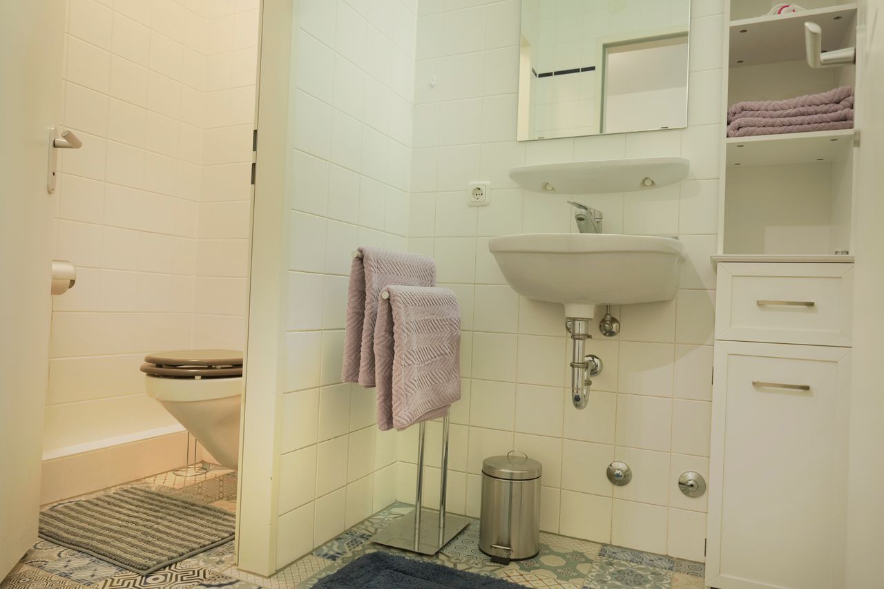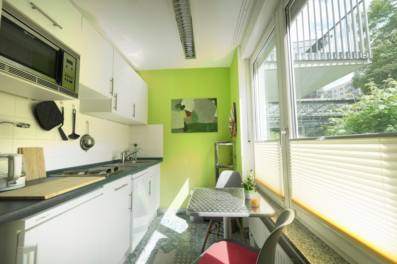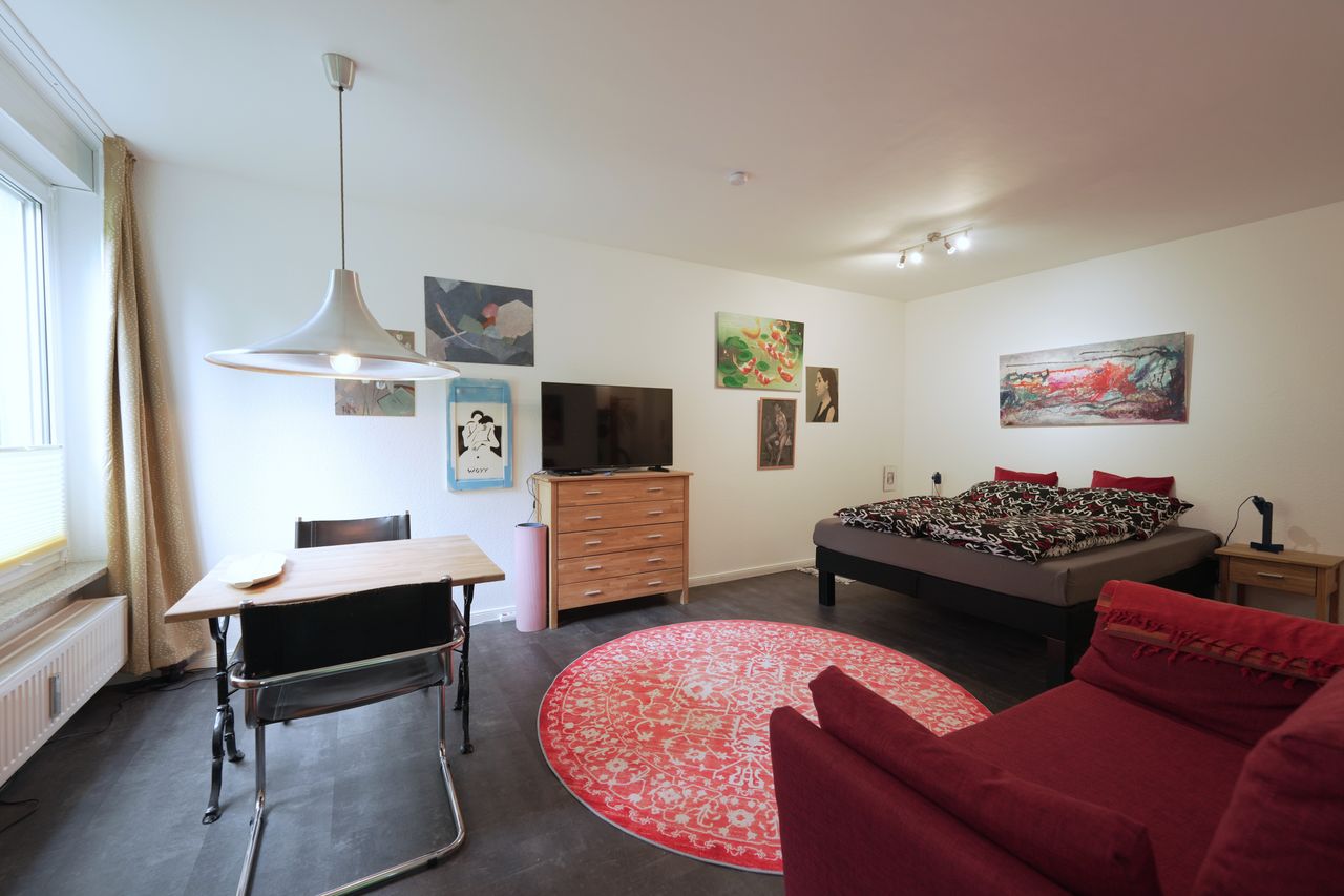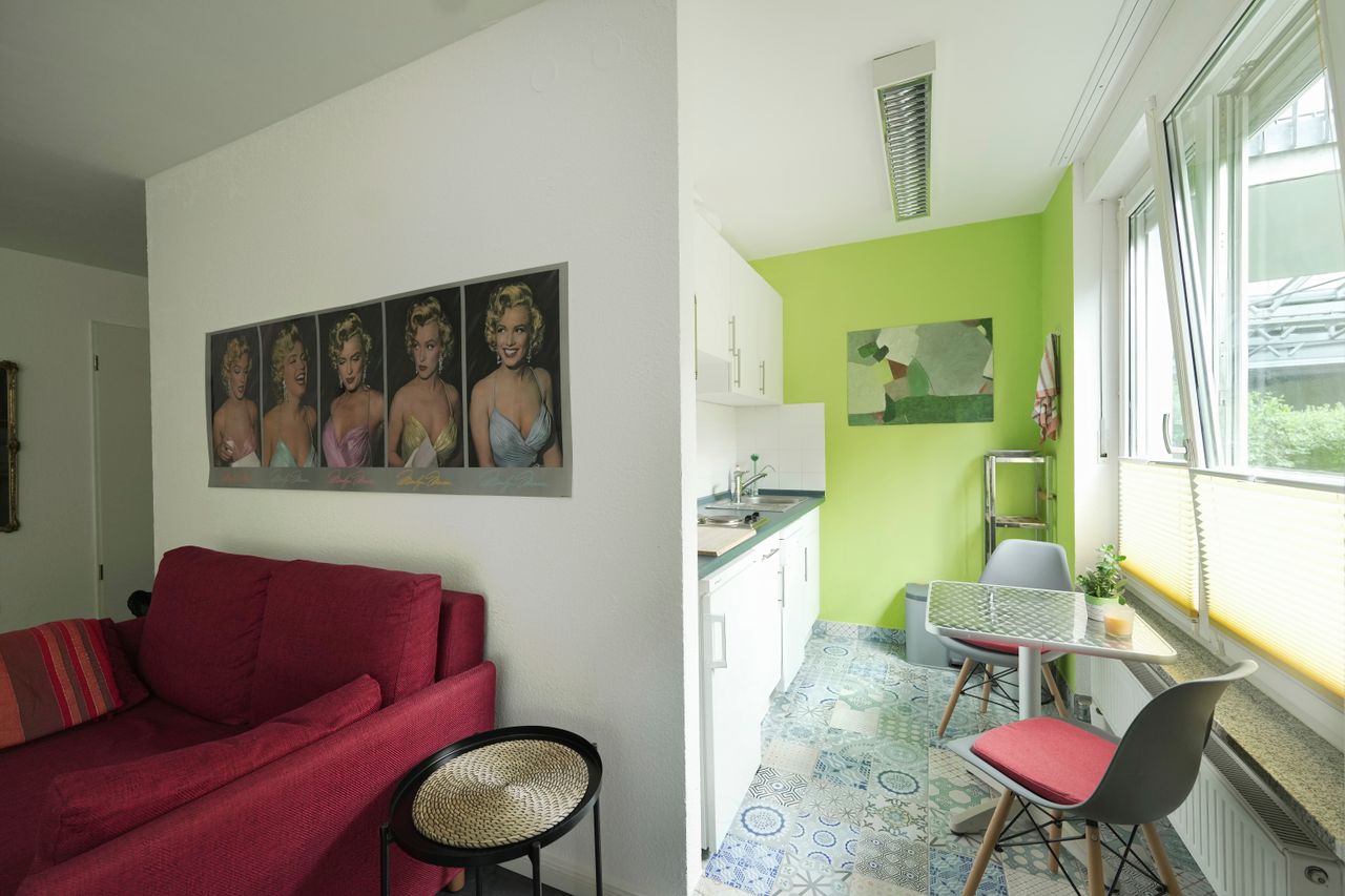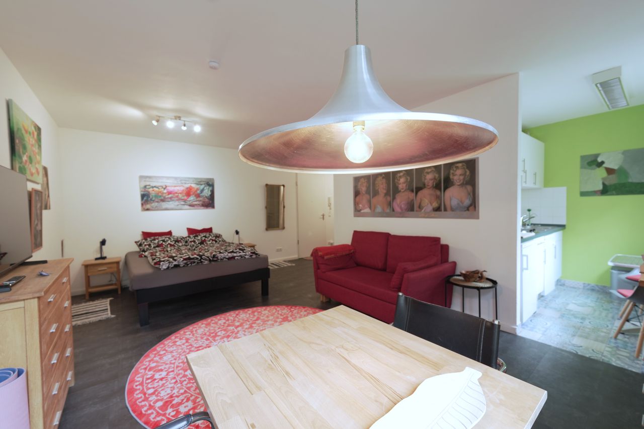 Die Wohnung ist ein Studio/Loft. Zwischen dem Küchenbereich und dem Wohnbereich gibt es keine Türen/Wände. Der Küchenbereich ist trotzdem abgeteilt und gut für einen Dreh mit der Kamera nutzbar. Die Einrichtung hat einen modernen Art/Loftcharakter. Durch die Lage im Erdgeschoss kann die Beleuchtung unkompliziert von außen erfolgen.