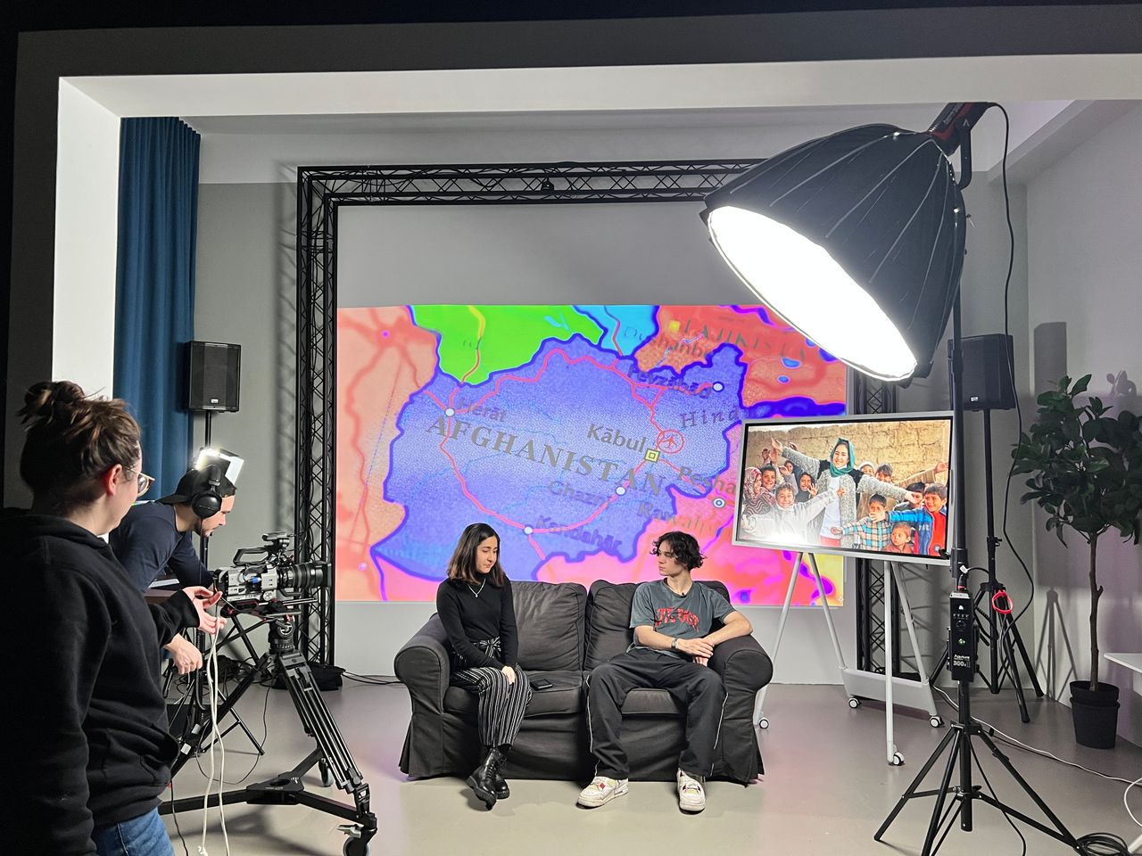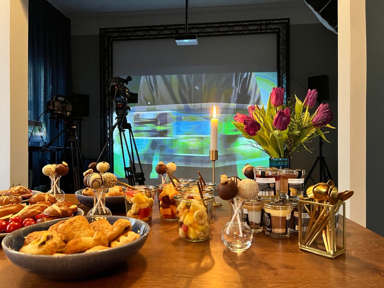 STUDIO mit Schallschutzfenstern, Rückbild, Licht, Mobiliar, schwarzes Rigg: Vollausstattung für TV&Videoproduktionen + Livestreams.