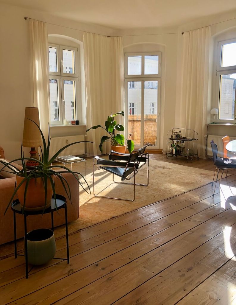 This 100 sqm altbau couple-apartment in Berlin's West comes with three rooms and two balconies and provides sunlight and brightness all day long– which is particularly apparent in the spacious living and dining area with windows facing two streets. The mix of modern furniture, timeless classics and vintage finds makes the setting suitable for various types of photo and film shoots, especially those that want to show an authentic, modern lifestyle.