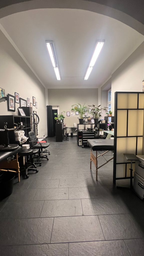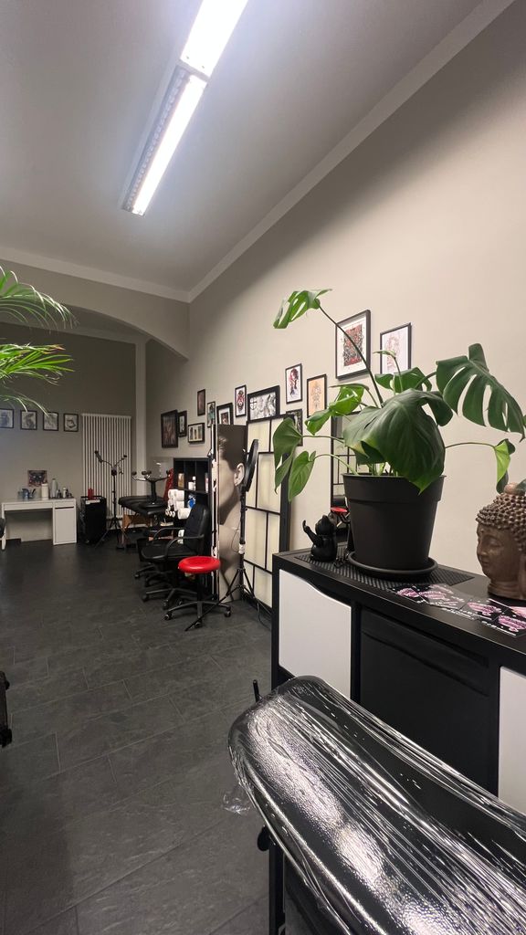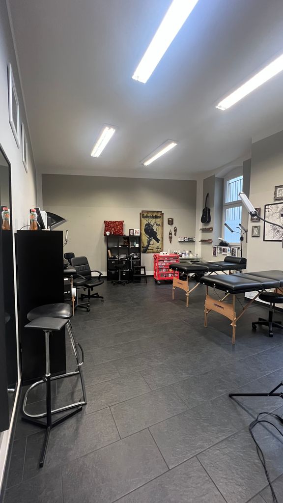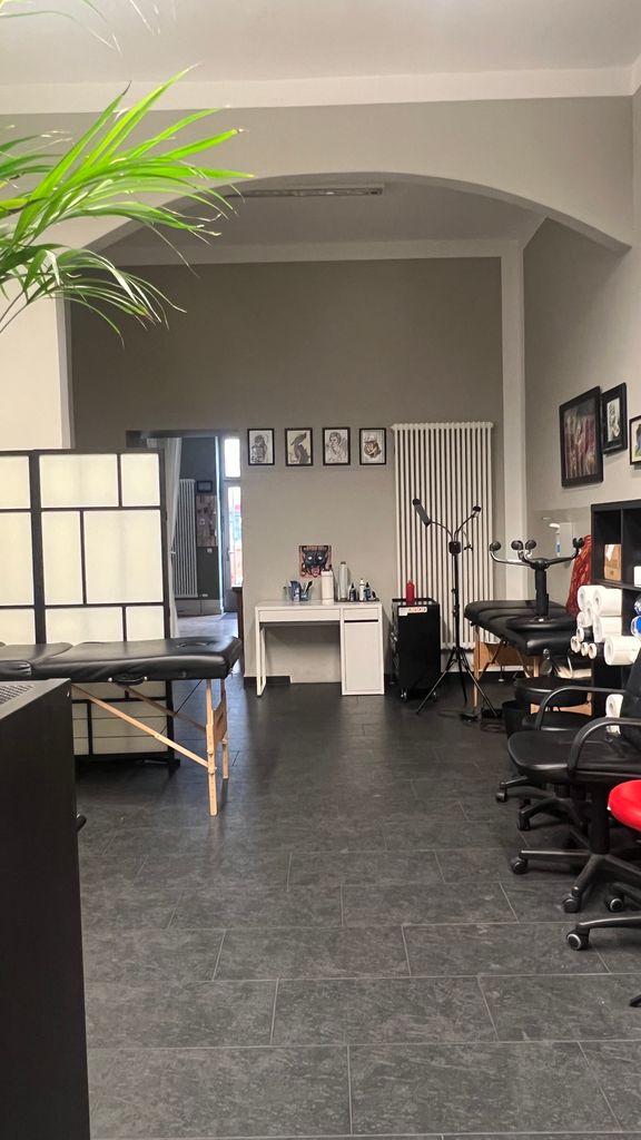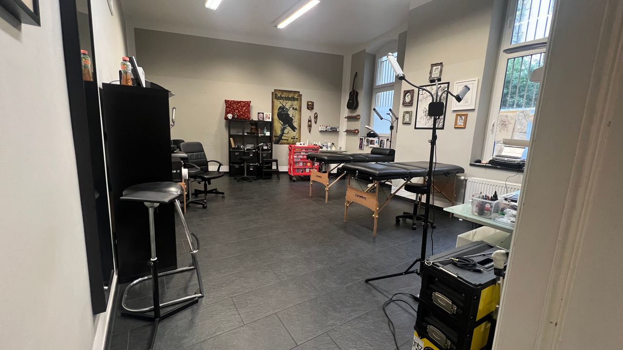 Ein Klassisches Tattoostudio mit einem Empfangsraum ,zwei Studioräume und Toilette.