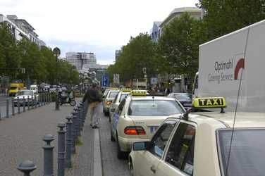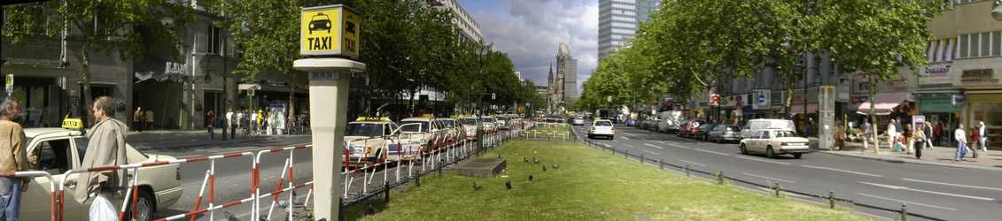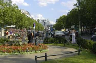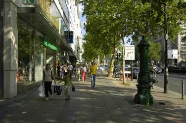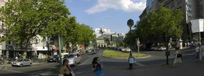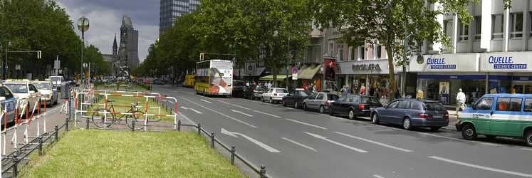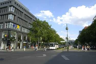 Verlängerung des Kurfürstendamms, viele Touristen, Geschäft, ebenfalls stark befahrene Straße