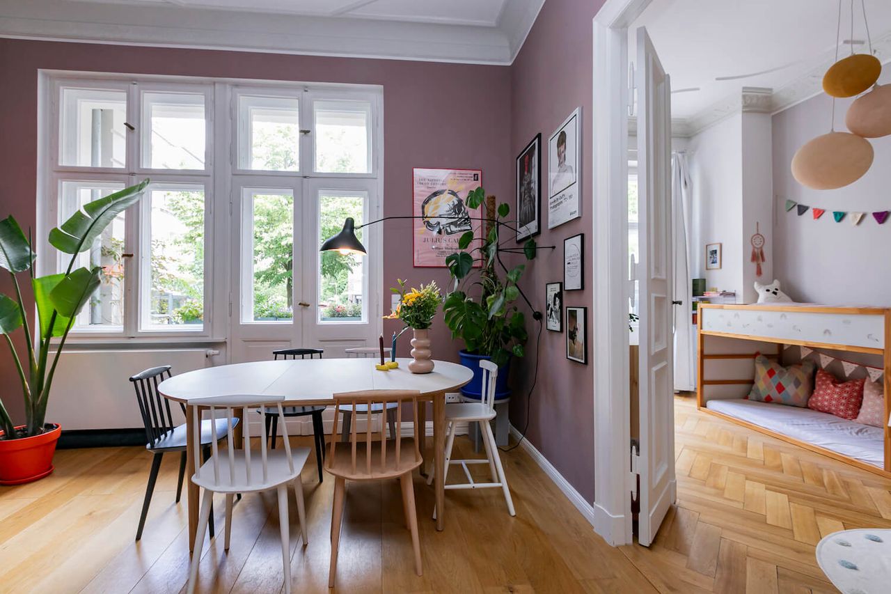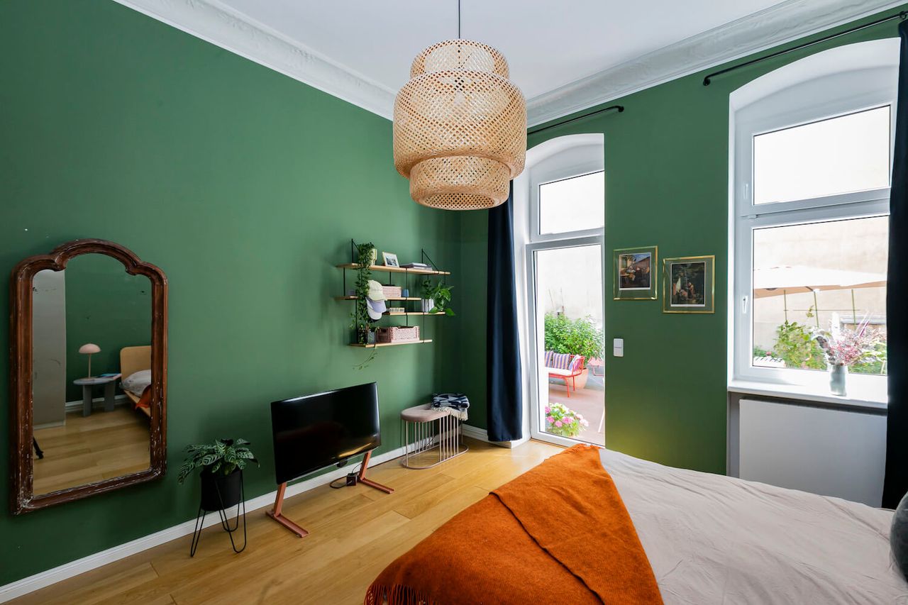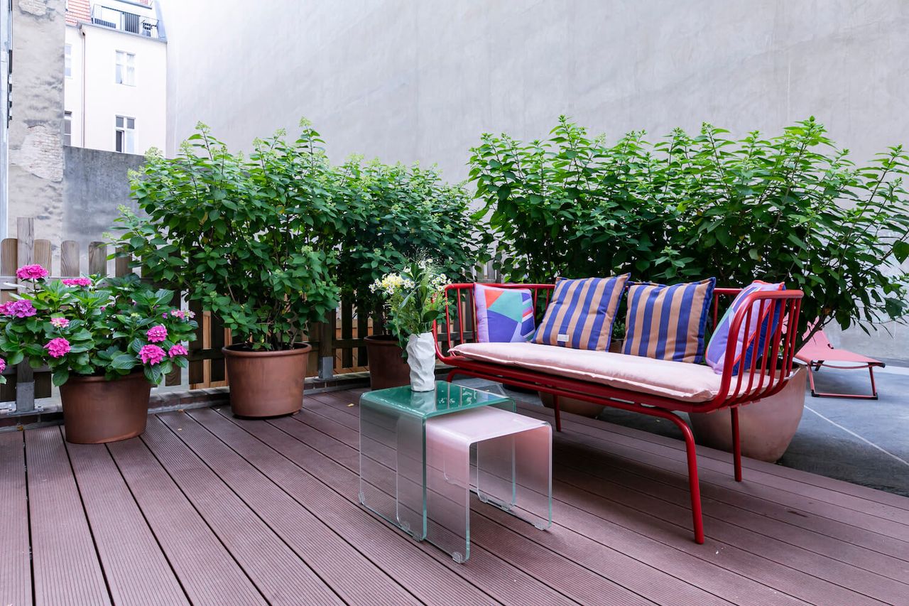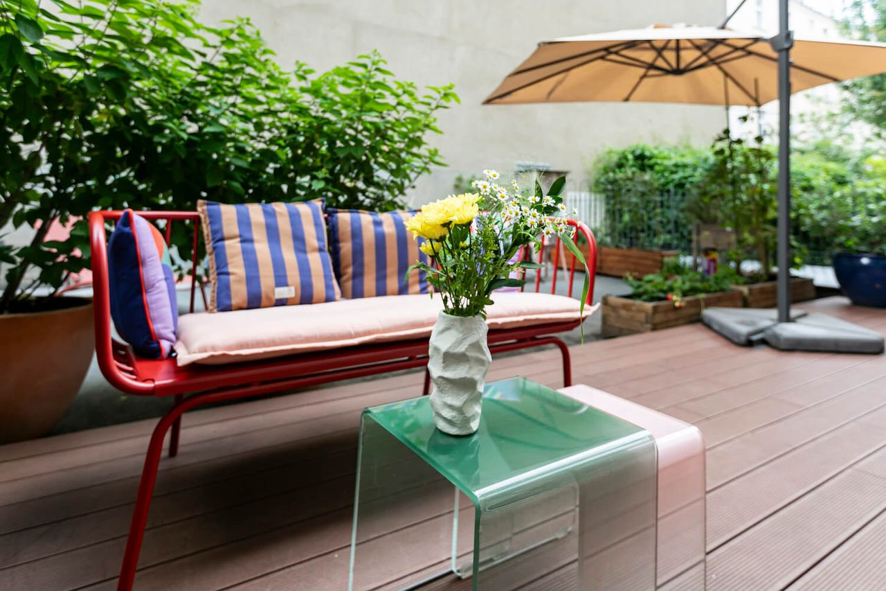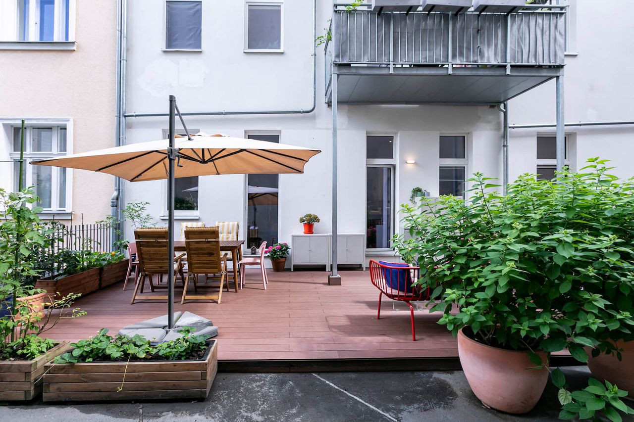 A beautiful old flat in West Berlin which has a prized possession: a spacious terrace. Located on the mezzanine floor of a house built around 1930, it features rich decorations, high ceilings, and beautiful wooden floors. Recently renovated, it has PLENTY of natural light, a large, green terrace with various seating areas, 2 children's rooms, a lavish living/dining area, a spacious bedroom, and a designer kitchen with terrace access. The flat is colourful, furnished with many design classics to a high standard, and is ideal for photo and video productions.