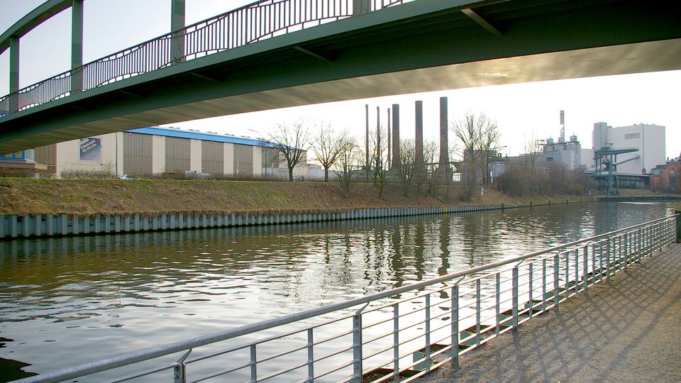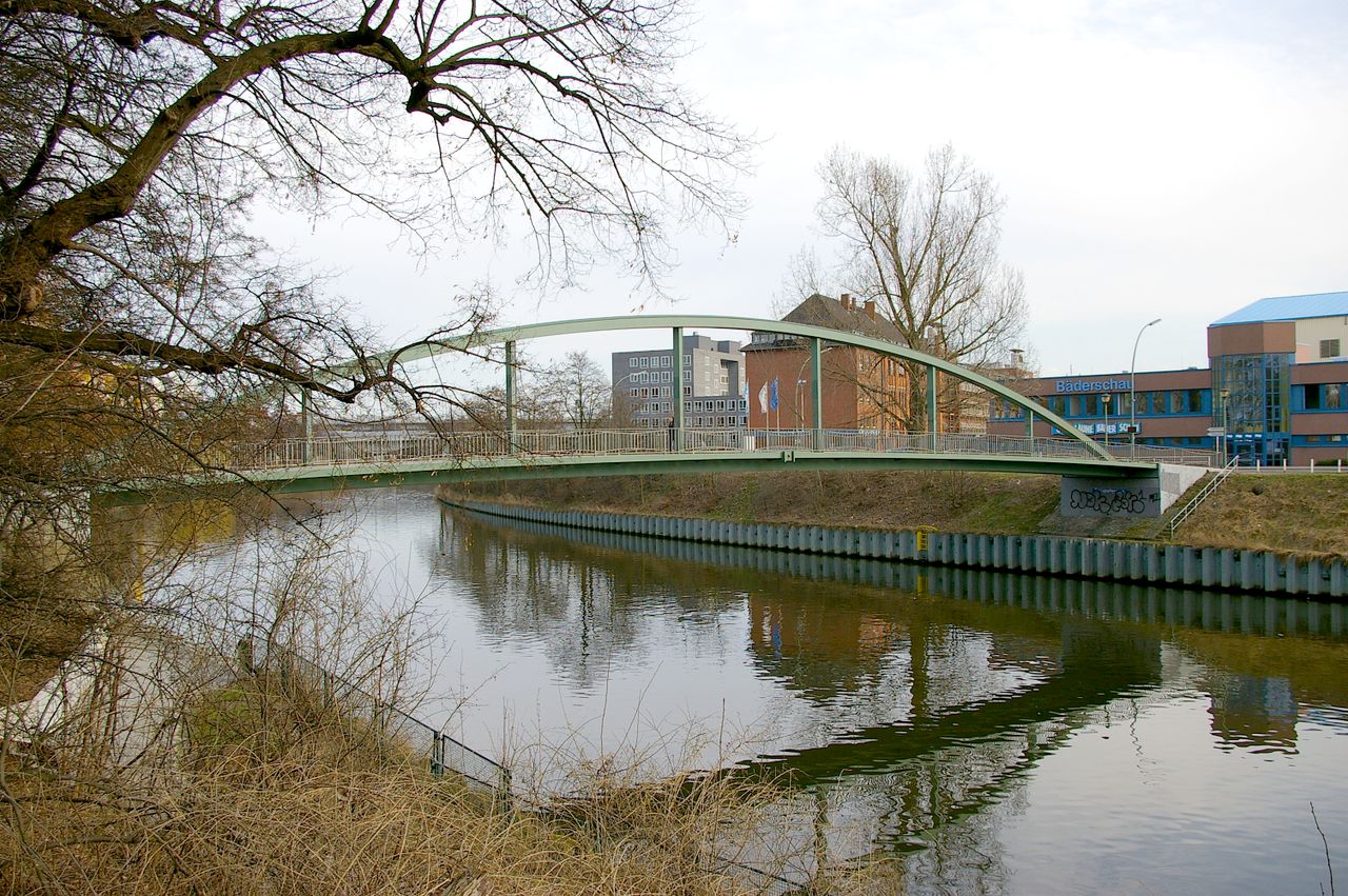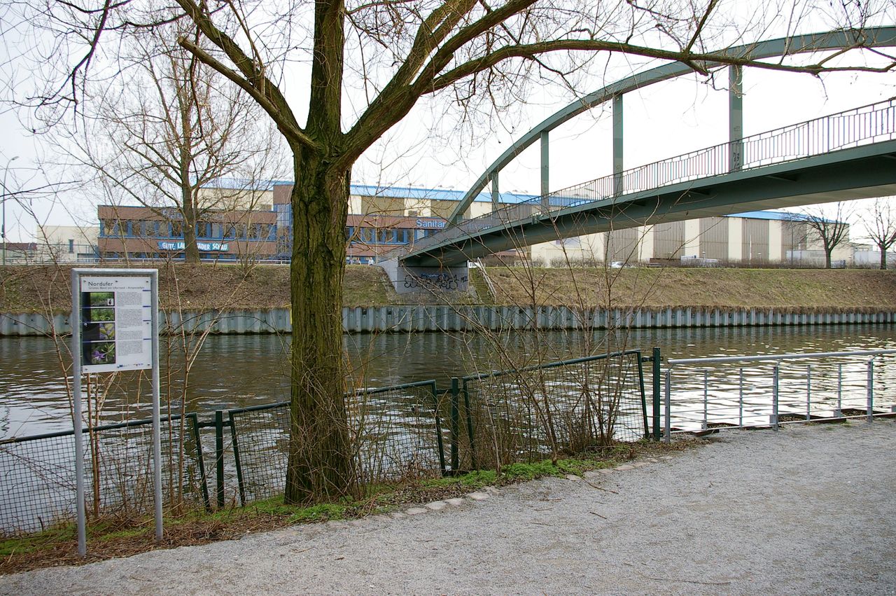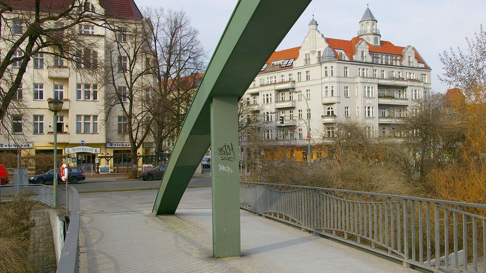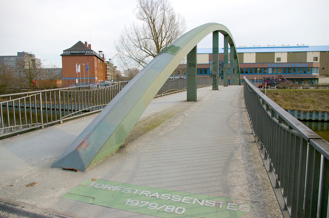 Der Torfstraßensteg verbindet den südlichen Teil der Torfstraße über den Berlin-Spandauer Schiffahrtskanal mit dem Friedrich-Krause-Ufer. 1859 existierte bereits eine hölzerne Klappenbrücke. Die in den Jahren 1895 bis 1896 im Zuge der Torfstraße erbaute steinerne Torfstraßenbrücke erhielt ihren Namen nach den Torfwiesen, die sich einst beiderseits der hier 1832 angelegten Straße befanden. 1944/45 wurde die Brücke beschädigt und dann abgebrochen. 1968 wurde eine Spannbetonbrücke gebaut, die wiederum 1980 abgebrochen wurde. Einige Meter westlich entstand 1979/80 der T. Auf ihm erstreckt sich von der einen zur anderen Seite ein stählerner Bogen, der in der Mitte des T. eine Höhe von mehreren Metern erreicht.