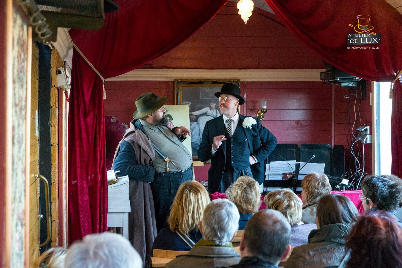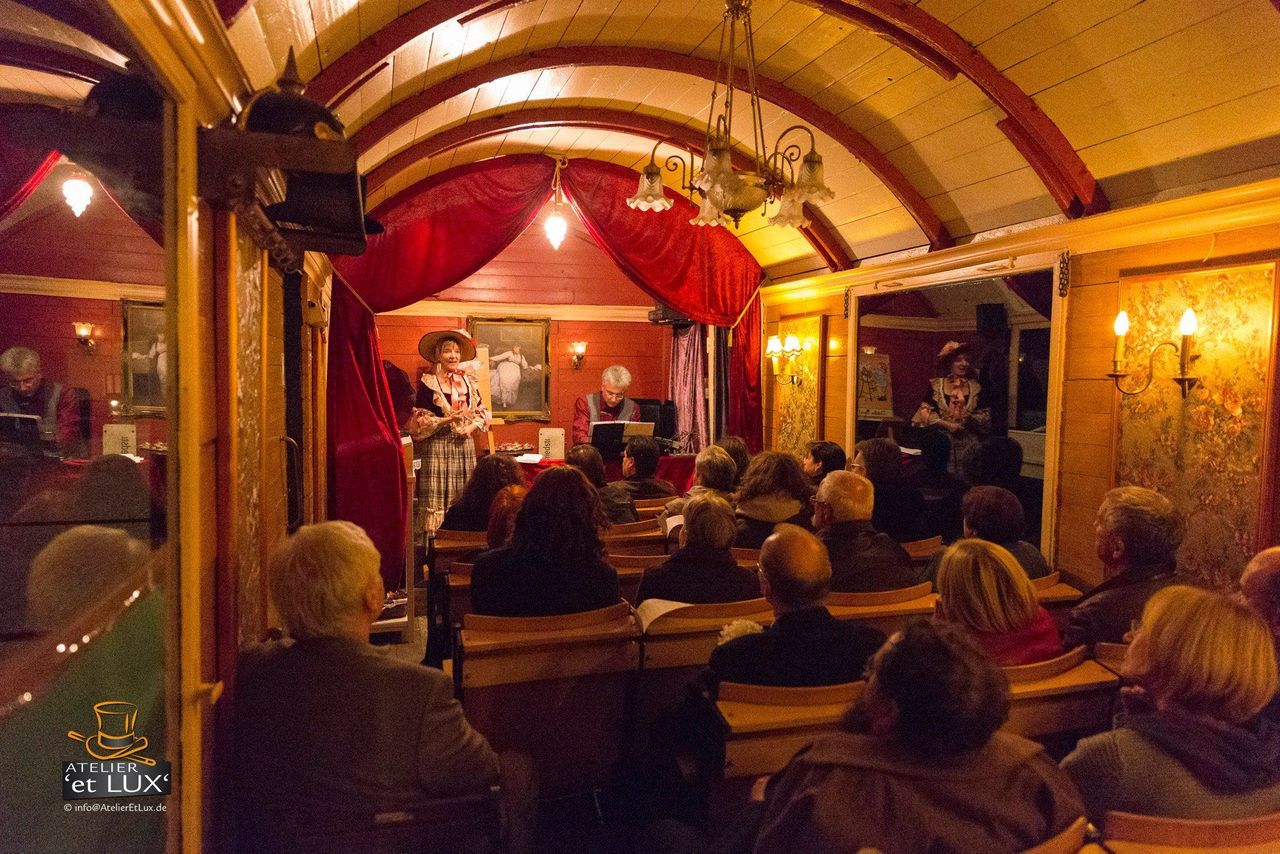 In der Atmosphäre eines Salonwagens der 1920er Jahre kann man im Theaterwaggon Altberliner Kabarett, romantische Klavierabende, Lesungen und vieles mehr erleben.