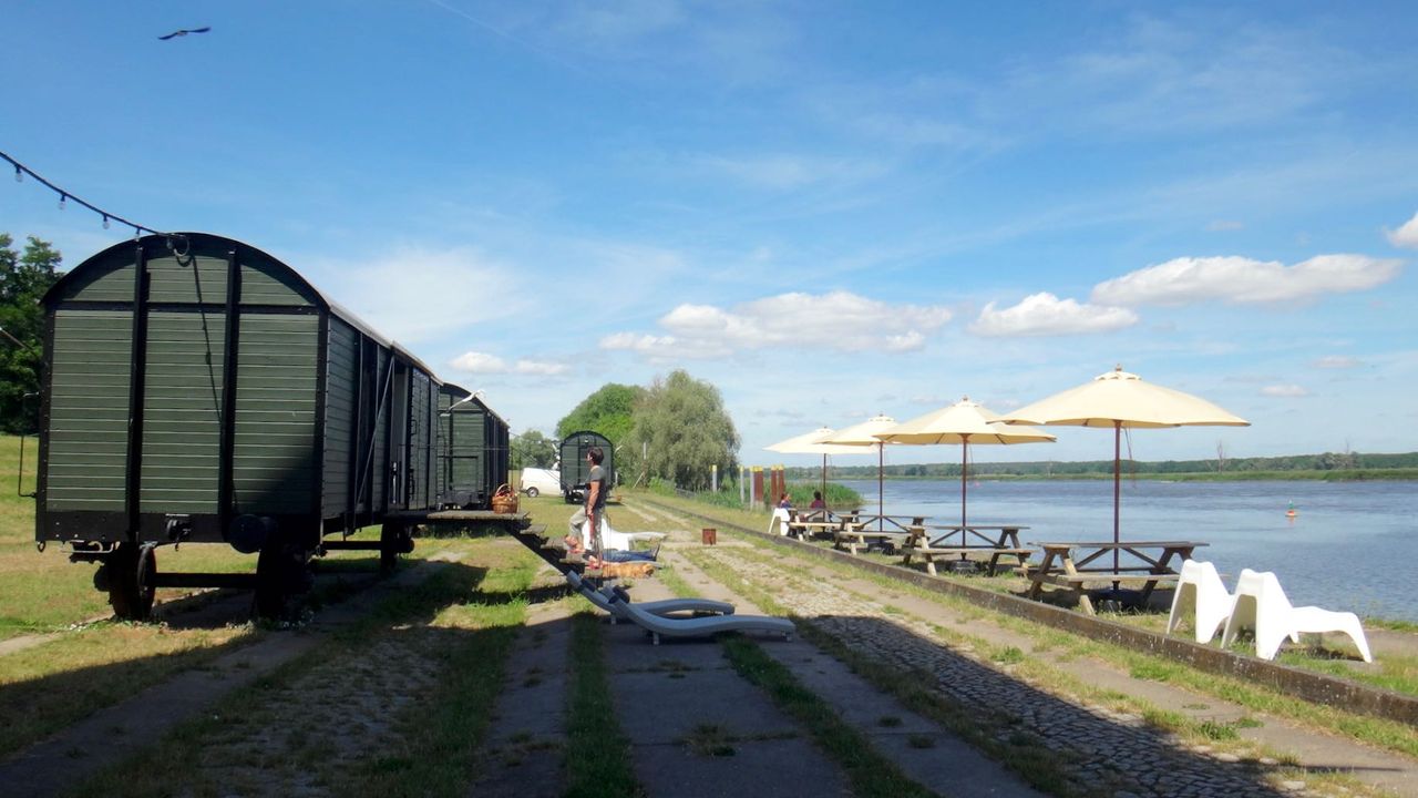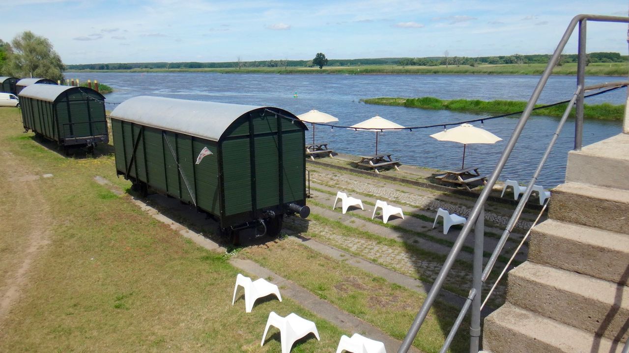 Als Möglichkeit für günstige Übernachtungen während der Sommermonate wurden auf die noch vorhandenen drei Gleislagen der Hafens weitere drei historische Bahnwaggons zurückgeholt. Sie stammen aus der gleichen Bauzeit wie der Verladeturm und wurden ebenfalls mit viel Liebe zum denkmalgerechten Detail saniert. Aufgrund ihrer Lage im Überschwemmungsgebiet mussten die Waggons bewusst schlicht ohne Heizung und ohne Duschen eingerichtet werden; Waschbecken und WC befinden sich im ehemaligen Gebläsehaus am Fuß des Verladeturms.