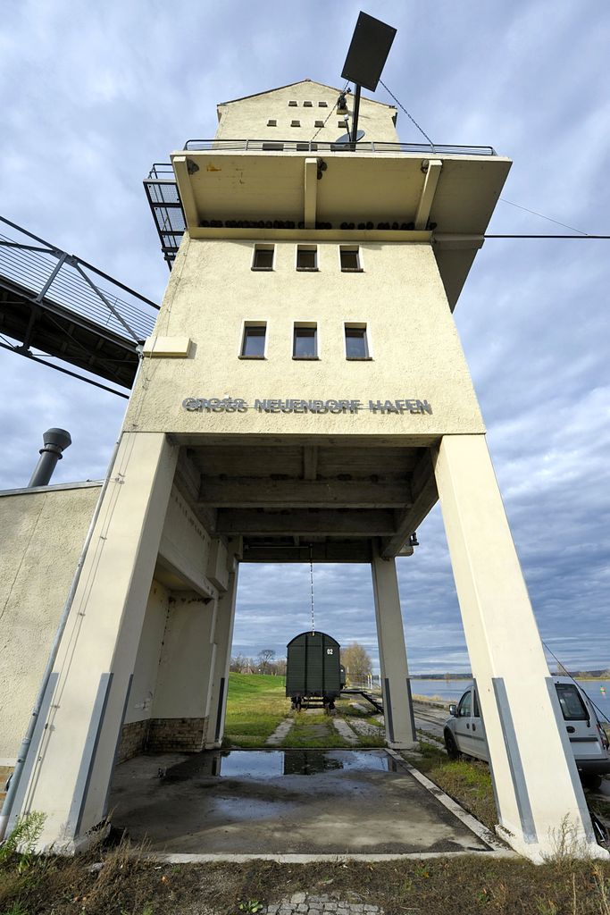 Der Kern des Denkmalensembles "Kulturhafen Groß Neuendorf" besteht aus zwei weithin sichtbaren Türmen - dem ehemaligen Maschinenhaus, welches heute ein Hotel beherbergt sowie dem früheren Verladeturm. Die beiden ungleichen Brüder sind über eine 70 Meter lange Förderbrücke aus Stahlfachwerk verbunden, die zu einer öffentlichen Aussichtplattform umgebaut wurde.