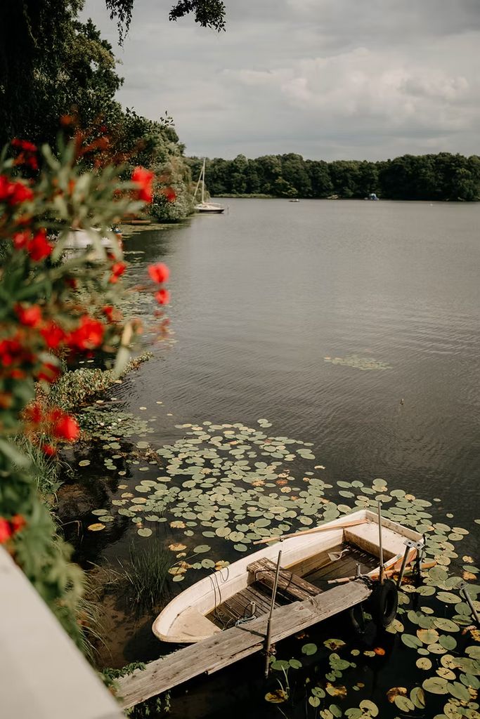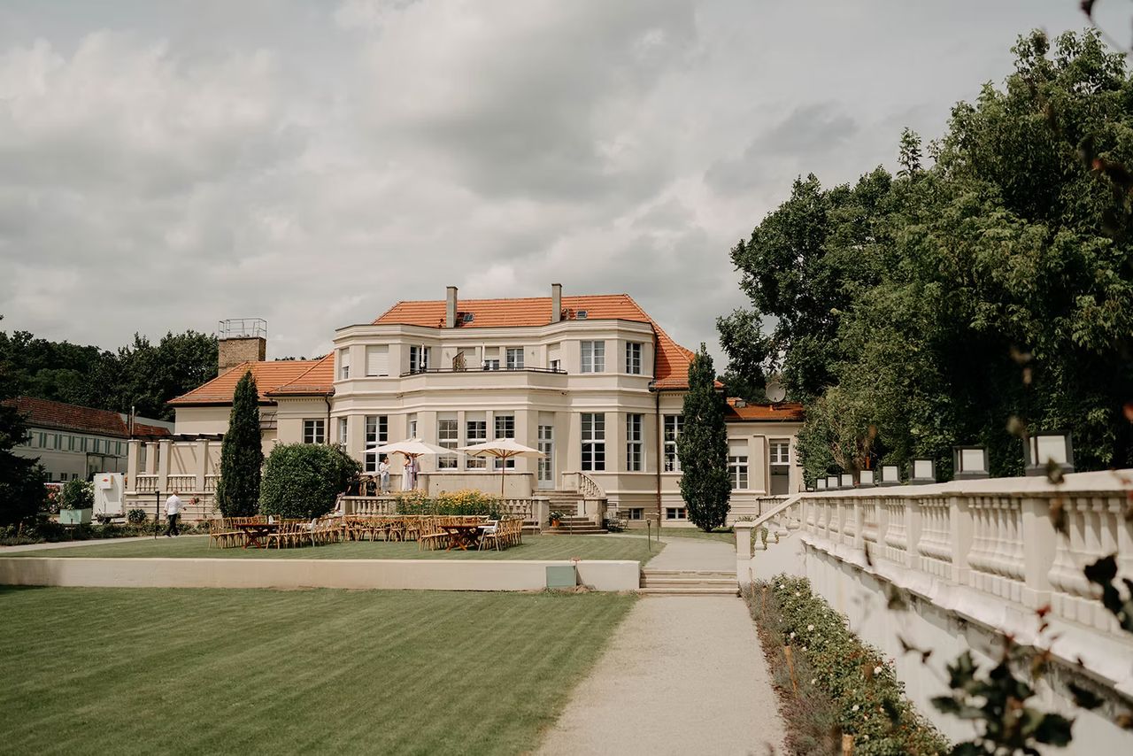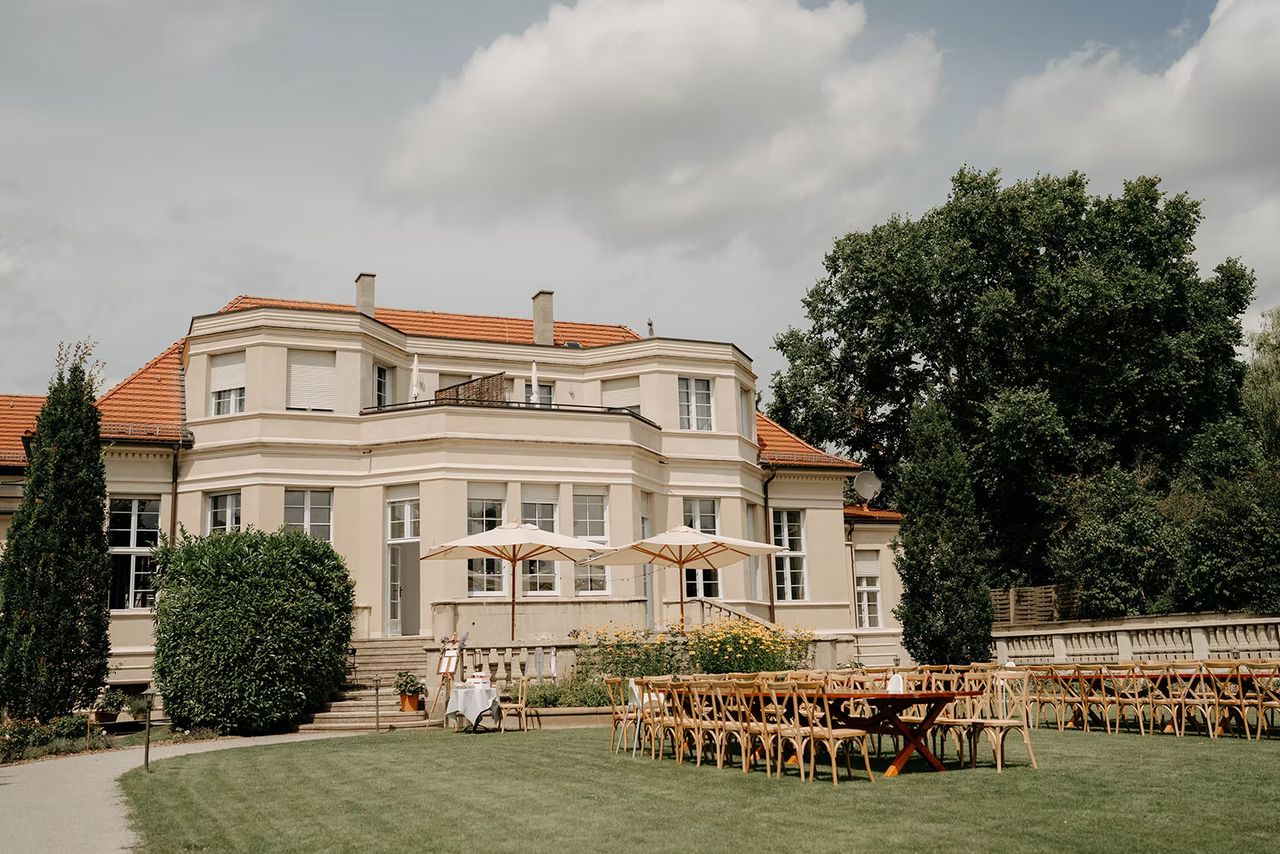 Die Villa steht in einer malerischen Umgebung direkt am Lehnitzsee und schafft so eine naturnahe, zugleich stilvolle Kulisse.