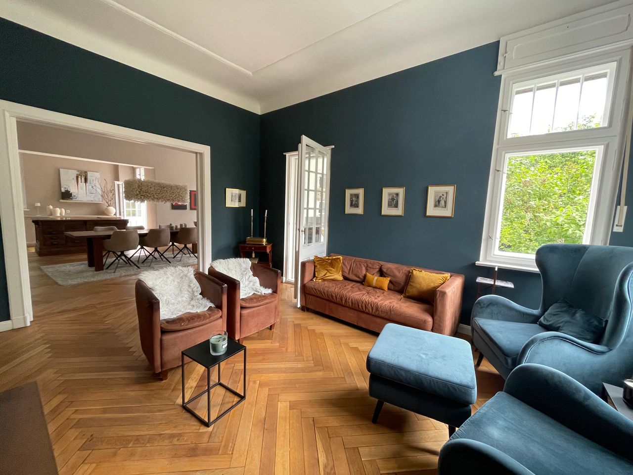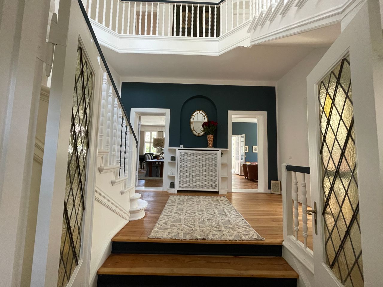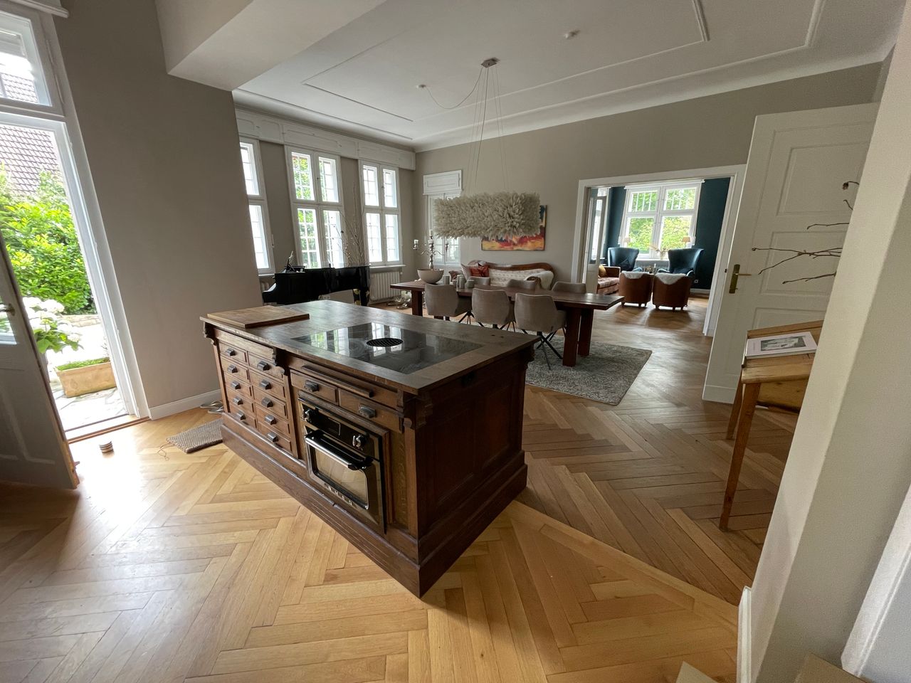 Kernstück ist ein wunderschönes grosszügiges Treppenhaus (7m hoch) und der offenen Küchen-, Ess- und Kaminzimmer Bereich. Es gehört eine abgeschlossene Souterrain Wohnung dazu (für Produktion) und ein Poolhaus mit einem 10mx4m Becken und eine Doppelgarage. Die Farben an den Wänden sind von Farrow and Ball und können je nach Motiv umgestreichen werden. Im EG liegt das original Parkett aus 1910 im OG Dielen. Das DG ist teilausgebaut mit einem Gästebereich, dazu ein riesiger unausgebauter Dachstuhl mit 9m Höhe Die Fenster sind Doppelkasten Fenster mit original Beschlägen ebenso haben die Türen die original Messingbeschläge.