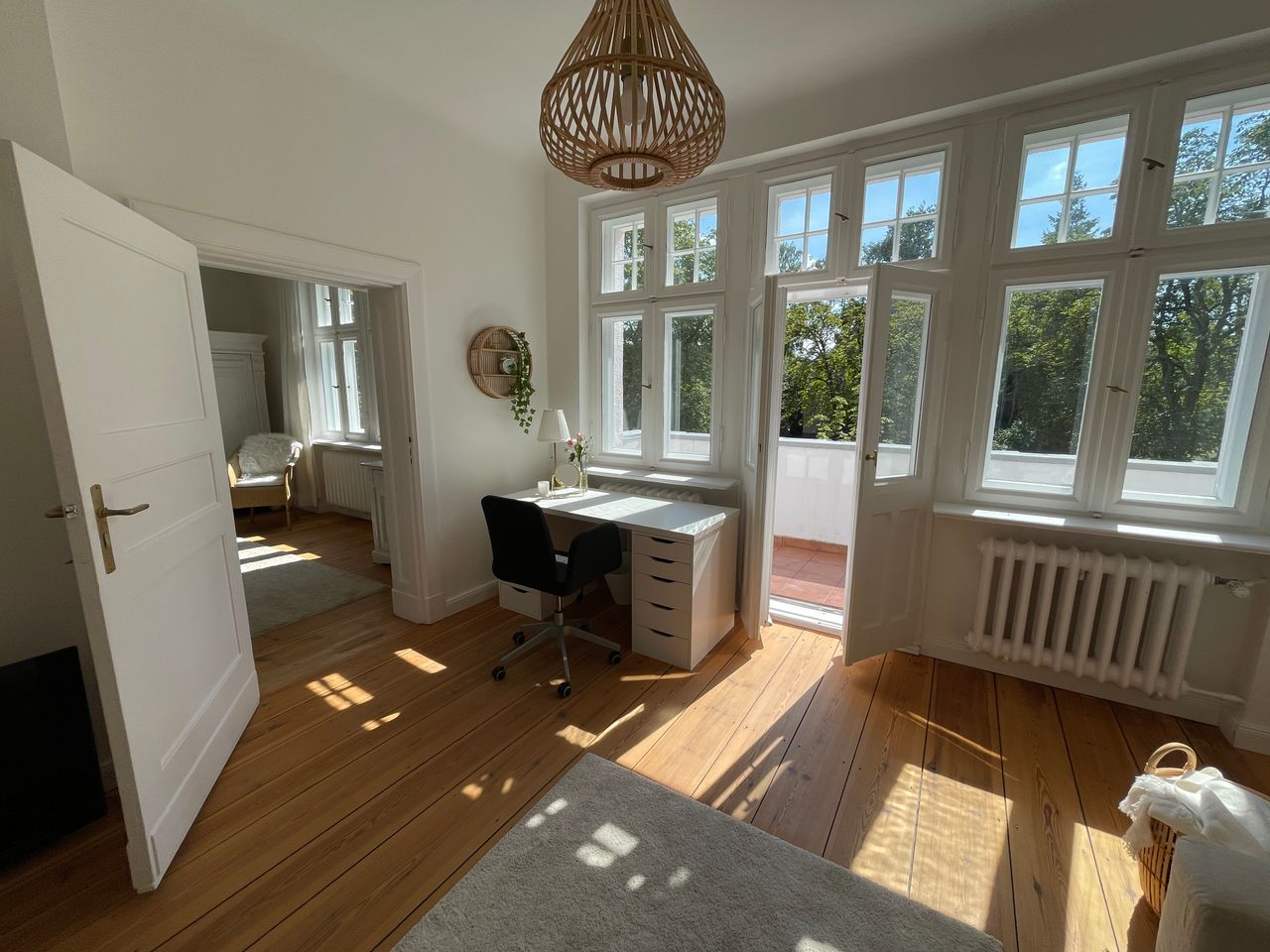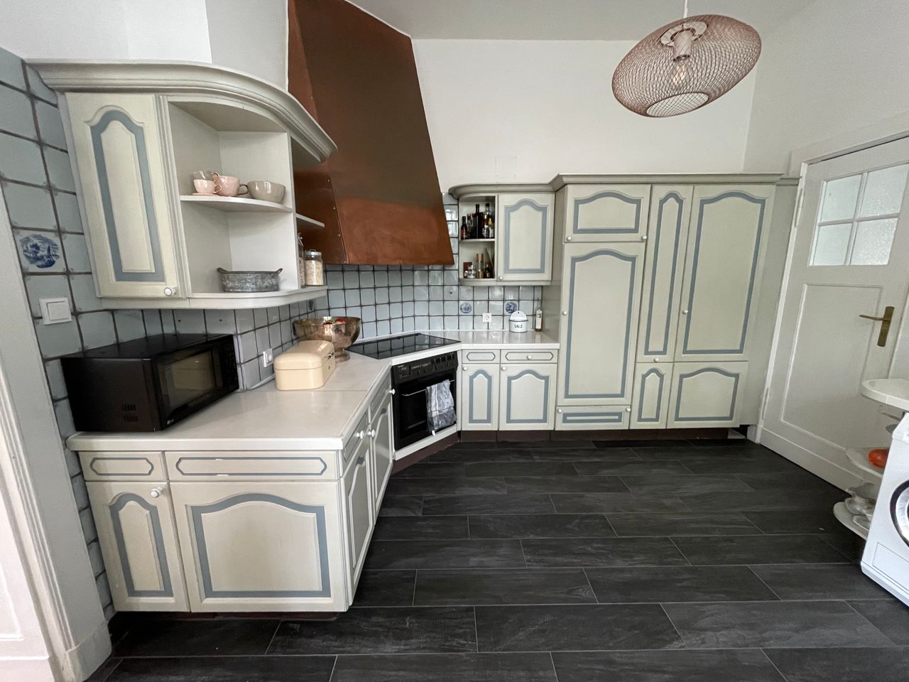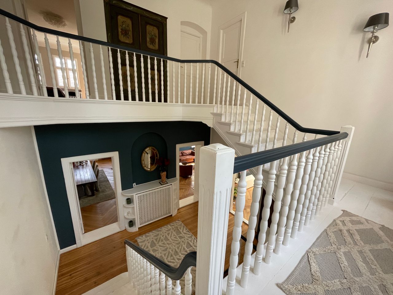 Kernstück ist ein wunderschönes grosszügiges Treppenhaus (7m hoch) und der offenen Küchen-, Ess- und Kaminzimmer Bereich. Es gehört eine abgeschlossene Souterrain Wohnung dazu (für Produktion) und ein Poolhaus mit einem 10mx4m Becken und eine Doppelgarage. Die Farben an den Wänden sind von Farrow and Ball und können je nach Motiv umgestreichen werden. Im EG liegt das original Parkett aus 1910 im OG Dielen. Das DG ist teilausgebaut mit einem Gästebereich, dazu ein riesiger unausgebauter Dachstuhl mit 9m Höhe Die Fenster sind Doppelkasten Fenster mit original Beschlägen ebenso haben die Türen die original Messingbeschläge.