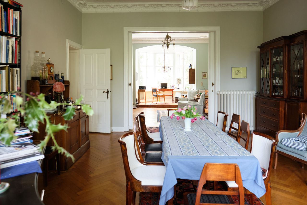 Im Erdgeschoss bietet die Raumfolge aus Wohnzimmer, Esszimmer mit Kamin sowie Wintergarten bzw. Bücherei tiefe Durchblicke für schöne Kameraeinstellungen.