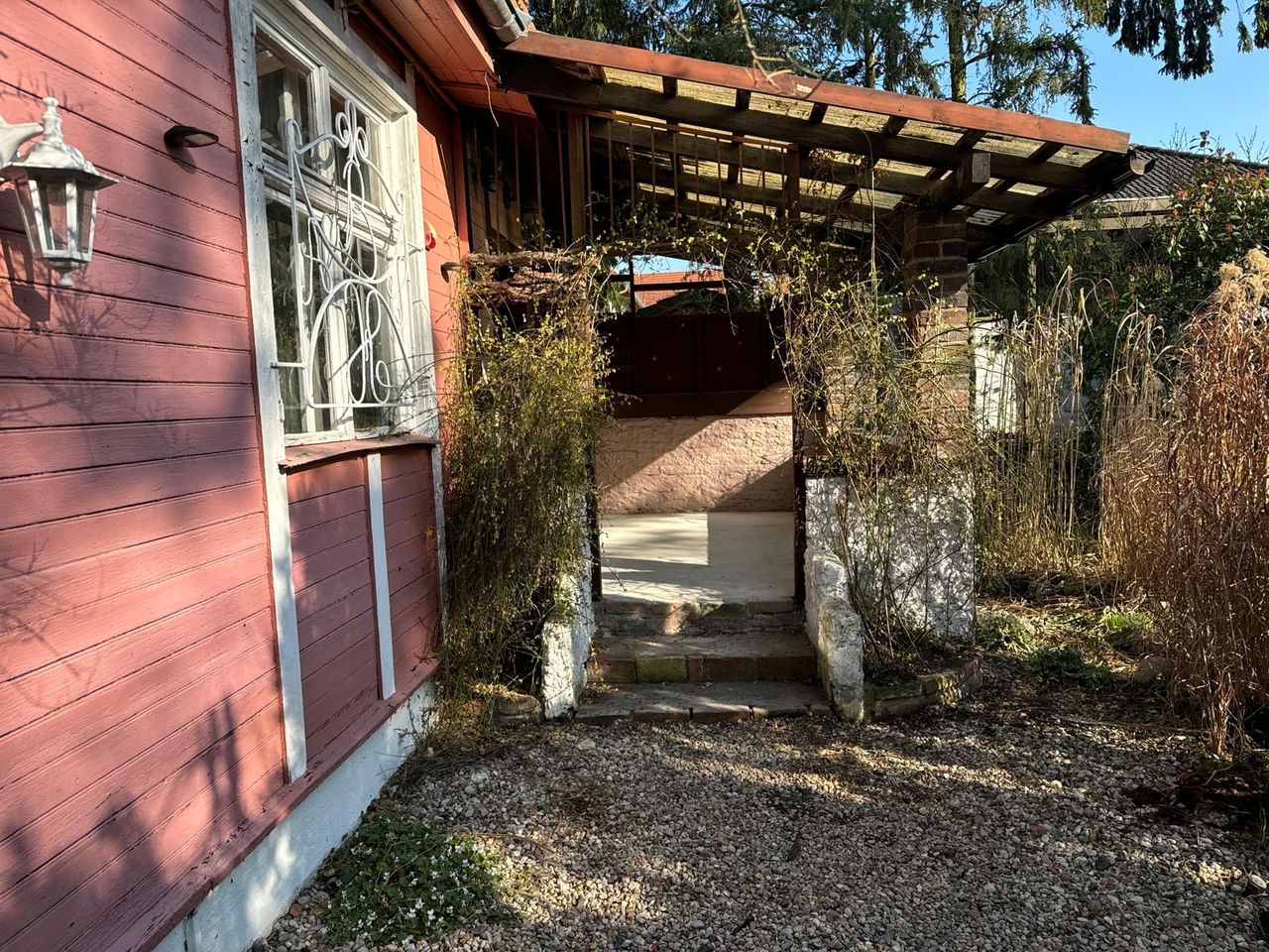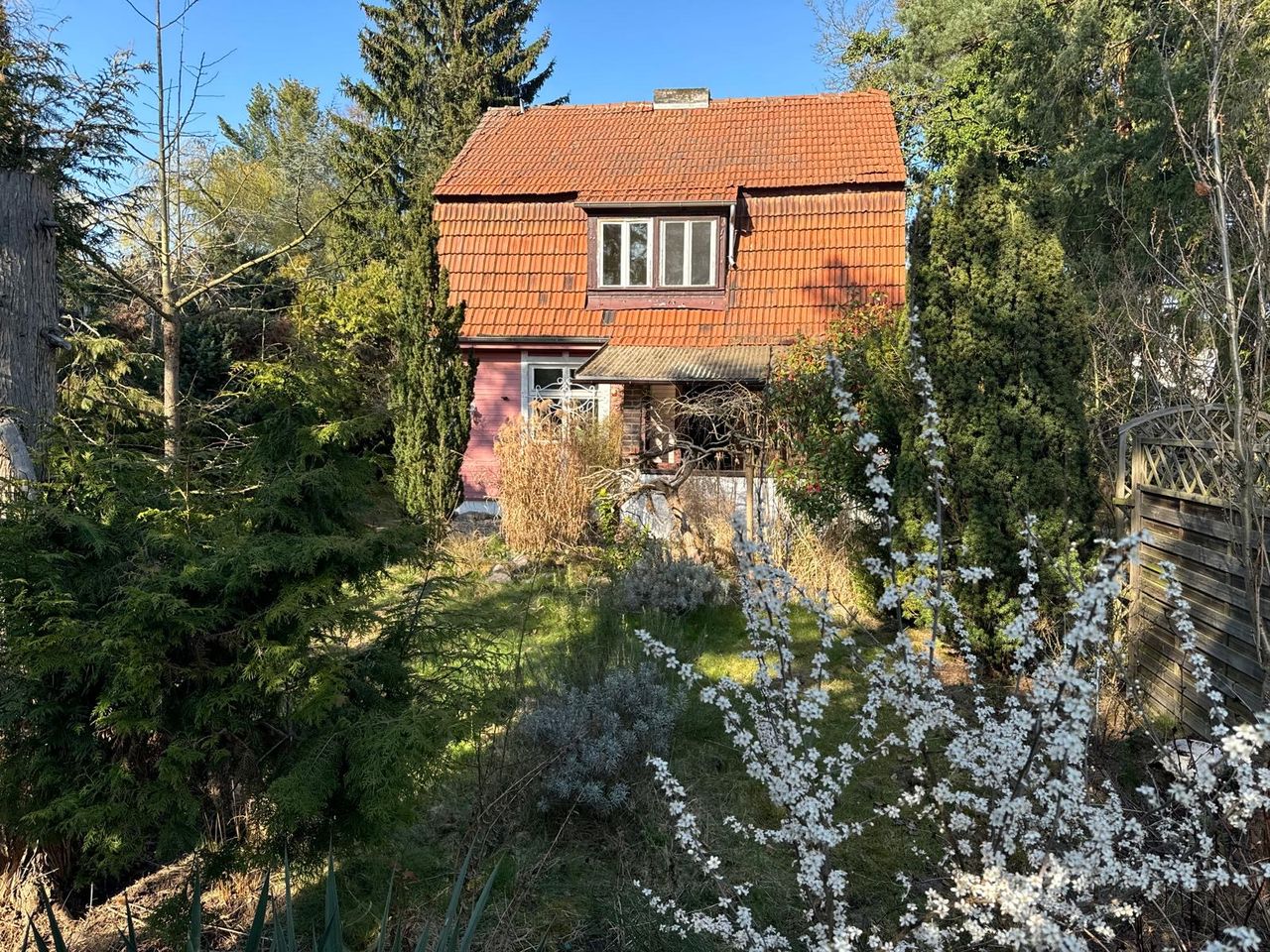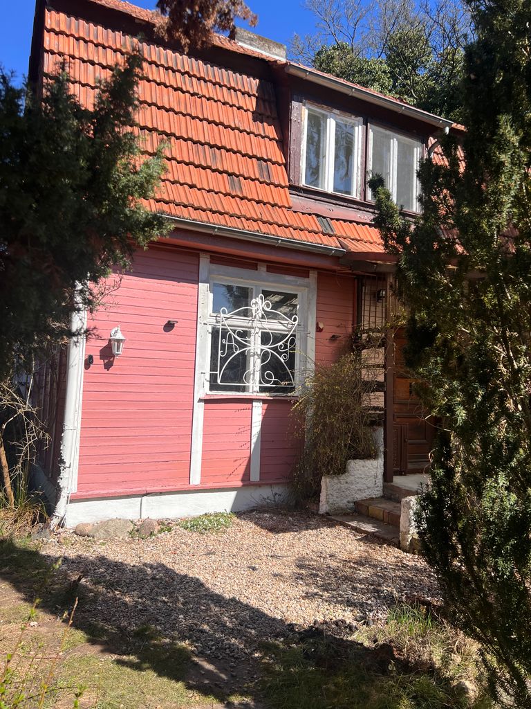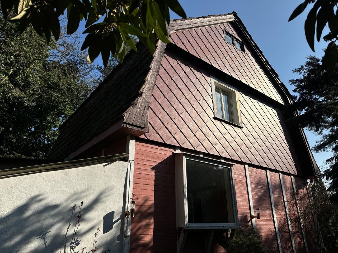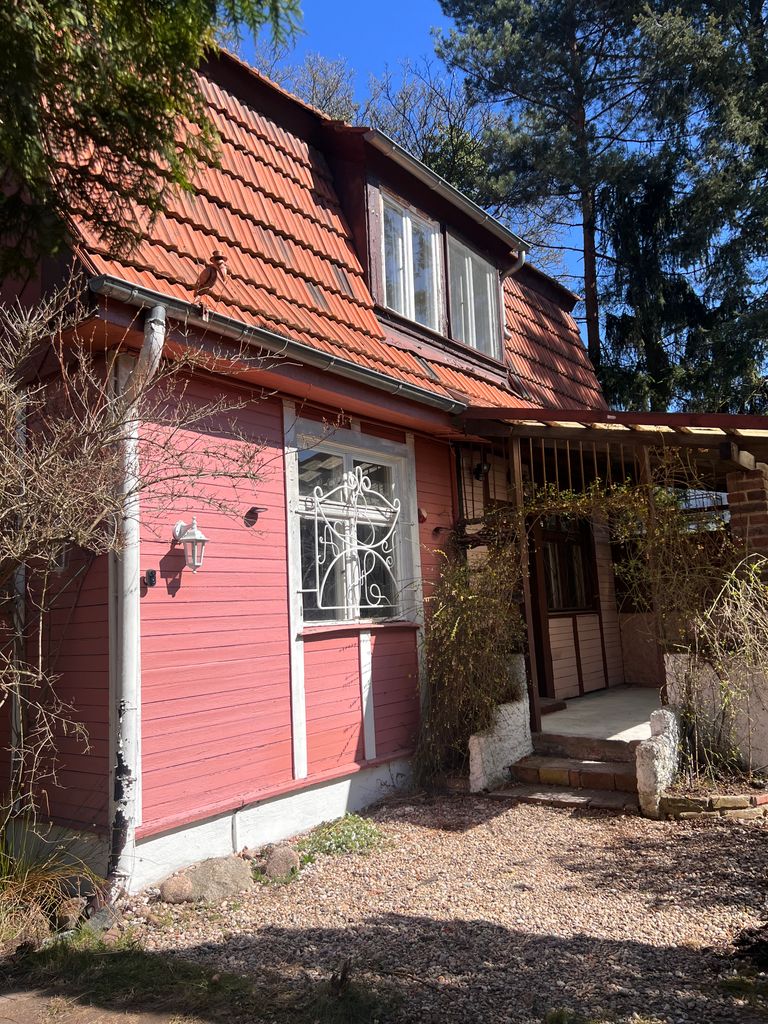 Ein Haus wie aus einer anderen Zeit – verspielt, eigenwillig, mit Geschichte. Die Villa Kunterbunt, gebaut 1931, liegt versteckt im Grünen, zwischen hohen Kiefern und wilden Sträuchern. Die rote Holzfassade, das originale Dach und der charmante Vorhof mit Natursteinweg machen diese Location zu einem echten Unikat.