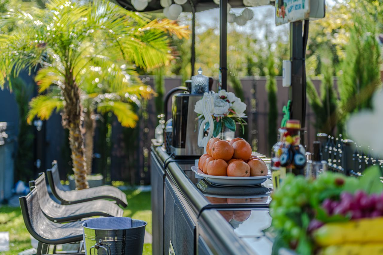 zahlreiche eingepflanzte tropische Pflanzen, wie Palmen, Oleander, Zitronen und Olivenbäumen mit Früchten usw.