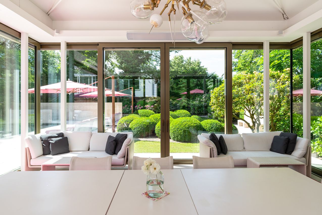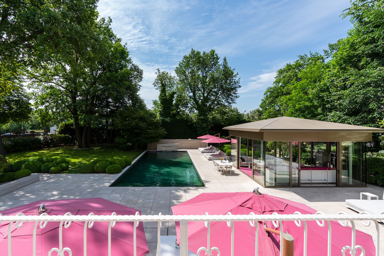 Das lichtdurchflutete Poolhaus verfügt über großzügige Fenstertüren, die sich vollständig öffnen lassen und in Kombination mit der Pool- und Gartenanlage ein einzigartiges Ambiente schaffen. Hier können bis zu 35 Personen sitzend Platz finden.