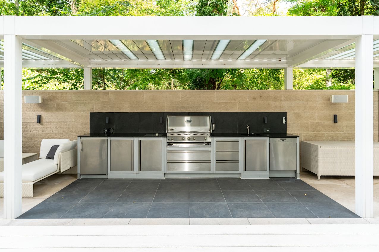 Die Outdoor-Küche ist mit einem Napoleon Grill ausgestattet und eignet sich ideal für stimmungsvolle Dinner-Events und Tastings. Modernste Lichttechnik, exotische Pflanzen und ein großzügiges Poolhaus mit voll ausgestatteter Bar runden das exklusive Angebot ab.