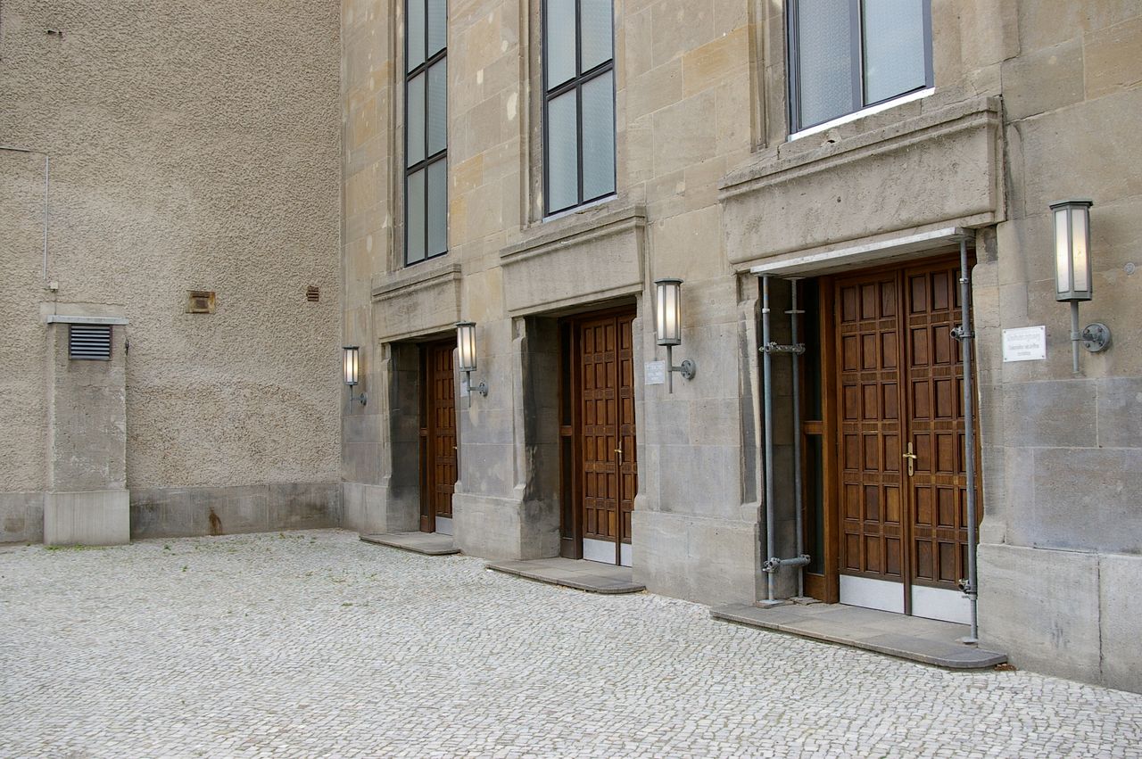 Errichtet 1913/14, wurde viel Wert gelegt auf eine monumentale Fassade, die in der Mitte wuchtig vorschwingt und mit Säulen Feierlichkeit signalisiert. Nach dem Krieg baute man das schwerzerstörte Haus wieder auf (1950-54): es entstand ein eiförmiger Zuschauerraum, die Ränge wurden amphitheatralisch im hinteren Bereich angeordnet. Seitlich erhielt das Foyer ebenfalls bespielbare Ausstellungsräume, angegliedert sind der Grüne und der Rote Salon.