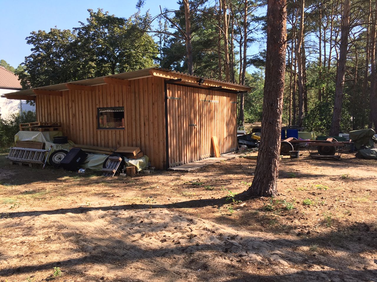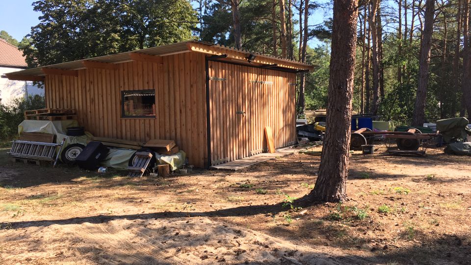 Es handelt sich um ein 3400qm Waldgrundstück mit einem Holzhaus 30 Minuten von Berlin. Das Haus, Baujahr 1978 hat ca. 70qm Wohnfläche und nebenan befindet sich eine kleine Werkstatt. Die Decke wurde entfernt und momentan liegt das Holz frei. Wände wurden rausgerissen, Fenster und Türen zum Teil schon erneuert. Starkstrom wurde neu gelegt und ist abgesichert! Das Ganze Haus ist noch nicht fertig verkabelt. Es gibt Wasser, eine wunderbare Außendusche und viel Wald. Der Mellensee mit Badestelle ist 400m entfernt und der Wald schließt direkt am Haus an.
