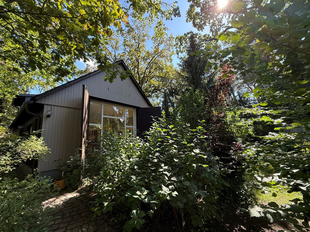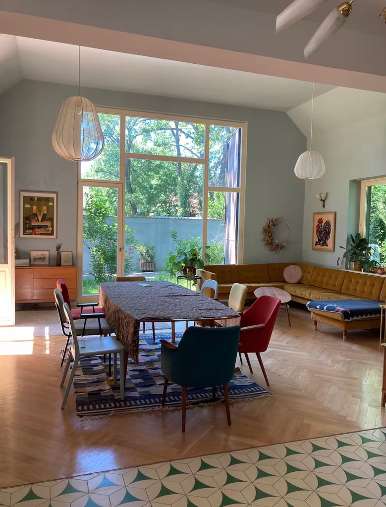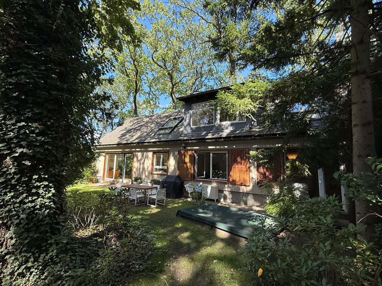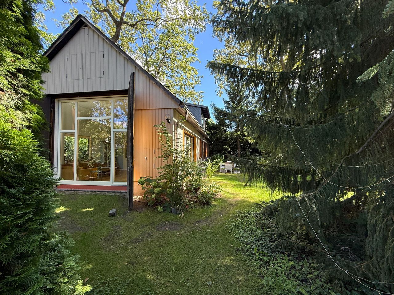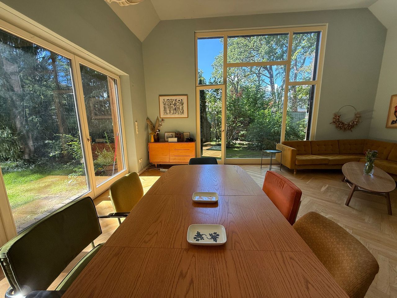 Lichtdurchflutetes Einfamilienhaus mit Satteldach, heller Gaube und umlaufendem, eingewachsenem Garten. Das Herzstück ist ein großzügiger Wohn-/Essbereich mit sehr hoher Decke und einer raumhohen Fensterfront zum Grün – ideal für Daylight-Drehs, Familien-Szenen, Werbe- und Interior-Shootings. Mid-Century-/ BauhausMobiliar, Eichen-Fischgrätparkett und sanfte Wandfarben erzeugen eine warme, skandinavische Atmosphäre. Highlights Riesige Fensterfronten zum Garten, mehrere Schiebe-/Terrassentüren Sehr hohe Decken (Kathedraldecke) im Wohnraum, zusätzliche Dachgaube Authentisches Mid-Century-Setting: Ecksofa in Senfton, Design-Stühle, Sideboards, Vitrinen, Bücherwand Heller Eichenparkettboden im Fischgrätmuster Umlaufender, blickgeschützter Garten mit alten Bäumen, Rasenflächen und Terrasse Grundrisse/Schnitte vorhanden (EG & DG) – klare Achsen und gute Stell- und Riggingmöglichkeiten Räume & Motive Wohn-/Essbereich: Offener, sehr weiter Raum mit großem Esstisch, Lounge-Ecke, Coffeetable; mehrere Blickachsen in den Garten. Küche: Separat gelegen, anschließbar an den Flur und den Wohnbereich. Schlaf-/Arbeitszimmer: Mehrere Zimmer auf EG und DG (siehe Pläne), neutrale, wohnliche Optik. Bäder: Tageslichtbad im Dachgeschoss (Wanne), weiter(es) Bad im Erdgeschoss. Flure/Treppenhaus: Geradlinige Wegeführung, Holz und Weißtöne. Dach & Fassade: Satteldach mit großem, modernem Zwerchgiebel, Holzverschalung – charmante Außenmotive. Außenbereich Große Rasenflächen, Terrassenbereiche und natürliche Schattenzonen durch hohe Bäume Ruhige, grüne Umgebung; Haus liegt gut eingebettet im Garten – Privatheit für Team & Cast Licht & Akustik Weiches, gefiltertes Tageslicht durch die Bäume; durch die bodentiefen Fenster ganztägig sehr gute, gleichmäßige Ausleuchtung Ruhige Lage, angenehme Raumakustik (Vorhänge, Polstermöbel, Bücherregale) Logistik Direkter ebenerdiger Zugang zum Wohnraum über die Terrassentüren – ideal für Equipment und Möbelfahrten Ausreichend Stellflächen im Garten für Technik, Maske/Styling und Basecamp (nach Absprache) Mobiliar kann – schonend – nach Absprache umgestellt werden. Strom über Haushaltsanschlüsse; zusätzliche Absicherung nach Bedarf möglich. Looks & Genres Familienidylle, skandinavisches Design, Künstlerhaus/Atelier-Vibe, 60s/70s-Reminiszenz, Natur-Rückzugsort, stilvolle Werbemotive (Home, Food, Interior, Lifestyle). Hinweise Bitte Begehung/Tech Recce vorab. Schutz von Parkett und Gartenflächen (Boden-/Rasenschutz) erwünscht. Haus regennass- und nächtetauglich; Nachtstimmungen lassen sich durch die große Fensterfront wirkungsvoll inszenieren.