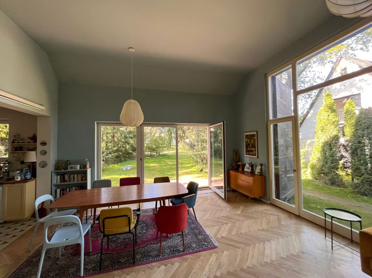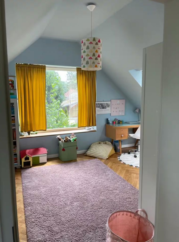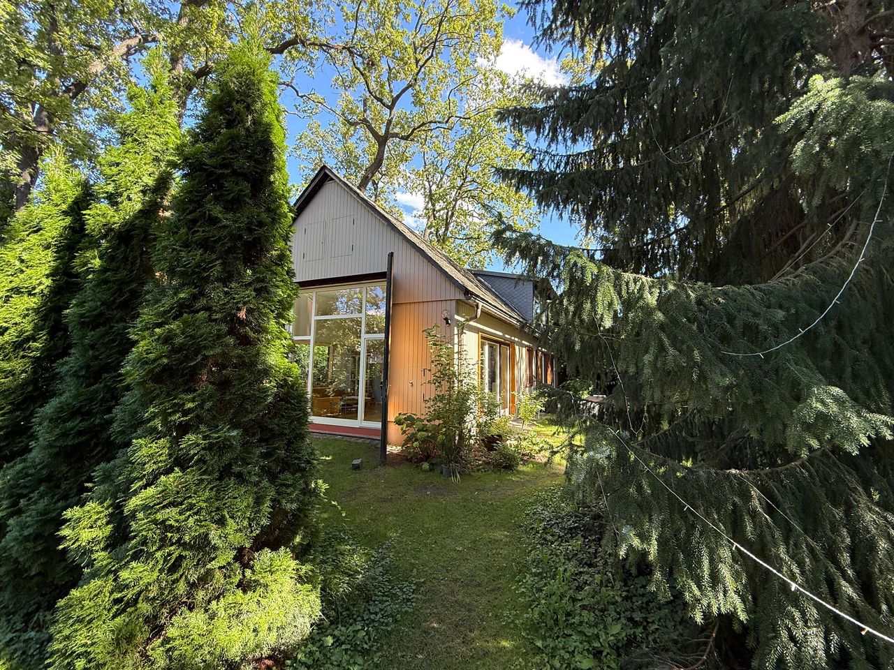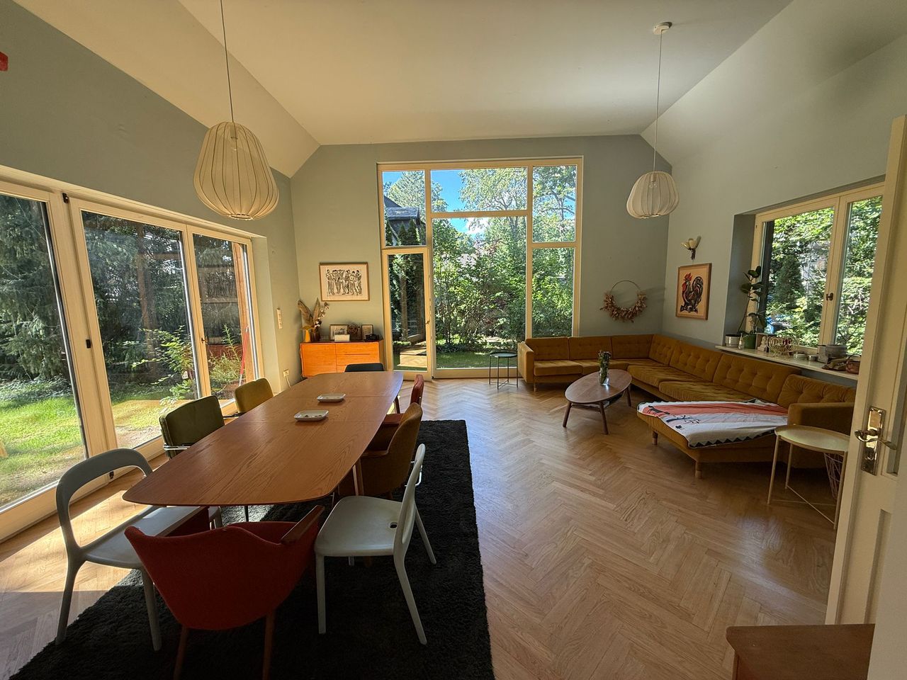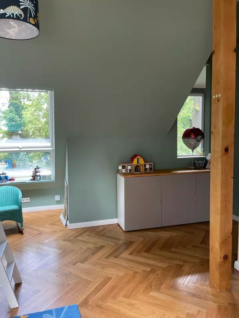 Lichtdurchflutetes Einfamilienhaus mit Satteldach, heller Gaube und umlaufendem, eingewachsenem Garten. Das Herzstück ist ein großzügiger Wohn-/Essbereich mit sehr hoher Decke und einer raumhohen Fensterfront zum Grün – ideal für Daylight-Drehs, Familien-Szenen, Werbe- und Interior-Shootings. Mid-Century-/ BauhausMobiliar, Eichen-Fischgrätparkett und sanfte Wandfarben erzeugen eine warme, skandinavische Atmosphäre. Highlights Riesige Fensterfronten zum Garten, mehrere Schiebe-/Terrassentüren Sehr hohe Decken (Kathedraldecke) im Wohnraum, zusätzliche Dachgaube Authentisches Mid-Century-Setting: Ecksofa in Senfton, Design-Stühle, Sideboards, Vitrinen, Bücherwand Heller Eichenparkettboden im Fischgrätmuster Umlaufender, blickgeschützter Garten mit alten Bäumen, Rasenflächen und Terrasse Grundrisse/Schnitte vorhanden (EG & DG) – klare Achsen und gute Stell- und Riggingmöglichkeiten Räume & Motive Wohn-/Essbereich: Offener, sehr weiter Raum mit großem Esstisch, Lounge-Ecke, Coffeetable; mehrere Blickachsen in den Garten. Küche: Separat gelegen, anschließbar an den Flur und den Wohnbereich. Schlaf-/Arbeitszimmer: Mehrere Zimmer auf EG und DG (siehe Pläne), neutrale, wohnliche Optik. Bäder: Tageslichtbad im Dachgeschoss (Wanne), weiter(es) Bad im Erdgeschoss. Flure/Treppenhaus: Geradlinige Wegeführung, Holz und Weißtöne. Dach & Fassade: Satteldach mit großem, modernem Zwerchgiebel, Holzverschalung – charmante Außenmotive. Außenbereich Große Rasenflächen, Terrassenbereiche und natürliche Schattenzonen durch hohe Bäume Ruhige, grüne Umgebung; Haus liegt gut eingebettet im Garten – Privatheit für Team & Cast Licht & Akustik Weiches, gefiltertes Tageslicht durch die Bäume; durch die bodentiefen Fenster ganztägig sehr gute, gleichmäßige Ausleuchtung Ruhige Lage, angenehme Raumakustik (Vorhänge, Polstermöbel, Bücherregale) Logistik Direkter ebenerdiger Zugang zum Wohnraum über die Terrassentüren – ideal für Equipment und Möbelfahrten Ausreichend Stellflächen im Garten für Technik, Maske/Styling und Basecamp (nach Absprache) Mobiliar kann – schonend – nach Absprache umgestellt werden. Strom über Haushaltsanschlüsse; zusätzliche Absicherung nach Bedarf möglich. Looks & Genres Familienidylle, skandinavisches Design, Künstlerhaus/Atelier-Vibe, 60s/70s-Reminiszenz, Natur-Rückzugsort, stilvolle Werbemotive (Home, Food, Interior, Lifestyle). Hinweise Bitte Begehung/Tech Recce vorab. Schutz von Parkett und Gartenflächen (Boden-/Rasenschutz) erwünscht. Haus regennass- und nächtetauglich; Nachtstimmungen lassen sich durch die große Fensterfront wirkungsvoll inszenieren.