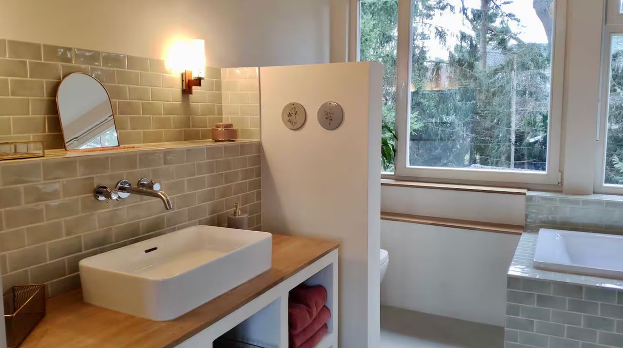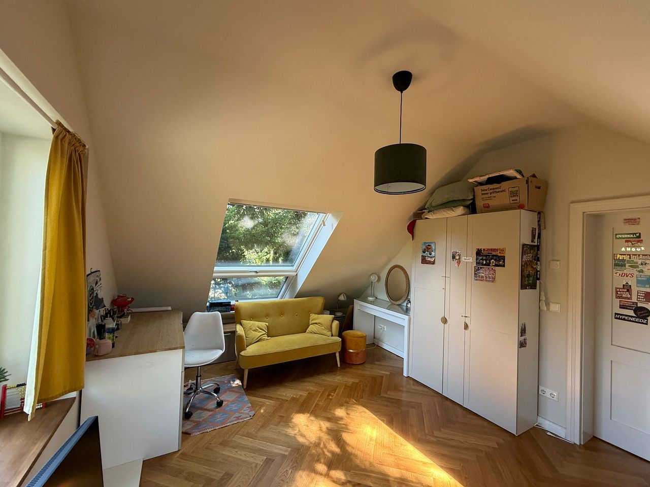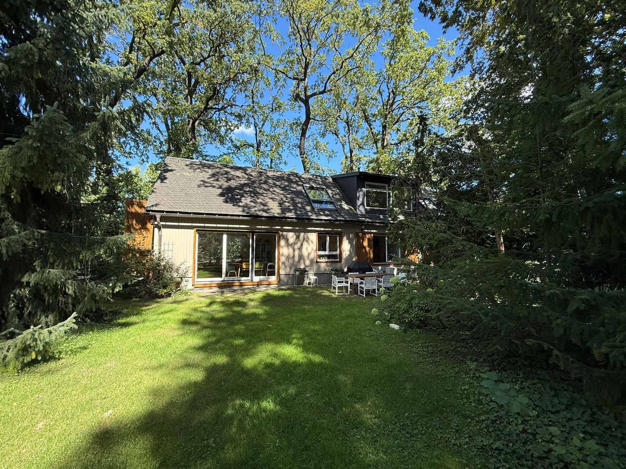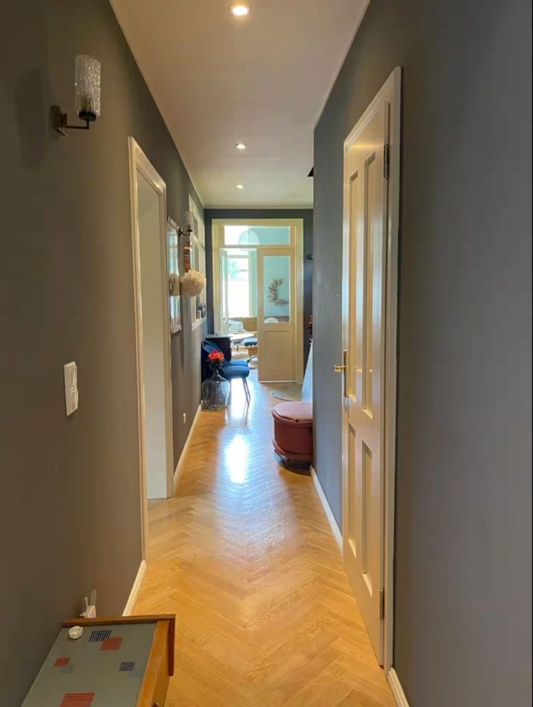 Lichtdurchflutetes Einfamilienhaus mit Satteldach, heller Gaube und umlaufendem, eingewachsenem Garten. Das Herzstück ist ein großzügiger Wohn-/Essbereich mit sehr hoher Decke und einer raumhohen Fensterfront zum Grün – ideal für Daylight-Drehs, Familien-Szenen, Werbe- und Interior-Shootings. Mid-Century-/ BauhausMobiliar, Eichen-Fischgrätparkett und sanfte Wandfarben erzeugen eine warme, skandinavische Atmosphäre. Highlights Riesige Fensterfronten zum Garten, mehrere Schiebe-/Terrassentüren Sehr hohe Decken (Kathedraldecke) im Wohnraum, zusätzliche Dachgaube Authentisches Mid-Century-Setting: Ecksofa in Senfton, Design-Stühle, Sideboards, Vitrinen, Bücherwand Heller Eichenparkettboden im Fischgrätmuster Umlaufender, blickgeschützter Garten mit alten Bäumen, Rasenflächen und Terrasse Grundrisse/Schnitte vorhanden (EG & DG) – klare Achsen und gute Stell- und Riggingmöglichkeiten Räume & Motive Wohn-/Essbereich: Offener, sehr weiter Raum mit großem Esstisch, Lounge-Ecke, Coffeetable; mehrere Blickachsen in den Garten. Küche: Separat gelegen, anschließbar an den Flur und den Wohnbereich. Schlaf-/Arbeitszimmer: Mehrere Zimmer auf EG und DG (siehe Pläne), neutrale, wohnliche Optik. Bäder: Tageslichtbad im Dachgeschoss (Wanne), weiter(es) Bad im Erdgeschoss. Flure/Treppenhaus: Geradlinige Wegeführung, Holz und Weißtöne. Dach & Fassade: Satteldach mit großem, modernem Zwerchgiebel, Holzverschalung – charmante Außenmotive. Außenbereich Große Rasenflächen, Terrassenbereiche und natürliche Schattenzonen durch hohe Bäume Ruhige, grüne Umgebung; Haus liegt gut eingebettet im Garten – Privatheit für Team & Cast Licht & Akustik Weiches, gefiltertes Tageslicht durch die Bäume; durch die bodentiefen Fenster ganztägig sehr gute, gleichmäßige Ausleuchtung Ruhige Lage, angenehme Raumakustik (Vorhänge, Polstermöbel, Bücherregale) Logistik Direkter ebenerdiger Zugang zum Wohnraum über die Terrassentüren – ideal für Equipment und Möbelfahrten Ausreichend Stellflächen im Garten für Technik, Maske/Styling und Basecamp (nach Absprache) Mobiliar kann – schonend – nach Absprache umgestellt werden. Strom über Haushaltsanschlüsse; zusätzliche Absicherung nach Bedarf möglich. Looks & Genres Familienidylle, skandinavisches Design, Künstlerhaus/Atelier-Vibe, 60s/70s-Reminiszenz, Natur-Rückzugsort, stilvolle Werbemotive (Home, Food, Interior, Lifestyle). Hinweise Bitte Begehung/Tech Recce vorab. Schutz von Parkett und Gartenflächen (Boden-/Rasenschutz) erwünscht. Haus regennass- und nächtetauglich; Nachtstimmungen lassen sich durch die große Fensterfront wirkungsvoll inszenieren.
