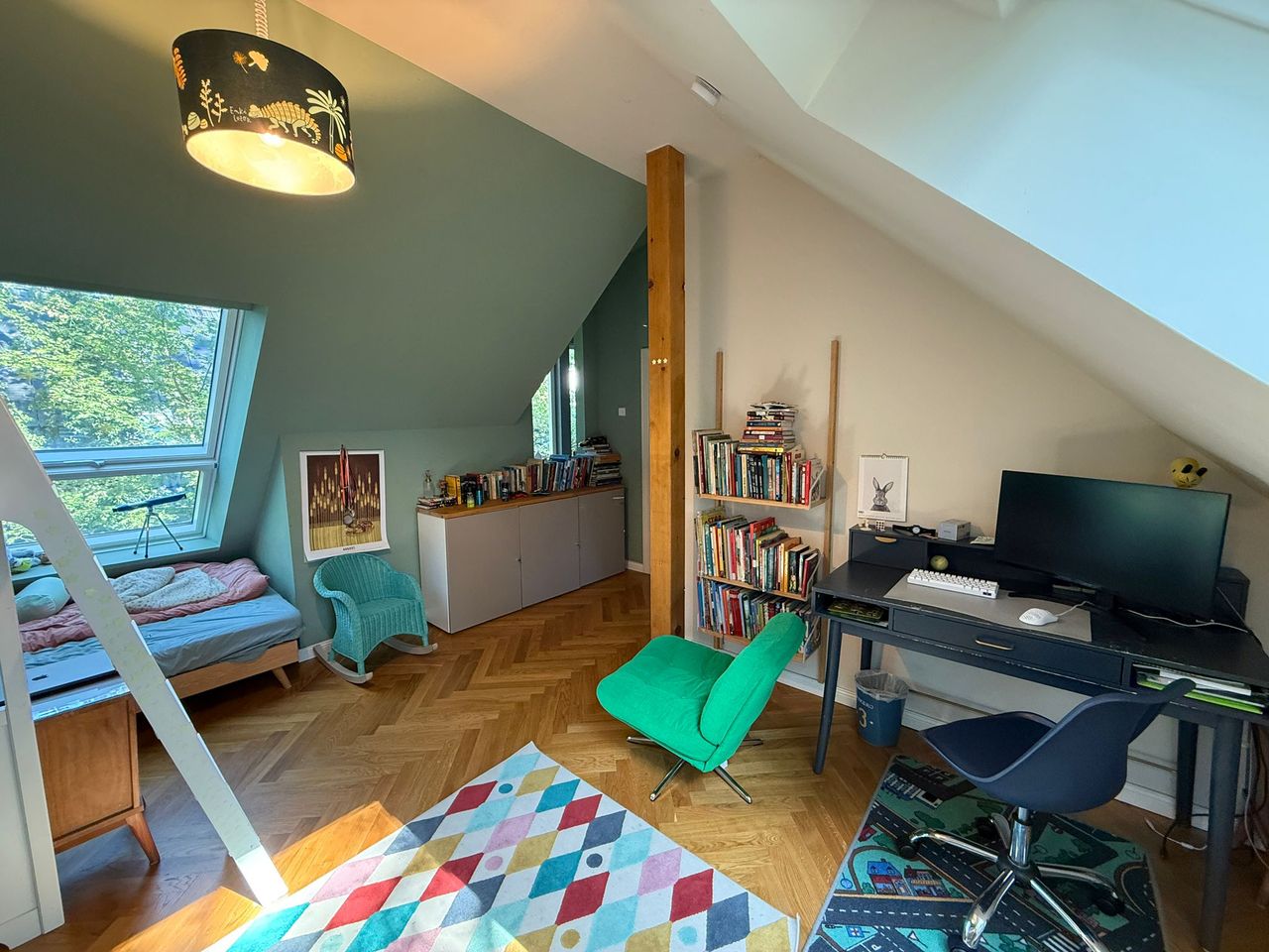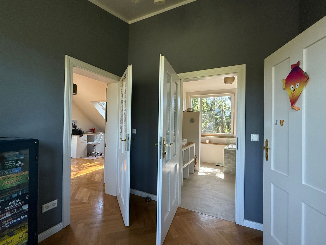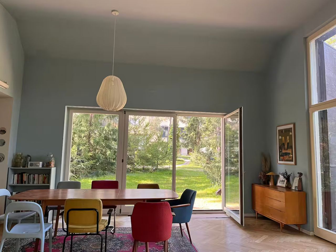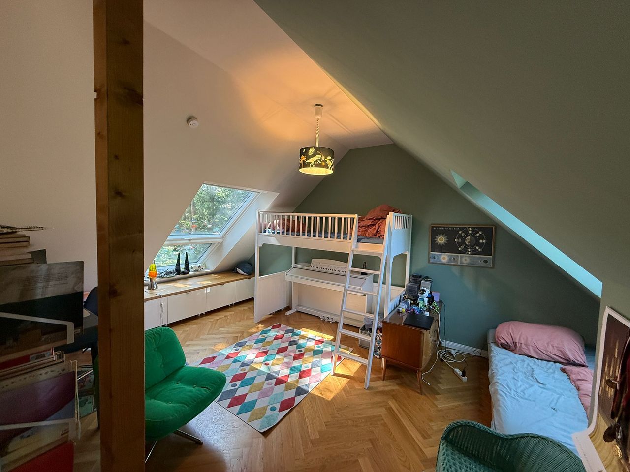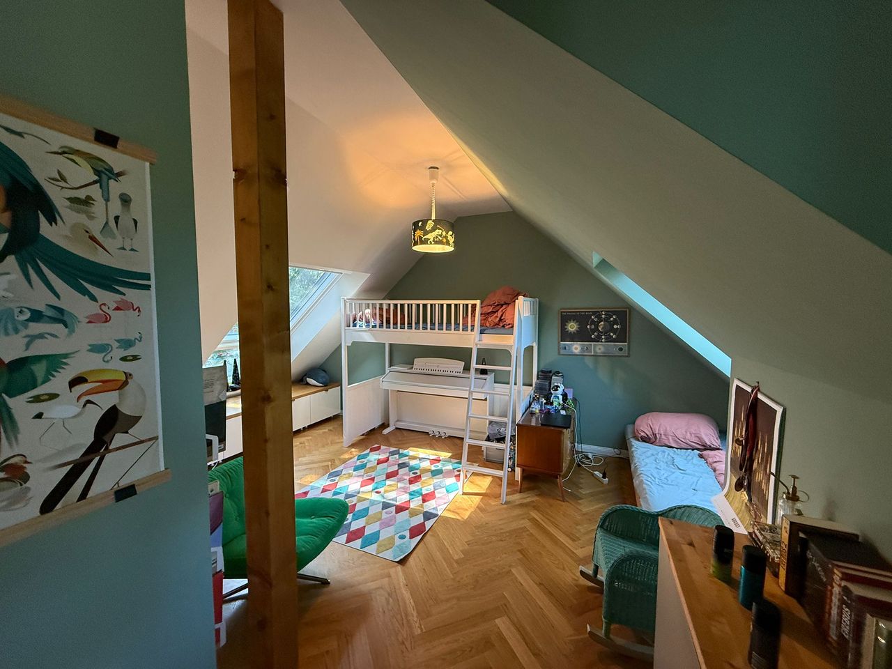 Lichtdurchflutetes Einfamilienhaus mit Satteldach, heller Gaube und umlaufendem, eingewachsenem Garten. Das Herzstück ist ein großzügiger Wohn-/Essbereich mit sehr hoher Decke und einer raumhohen Fensterfront zum Grün – ideal für Daylight-Drehs, Familien-Szenen, Werbe- und Interior-Shootings. Mid-Century-/ BauhausMobiliar, Eichen-Fischgrätparkett und sanfte Wandfarben erzeugen eine warme, skandinavische Atmosphäre. Highlights Riesige Fensterfronten zum Garten, mehrere Schiebe-/Terrassentüren Sehr hohe Decken (Kathedraldecke) im Wohnraum, zusätzliche Dachgaube Authentisches Mid-Century-Setting: Ecksofa in Senfton, Design-Stühle, Sideboards, Vitrinen, Bücherwand Heller Eichenparkettboden im Fischgrätmuster Umlaufender, blickgeschützter Garten mit alten Bäumen, Rasenflächen und Terrasse Grundrisse/Schnitte vorhanden (EG & DG) – klare Achsen und gute Stell- und Riggingmöglichkeiten Räume & Motive Wohn-/Essbereich: Offener, sehr weiter Raum mit großem Esstisch, Lounge-Ecke, Coffeetable; mehrere Blickachsen in den Garten. Küche: Separat gelegen, anschließbar an den Flur und den Wohnbereich. Schlaf-/Arbeitszimmer: Mehrere Zimmer auf EG und DG (siehe Pläne), neutrale, wohnliche Optik. Bäder: Tageslichtbad im Dachgeschoss (Wanne), weiter(es) Bad im Erdgeschoss. Flure/Treppenhaus: Geradlinige Wegeführung, Holz und Weißtöne. Dach & Fassade: Satteldach mit großem, modernem Zwerchgiebel, Holzverschalung – charmante Außenmotive. Außenbereich Große Rasenflächen, Terrassenbereiche und natürliche Schattenzonen durch hohe Bäume Ruhige, grüne Umgebung; Haus liegt gut eingebettet im Garten – Privatheit für Team & Cast Licht & Akustik Weiches, gefiltertes Tageslicht durch die Bäume; durch die bodentiefen Fenster ganztägig sehr gute, gleichmäßige Ausleuchtung Ruhige Lage, angenehme Raumakustik (Vorhänge, Polstermöbel, Bücherregale) Logistik Direkter ebenerdiger Zugang zum Wohnraum über die Terrassentüren – ideal für Equipment und Möbelfahrten Ausreichend Stellflächen im Garten für Technik, Maske/Styling und Basecamp (nach Absprache) Mobiliar kann – schonend – nach Absprache umgestellt werden. Strom über Haushaltsanschlüsse; zusätzliche Absicherung nach Bedarf möglich. Looks & Genres Familienidylle, skandinavisches Design, Künstlerhaus/Atelier-Vibe, 60s/70s-Reminiszenz, Natur-Rückzugsort, stilvolle Werbemotive (Home, Food, Interior, Lifestyle). Hinweise Bitte Begehung/Tech Recce vorab. Schutz von Parkett und Gartenflächen (Boden-/Rasenschutz) erwünscht. Haus regennass- und nächtetauglich; Nachtstimmungen lassen sich durch die große Fensterfront wirkungsvoll inszenieren.