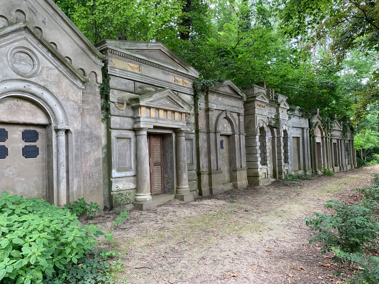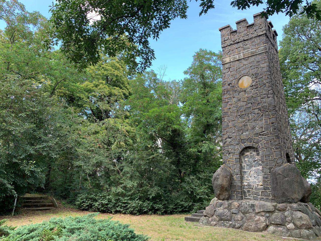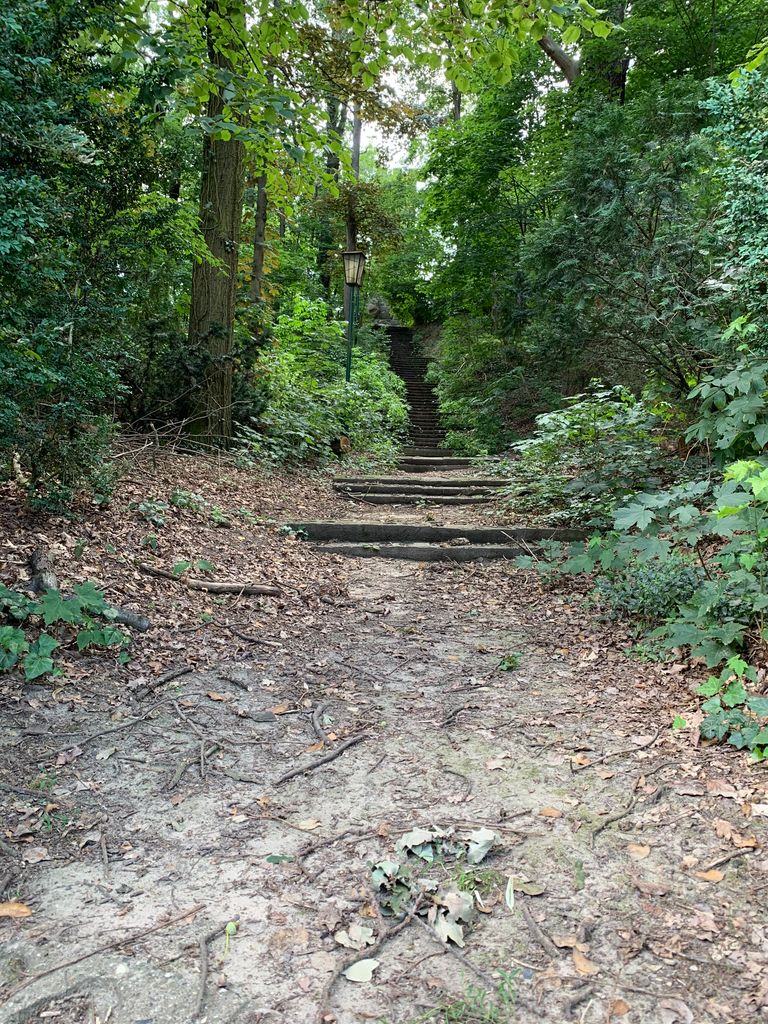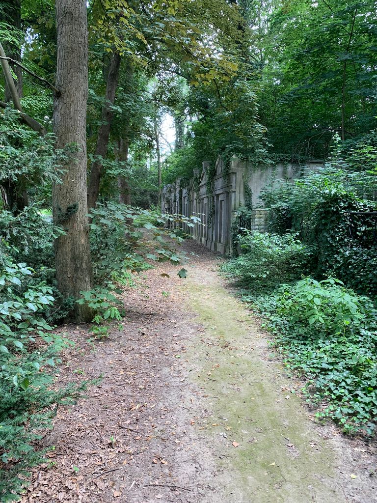 Der Wanderweg führt vorbei an Gruften und am Martinsturm. Der idyllisch Weg wird von Bäumen umrandet.