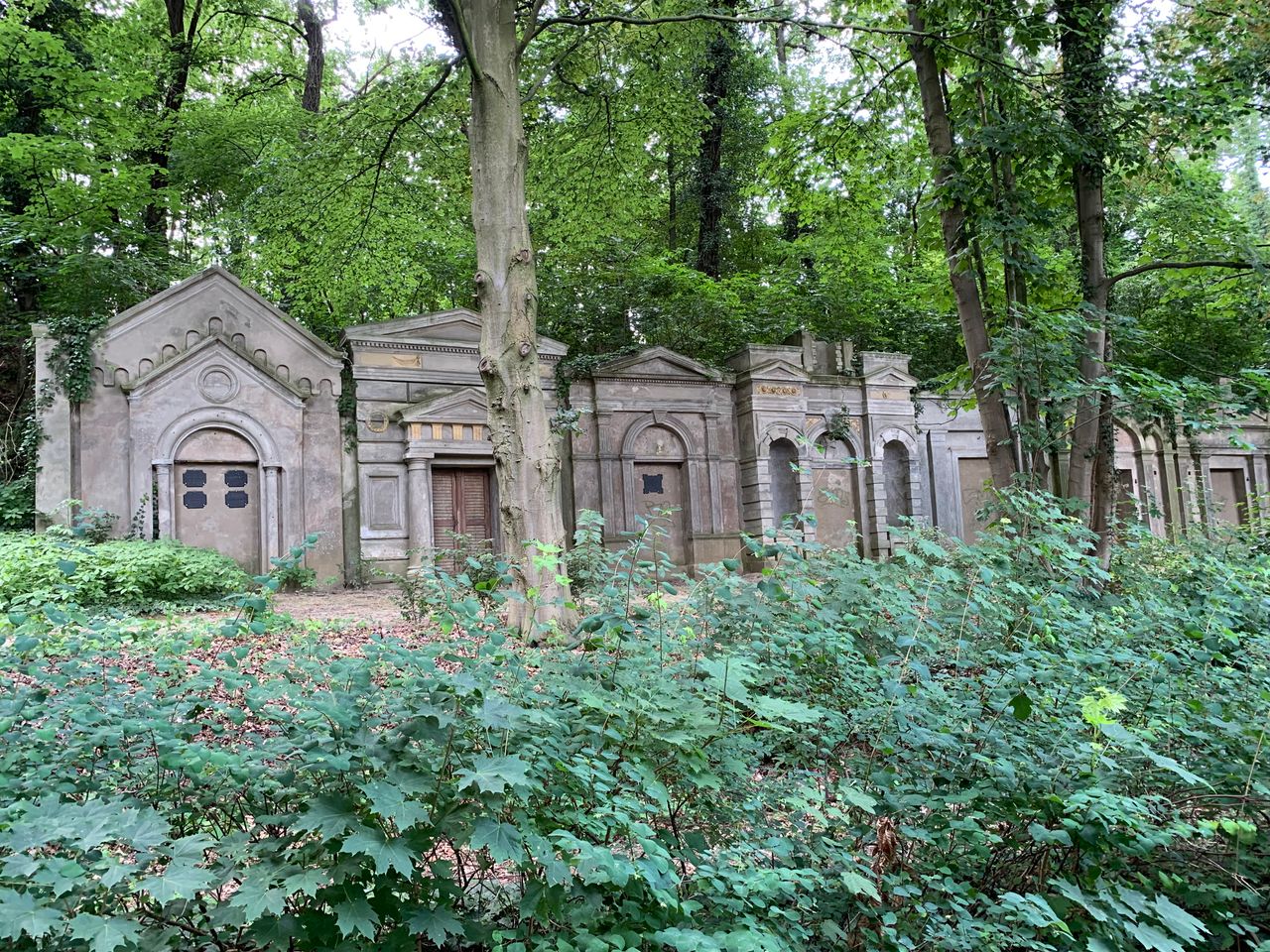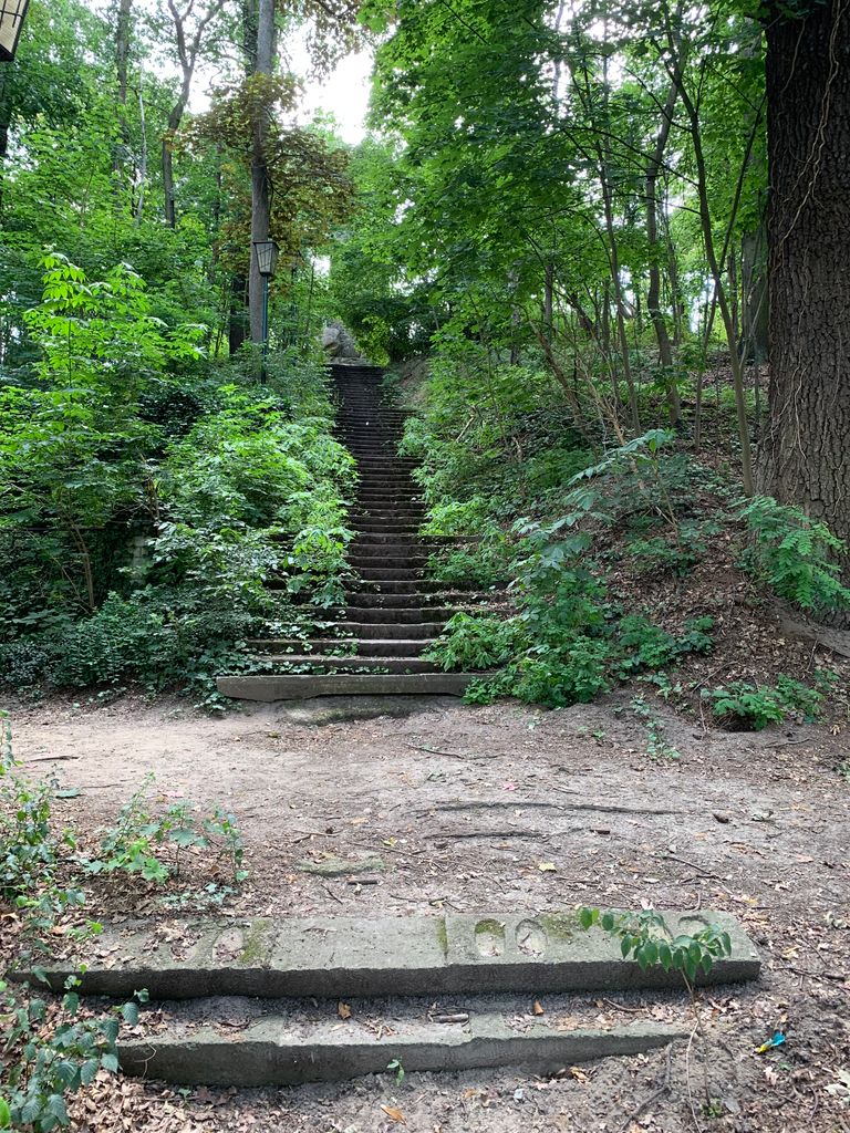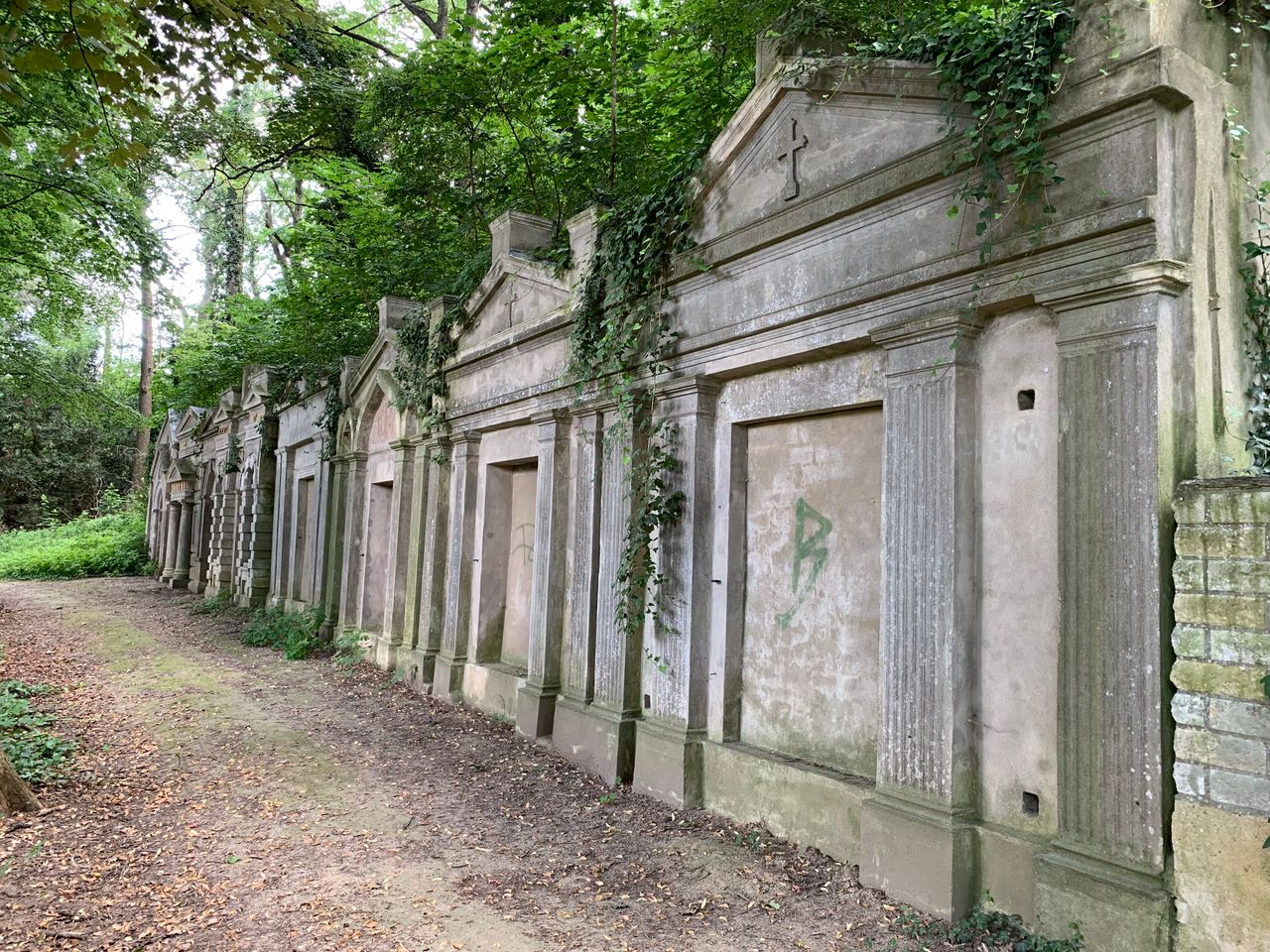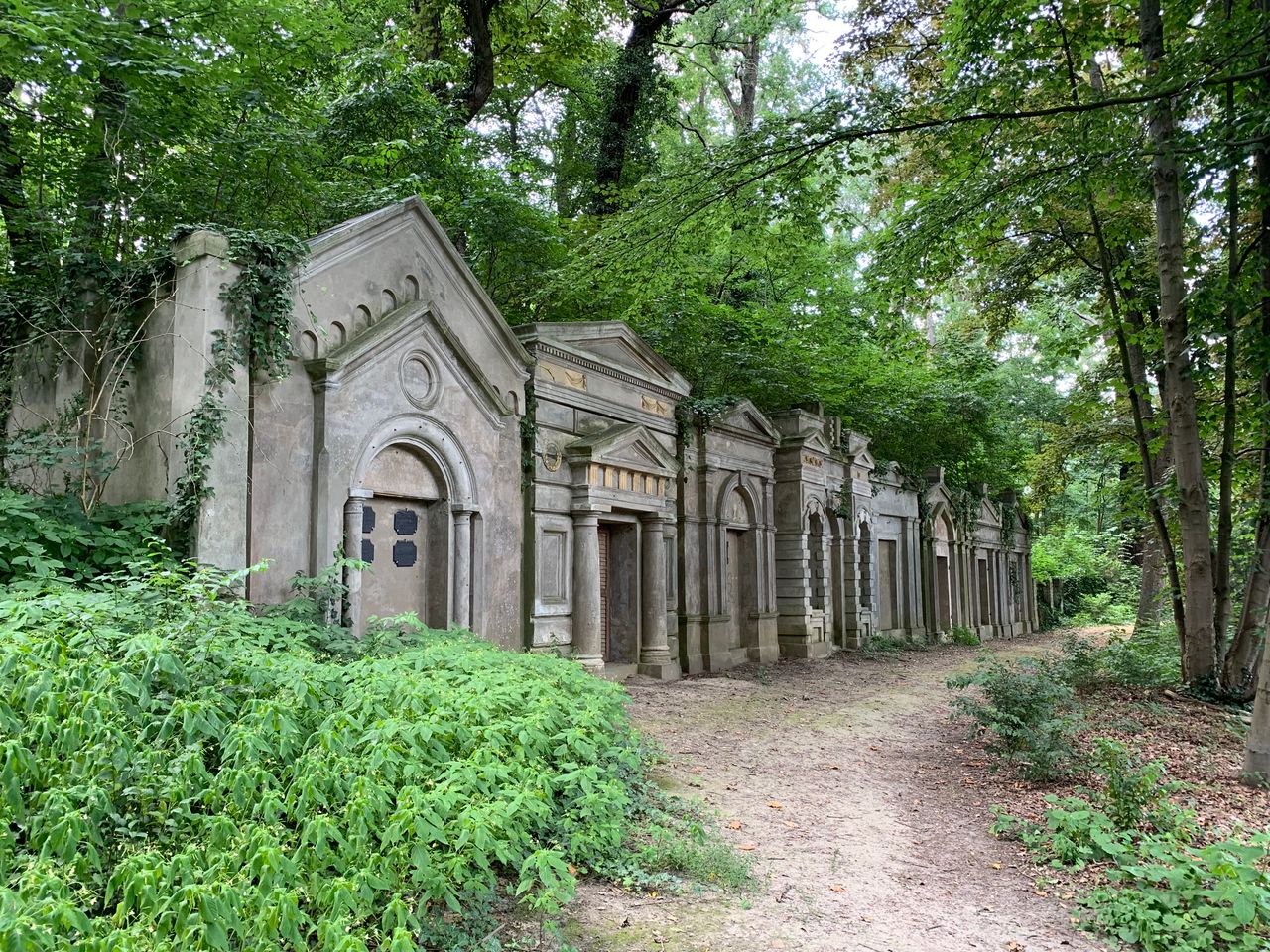 Der Wanderweg führt vorbei an Gruften und am Martinsturm. Der idyllisch Weg wird von Bäumen umrandet.