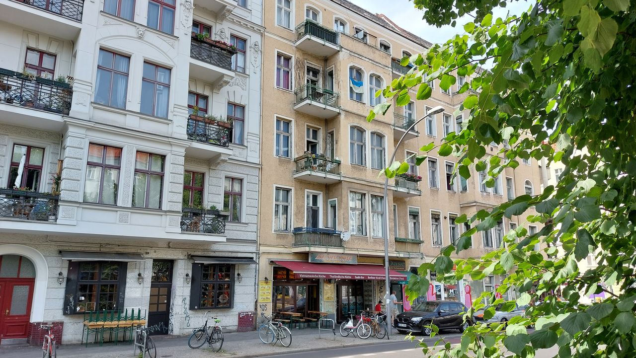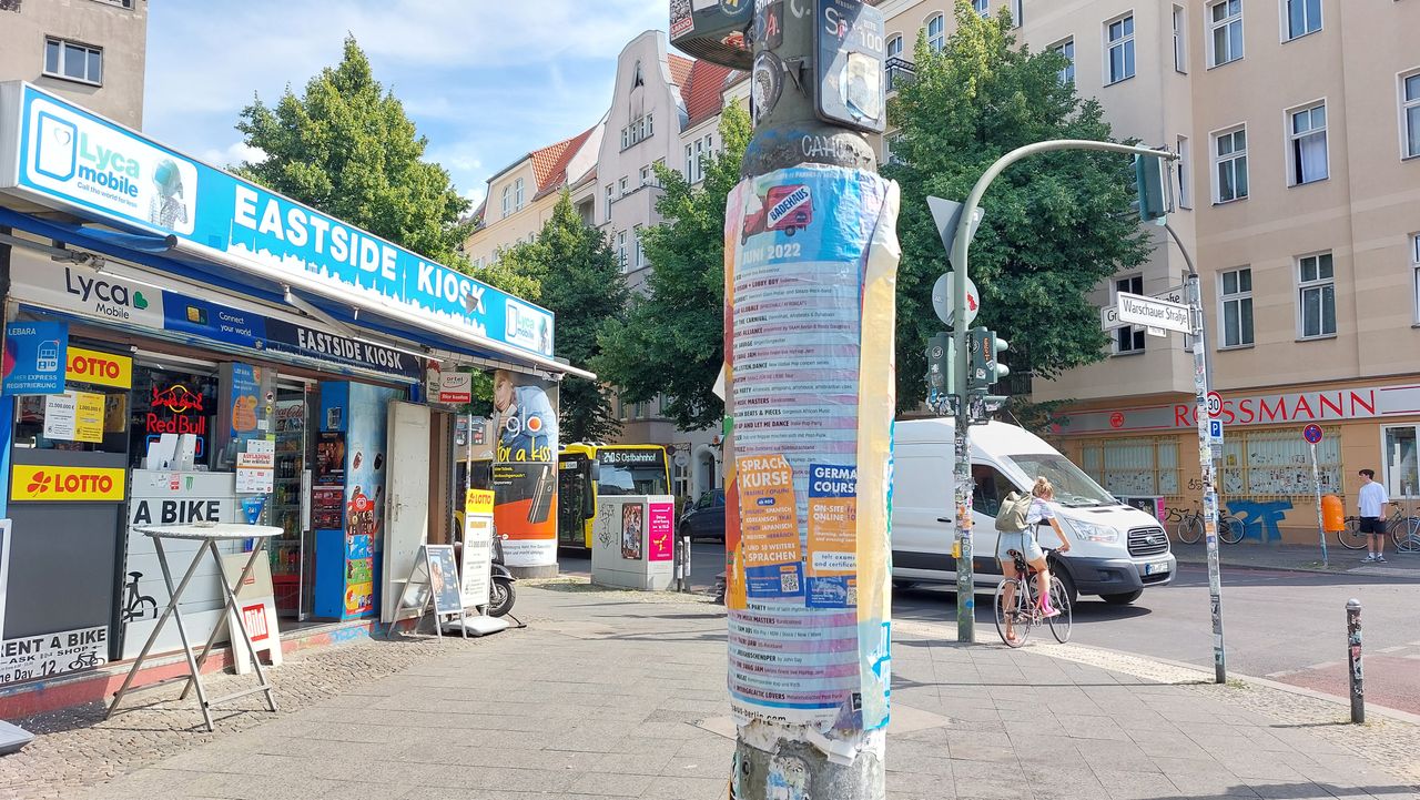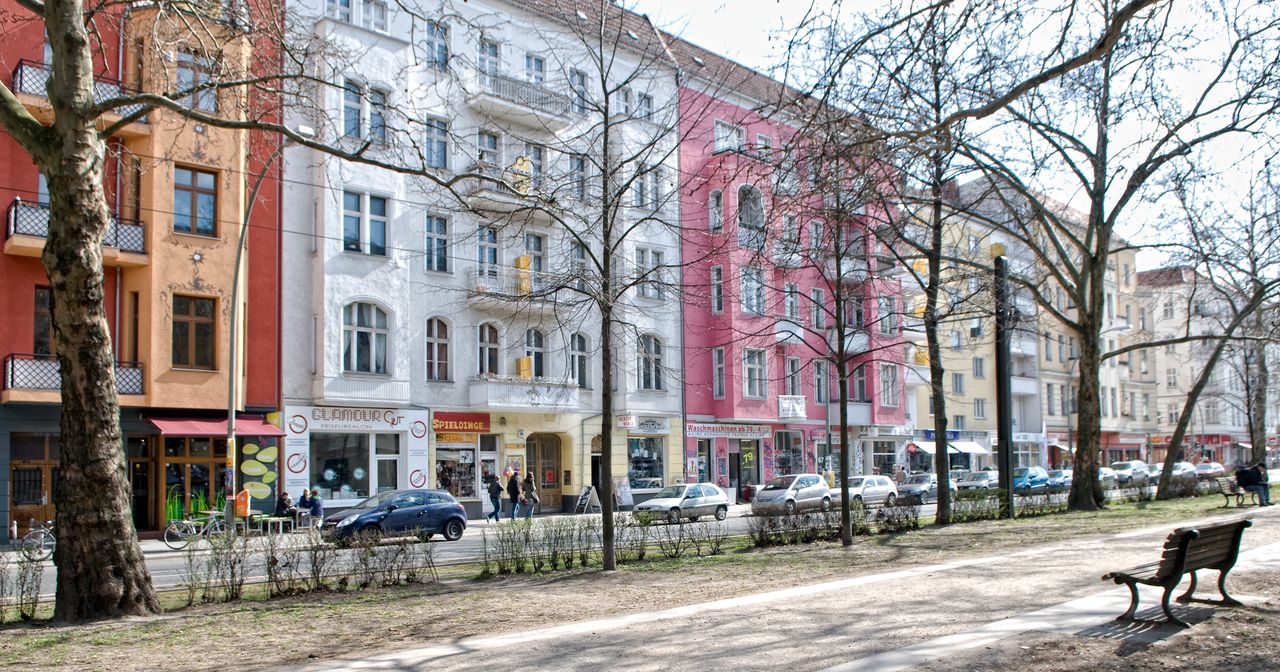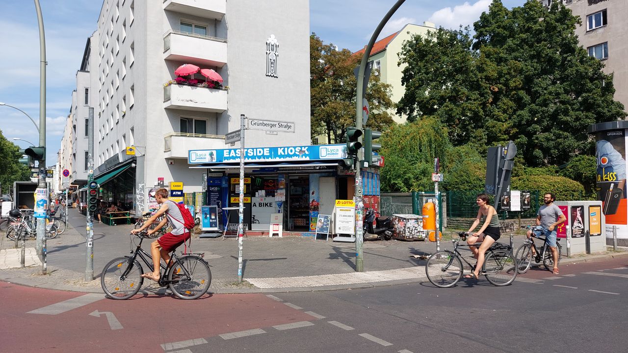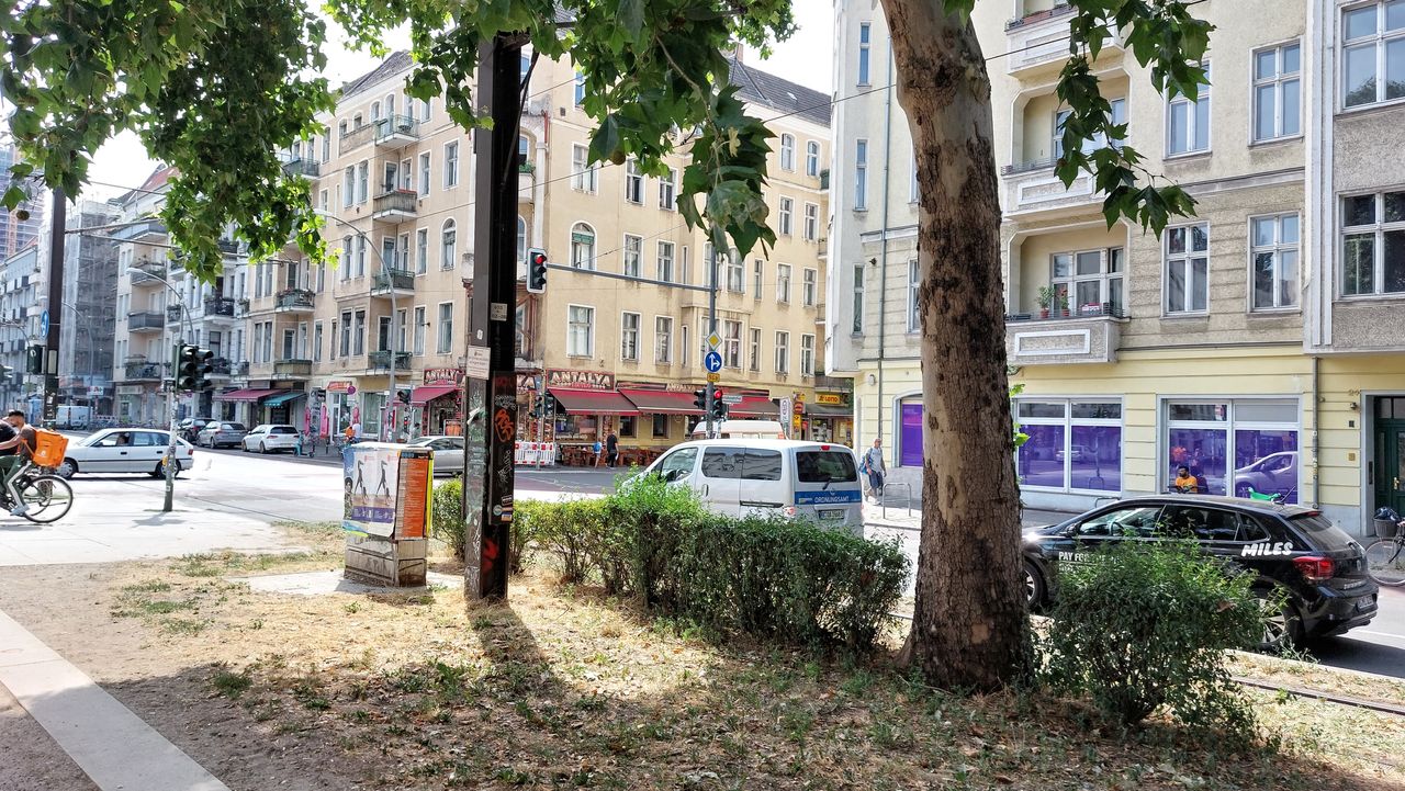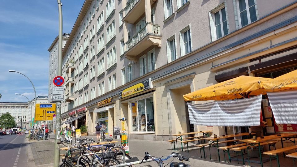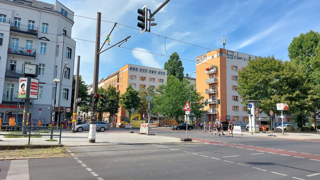 Sehr stark befahrene Straße in Ost-Berlin. Zweispurig mit einer Straßenbahnlinie auf dem Mittelstück. Die Straße ist sehr belebt mit Lebensmittelgeschäften, Cafés und Imbissen.