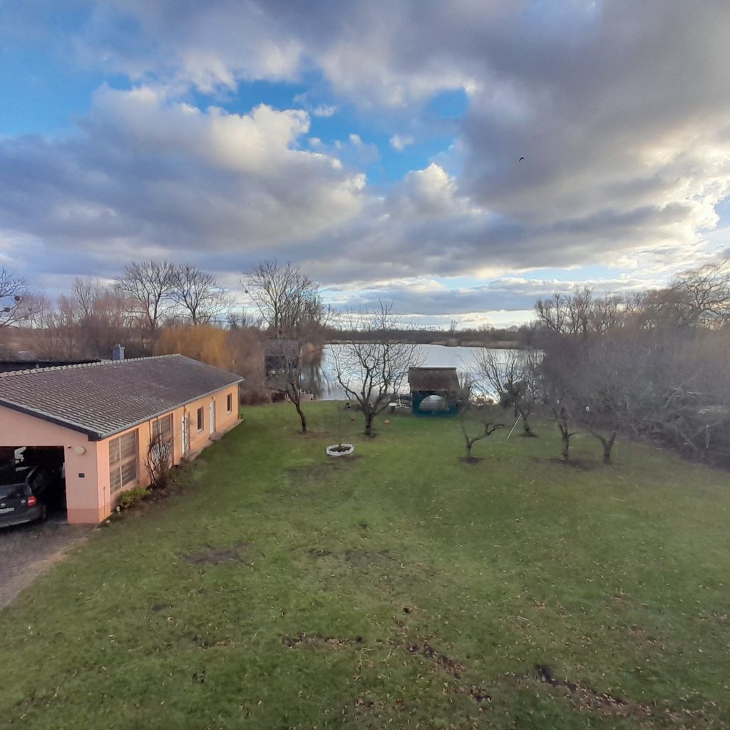Es handelt sich um ein Wassergrundstück in Alleinlage mit 18000 m2 eigener Seefläche und 5000 m2 Grundstück. Auf dem Grundstück befindet sich ein Reetdachhaus (Hauptgebäude) mit 100m2 Wohnfläche (4 Zimmer, Küche, 2 Bäder, Keller), ein Gästehaus mit integrierter offener Garage (Wohnfläche ca. 50 qm/Wohnzimmer mit Küche, Schlazimmer, Bad mit Sauna), ein Pfahlhaus auf dem See (ca. 20qm Wohnfläche), einer Scheune (ca. 20 qm) und einem begrünten (Kartoffel)„Bunker“ (ca.6 qm). Ferner befindet sich direkt am Seeufer ein Pavillon (ca. 25 qm) mit großer Feuerstelle und ein Gewächshaus (ca.15 qm). Ein Saunafass mit Liegepodest direkt am Wasser runden das Ambiente ab.