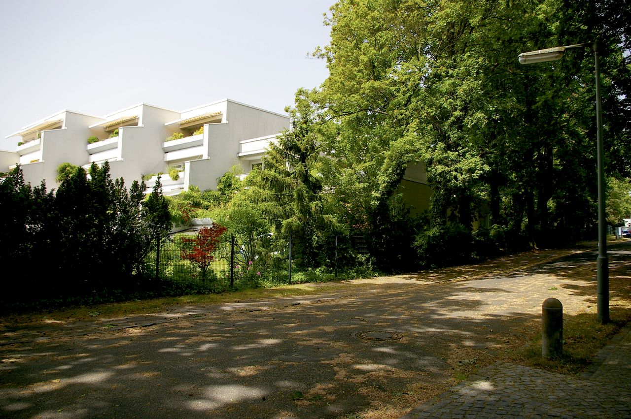 Ruhige, grüne Wohnstraße am kleinen Wannsee mit Uferweg, Blick auf den Kleinen Wannsee